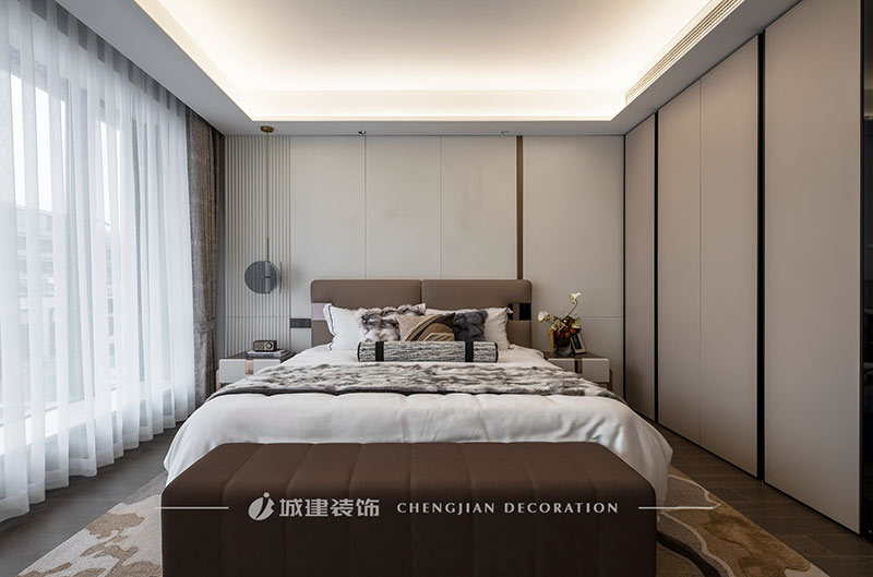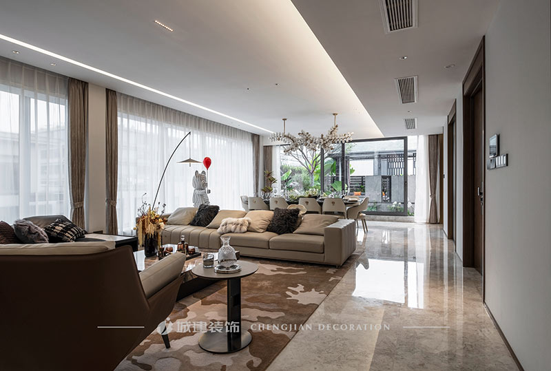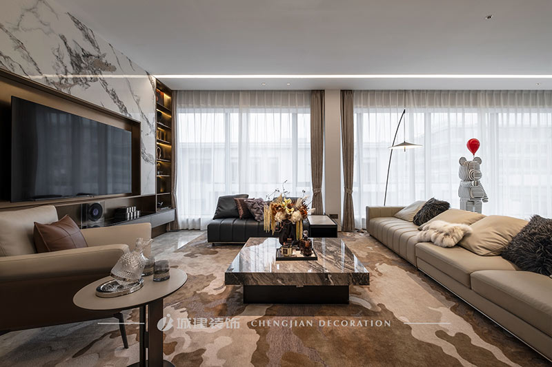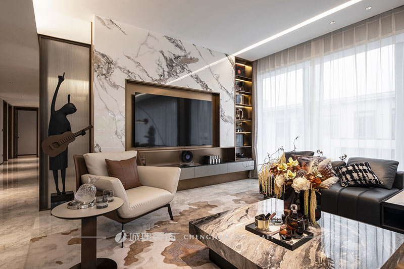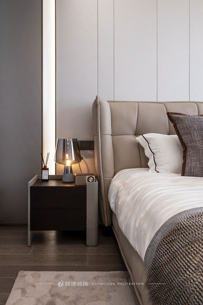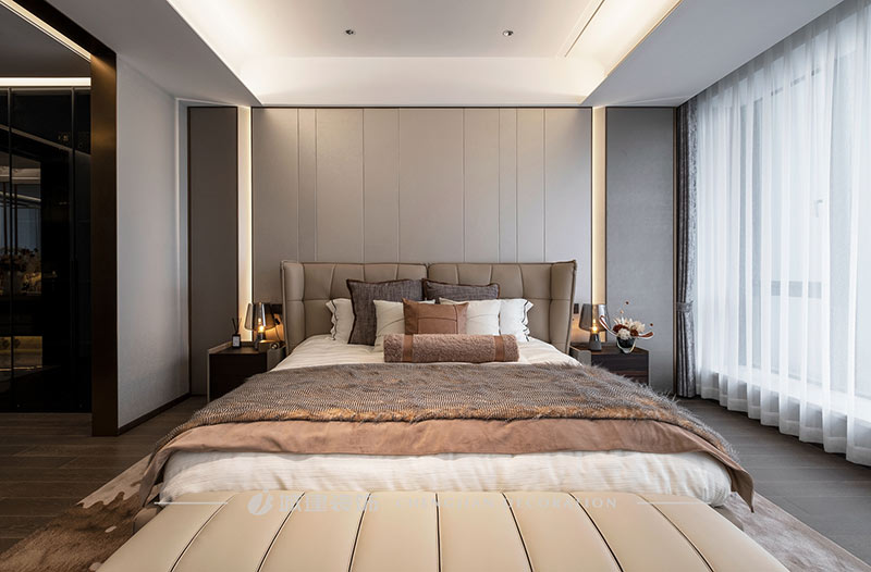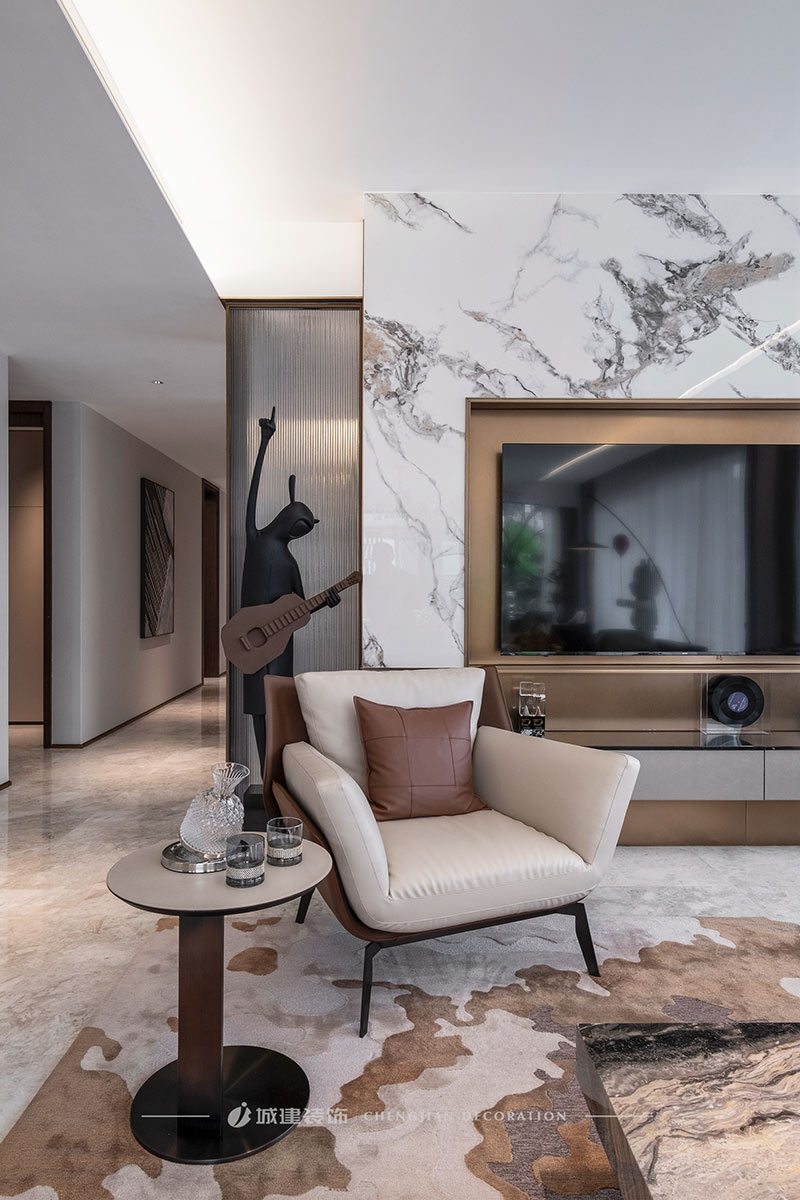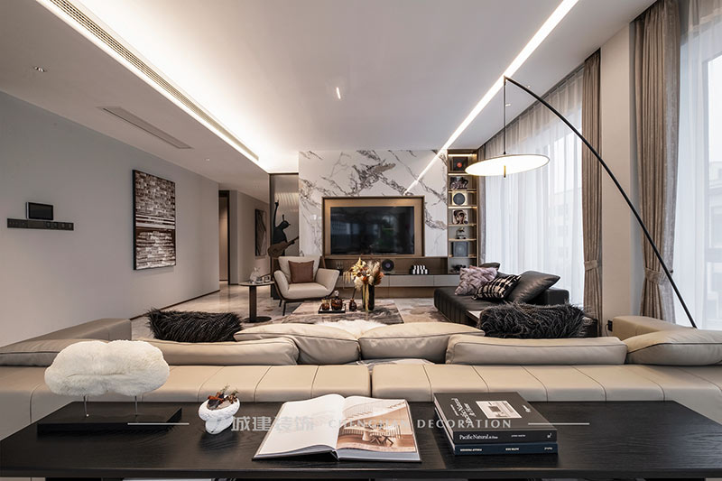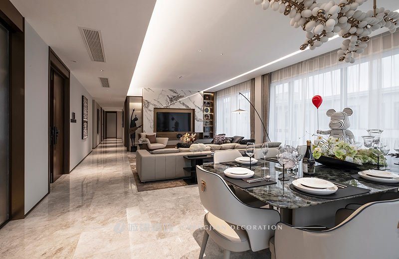 用簡潔的線條、素凈的顏色和高質(zhì)量的材質(zhì)來呈現(xiàn)一個簡約舒適、雅致高級的輕奢大平層。