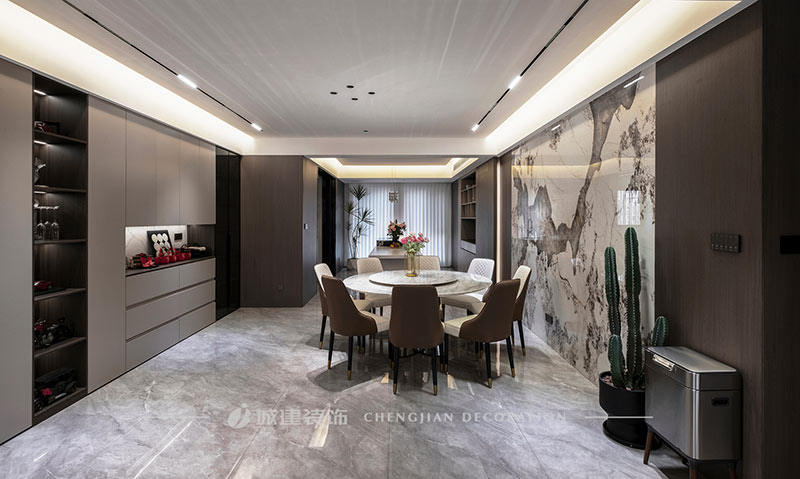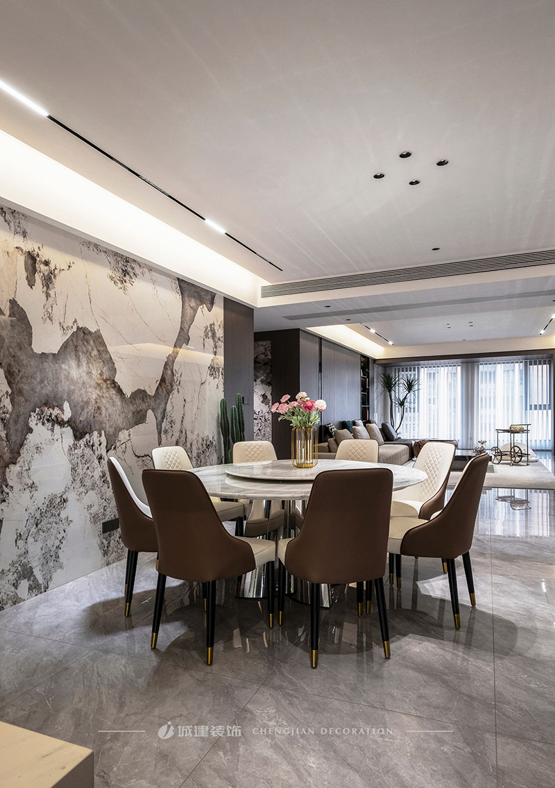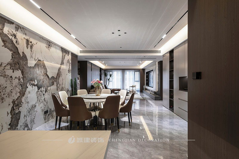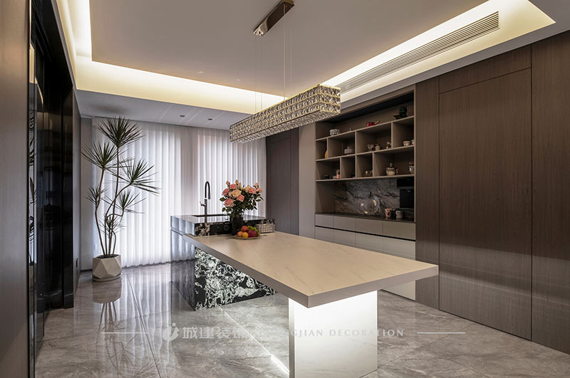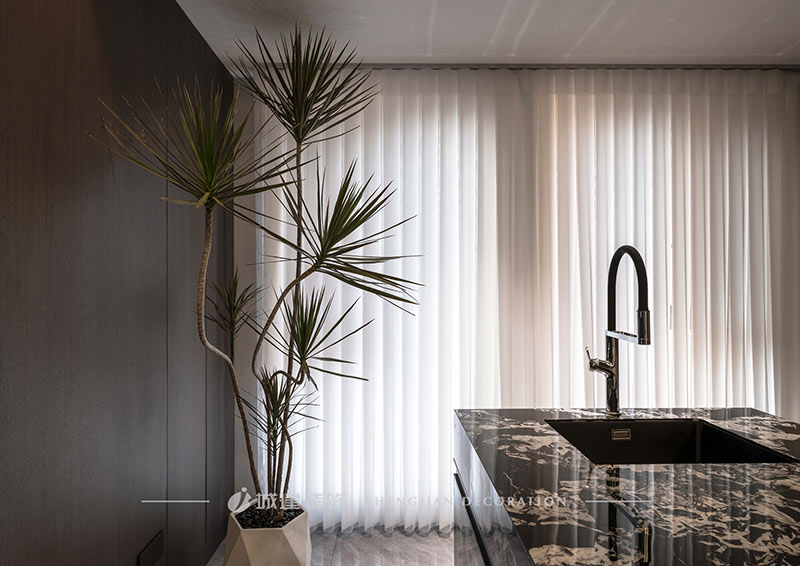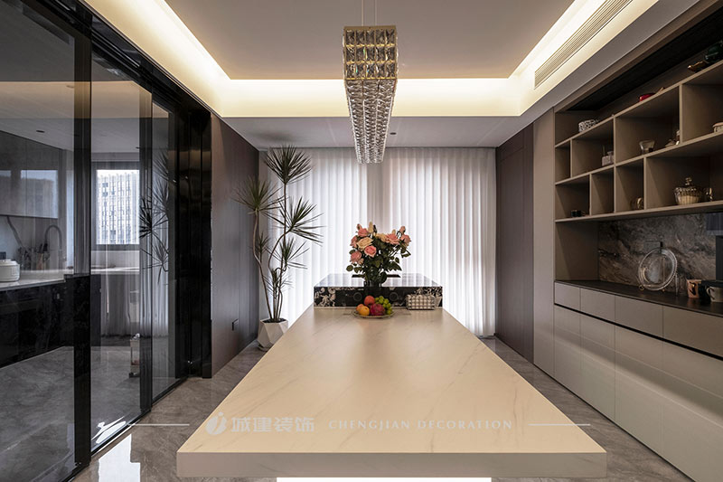客餐廳陽(yáng)臺(tái)打通,南北進(jìn)深延展至18m,無(wú)主燈設(shè)計(jì)不壓層高,空間通透明朗,自由愜意的家居生活由此拉開序幕。