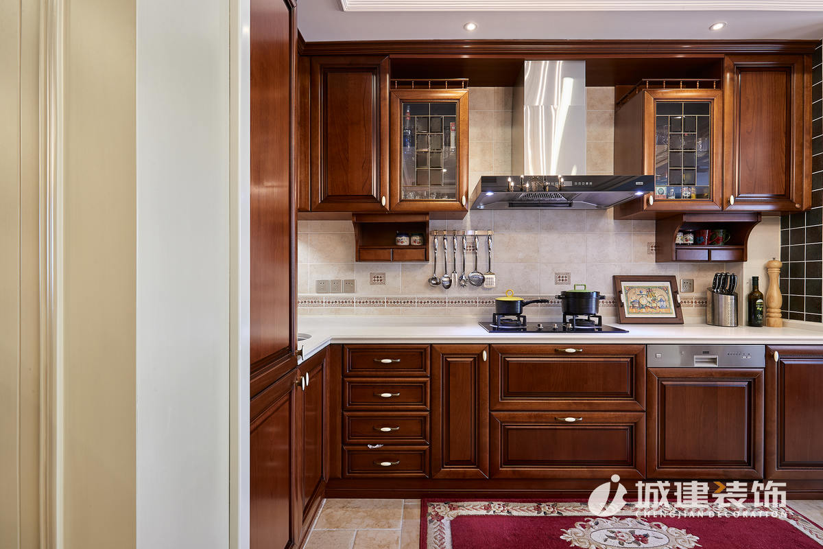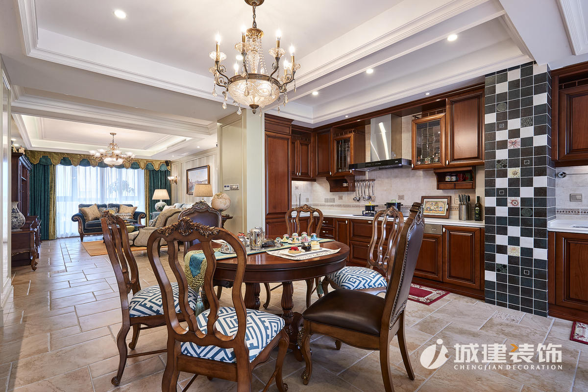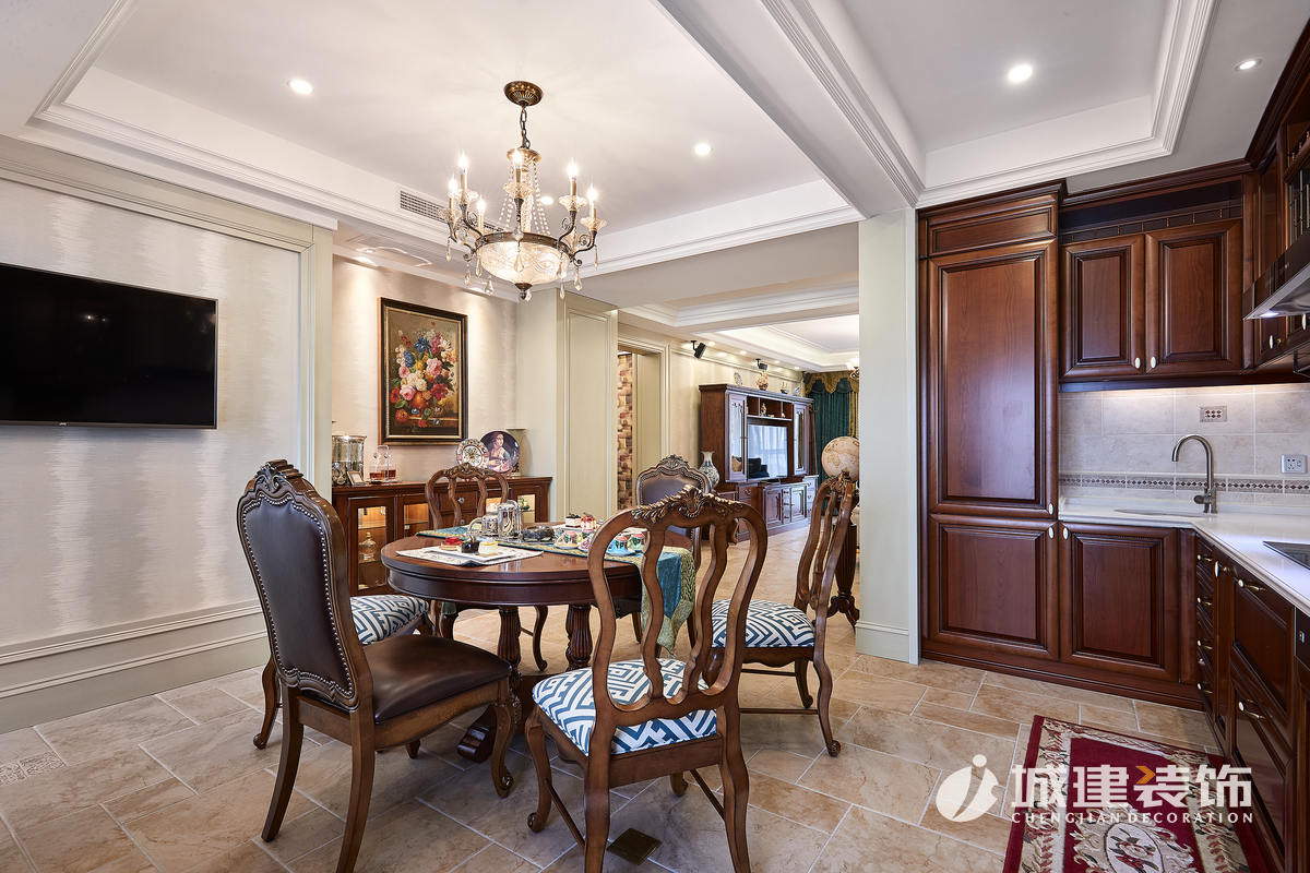 將餐廳與廚房及陽臺區(qū)域原本的隔墻敲掉,在視覺上擴大了整體空間,也加大了采光度。選擇開放式廚房,美式櫥柜,溫馨的圓形餐桌,餐邊柜搭配典雅的油畫,古典浪漫氣息撲面而來,打造嫻靜優(yōu)美的用餐環(huán)境;飄窗前做了吧臺,懸掛的玻璃紅酒杯,閑暇之時,品品紅酒,享受生活。