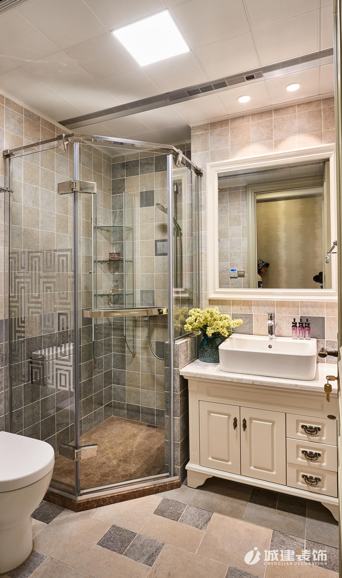 主衛(wèi)采用大方塊淺色花紋地磚,配以同色系墻磚,優(yōu)美典雅;客衛(wèi)采用小方磚,不同色塊拼接,簡單利落。