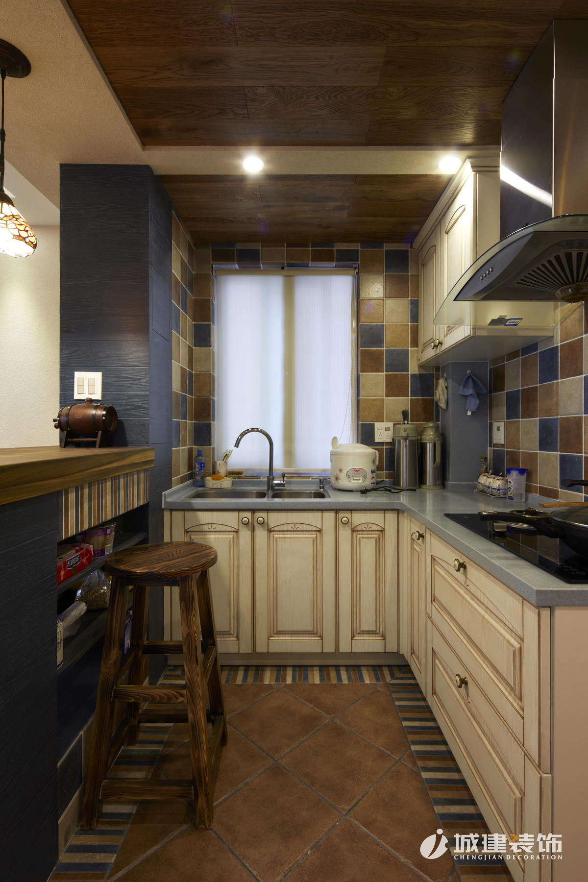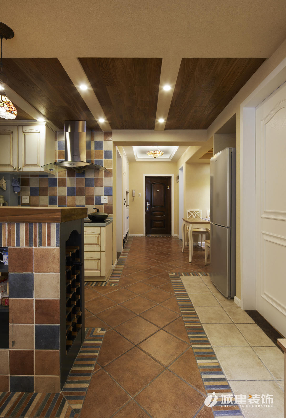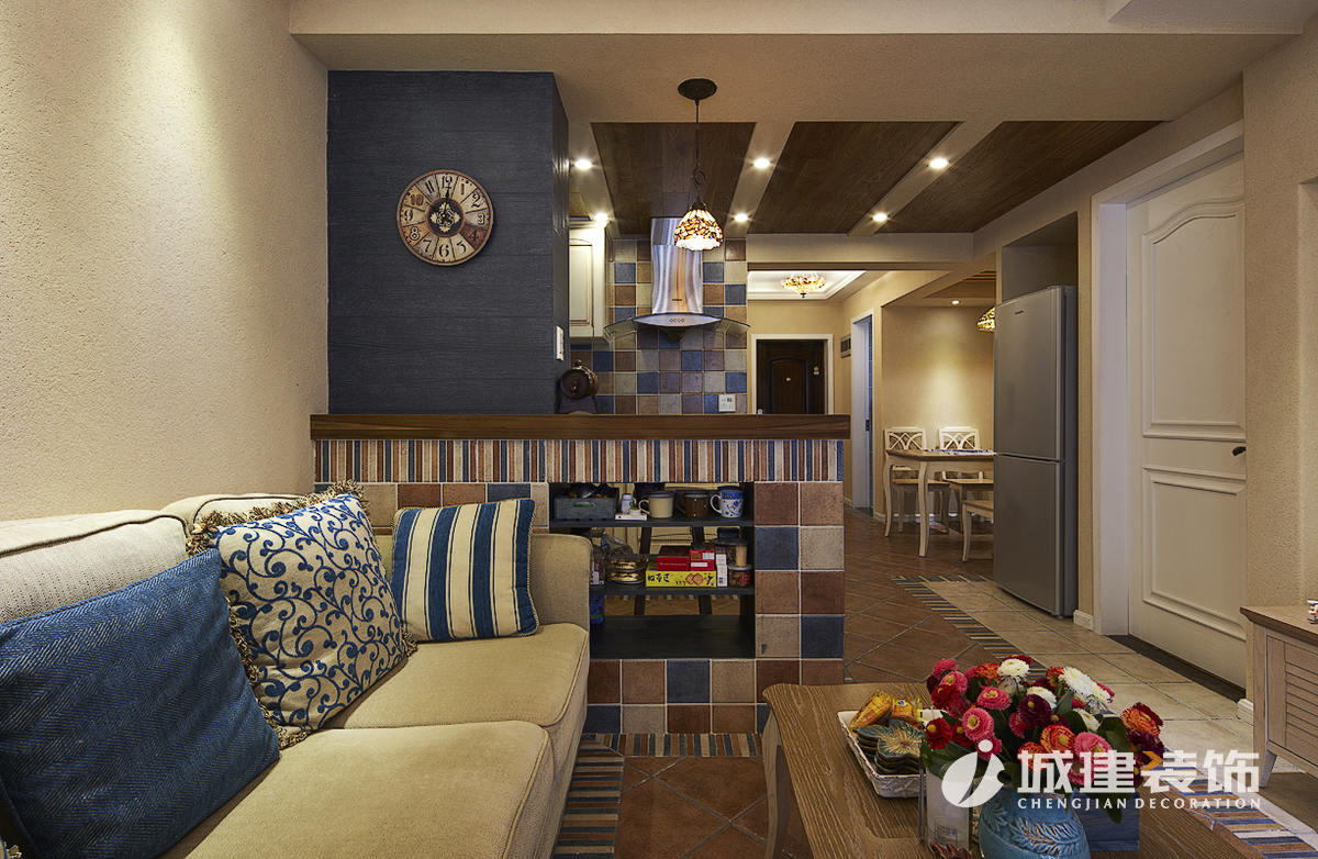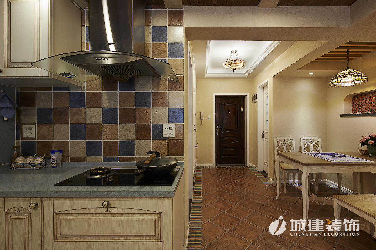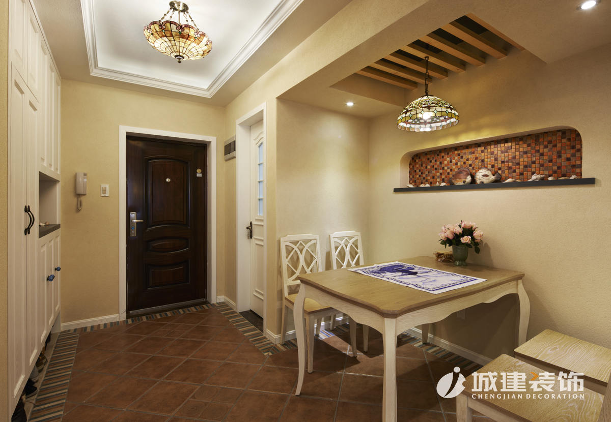 因?yàn)榇竺娣e使用硅藻泥,區(qū)別于一般地中海風(fēng)味的白藍(lán)色調(diào),本案以米色為主基調(diào),仿若海邊沙灘,多處運(yùn)用木質(zhì)結(jié)構(gòu)的原始風(fēng)味,地面采用多種仿古磚的拼接,再配以地中海風(fēng)的燈具進(jìn)行點(diǎn)綴,達(dá)到畫(huà)龍點(diǎn)晴的效果,處處體現(xiàn)著家的溫馨舒適。