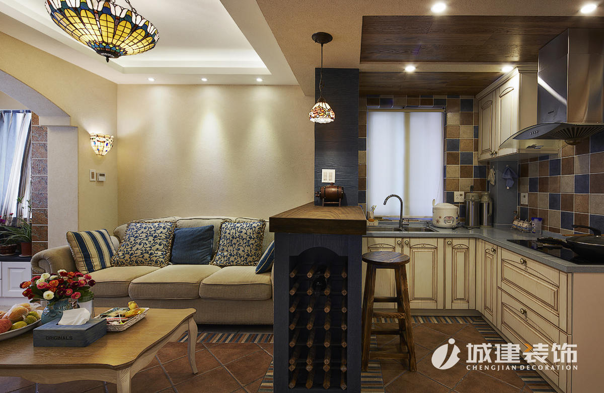 入戶右手邊經(jīng)設(shè)計(jì)改為次臥,頂天立地的大儲(chǔ)物柜是小戶裝修的福音,左手邊衛(wèi)浴間與主臥地走道間隔出了餐廳一角。敞開(kāi)式廚房無(wú)論從視覺(jué)性還是使用性來(lái)看,空間都變得寬敞明亮了許多,吧臺(tái)式紅酒柜也獨(dú)具風(fēng)味。連接客廳與陽(yáng)臺(tái)間的拱型與電視背景墻強(qiáng)烈呼應(yīng),形成地中海風(fēng)味的標(biāo)志物。陽(yáng)臺(tái)兩側(cè)分做儲(chǔ)物柜,配上業(yè)主自己種的花草,不失為溫馨舒適的休閑一隅。