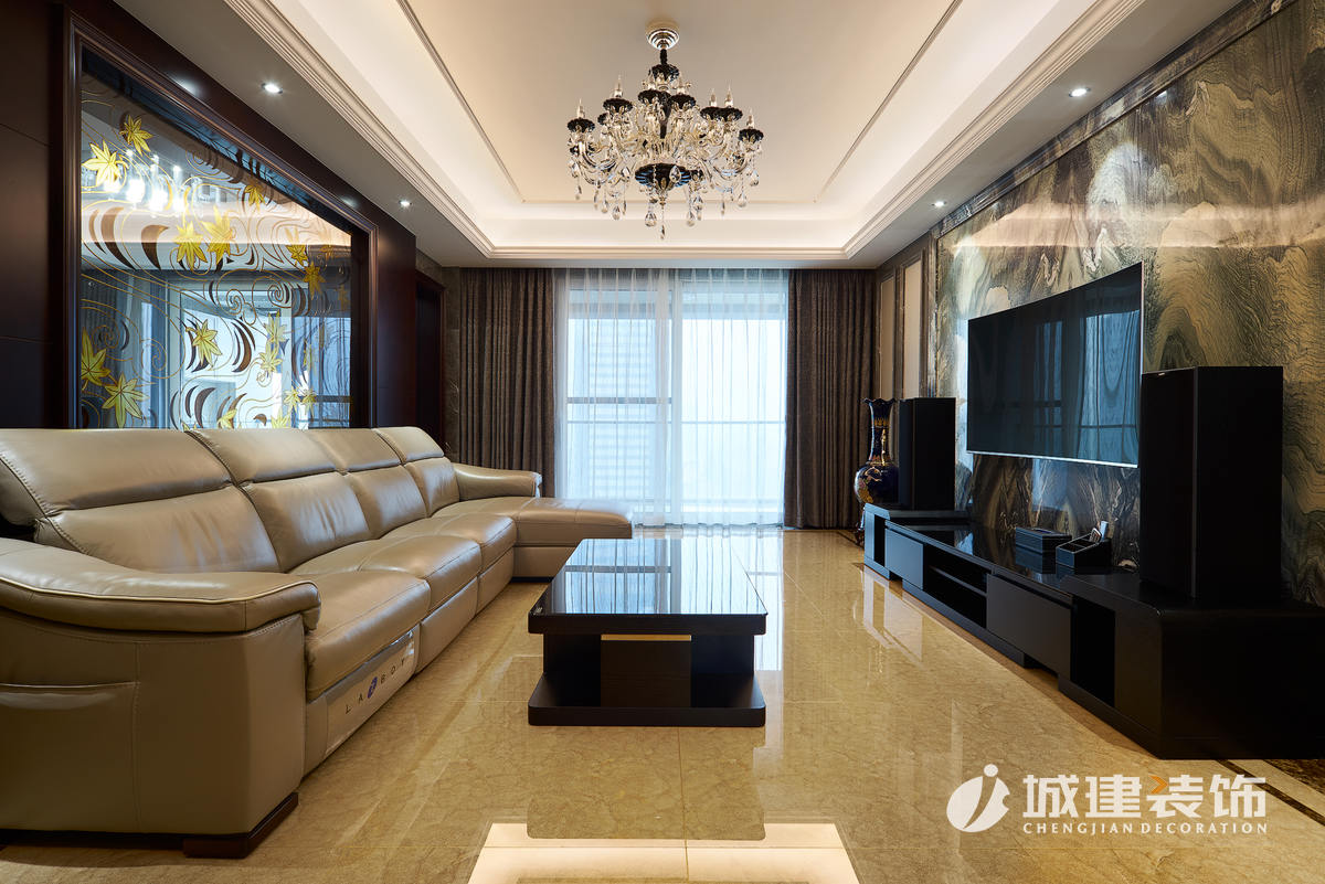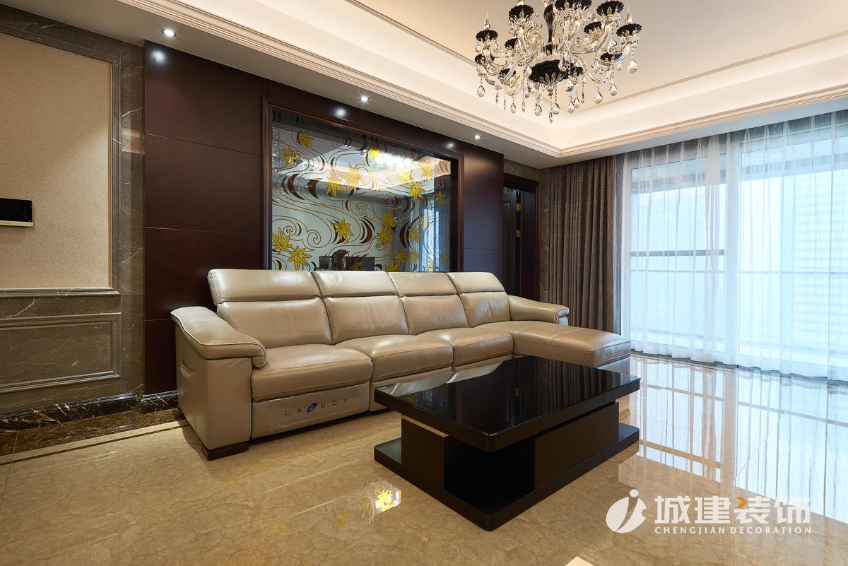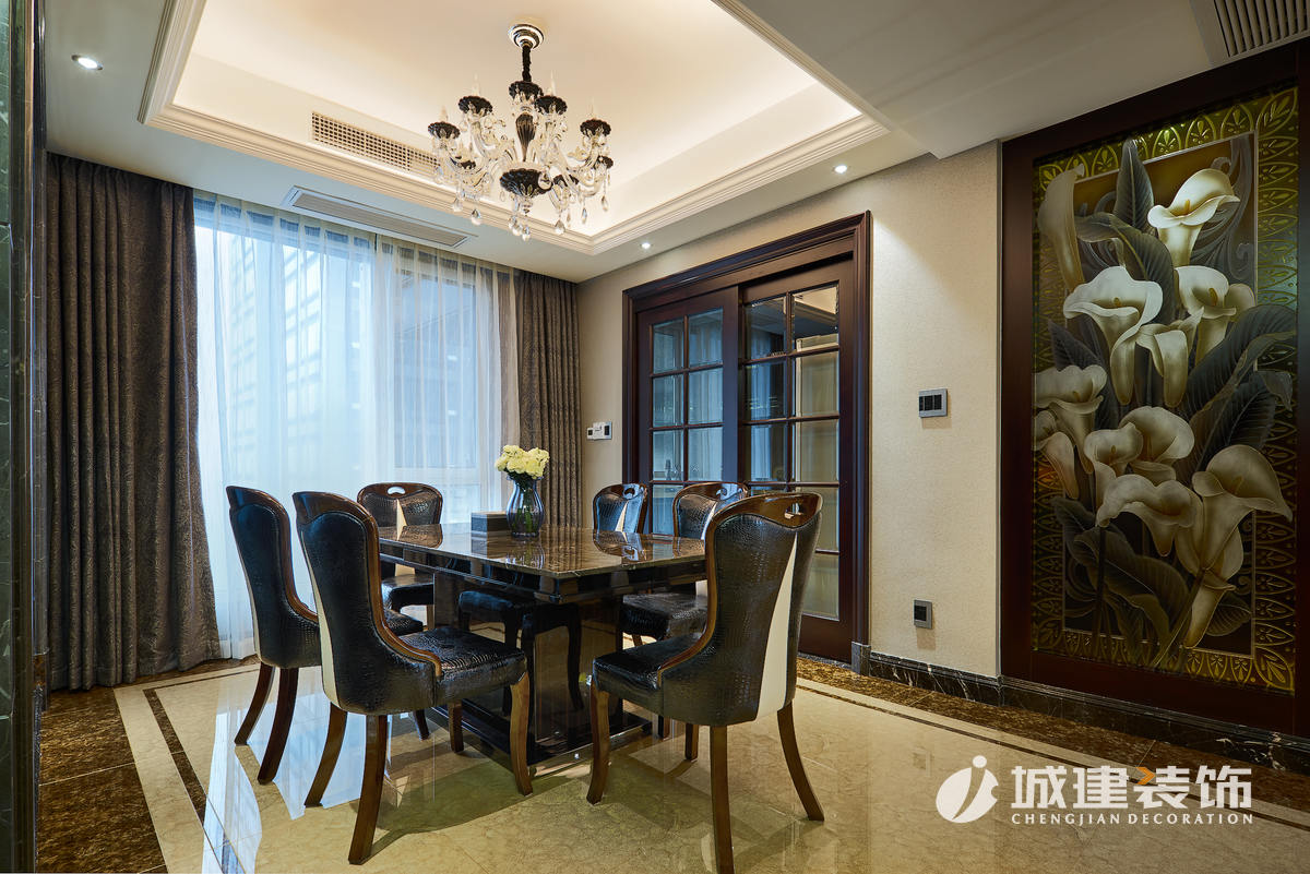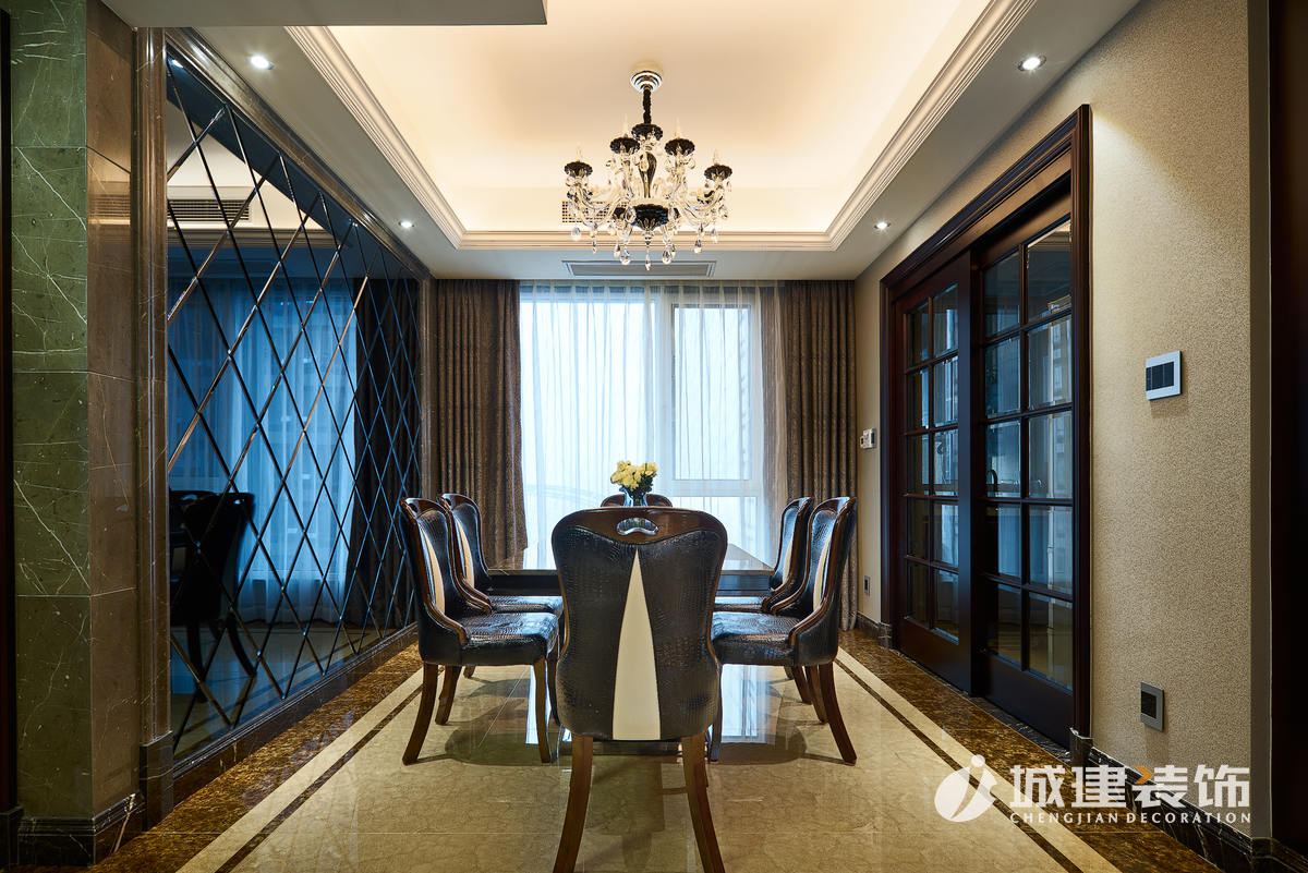 原客餐廳位于一線,一個區(qū)域劃分出兩塊功能區(qū)域,顯得過于擁擠,經(jīng)再三考慮后,放棄了毗鄰廚房的一室,直接設(shè)計成餐廳區(qū)域,臨窗落成擴大了餐廳的視野,客廳也因此擴大??筒蛷d做為公共區(qū)域,通過石材的鋪設(shè)運用,沒有過多的花哨裝飾,兩個區(qū)域都體現(xiàn)出了戶主的干練穩(wěn)重。