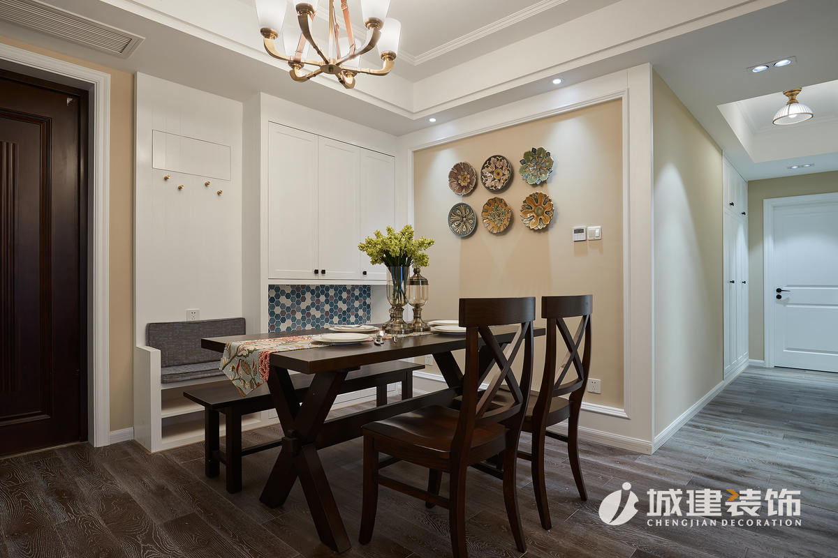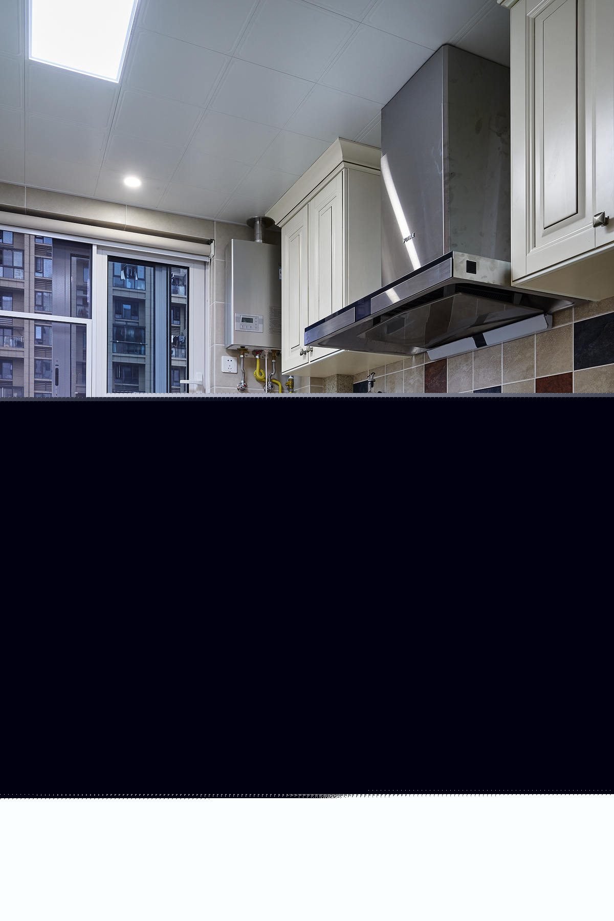 廚房美式feel,乳白色的櫥柜,復古的花色拼磚;