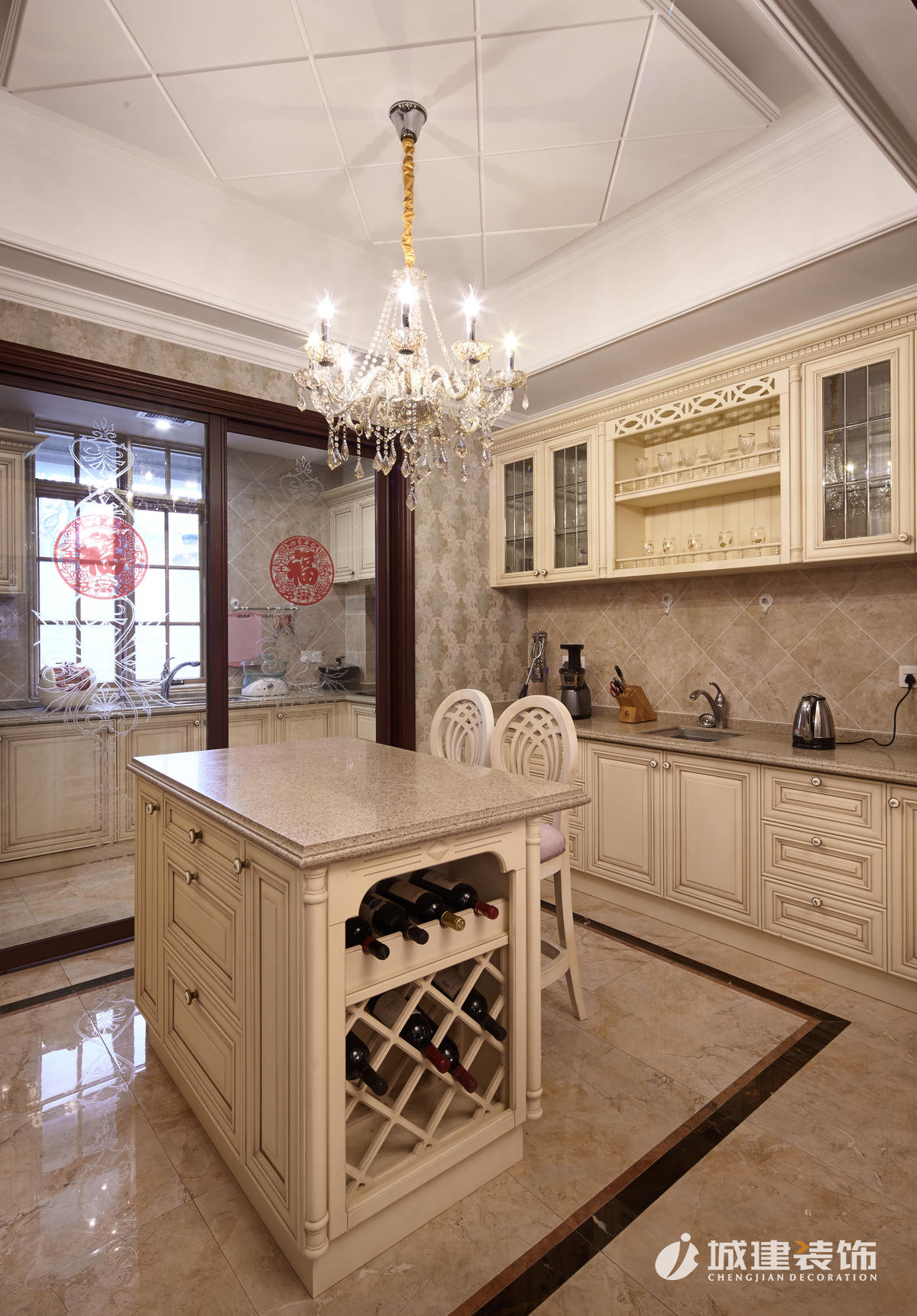 與客廳相連是餐廳。圓形餐桌放置在銅式大吊燈正下方。挑空的層高,上層弧形的窗戶成了餐廳最大的亮點(diǎn)。吧臺(tái)側(cè)面是酒柜是設(shè)計(jì)師的一個(gè)巧思,不僅利用了柜體空間,就餐時(shí)拿酒也很方便。中西分廚的做法方便了日常生活。