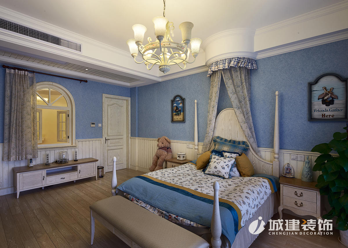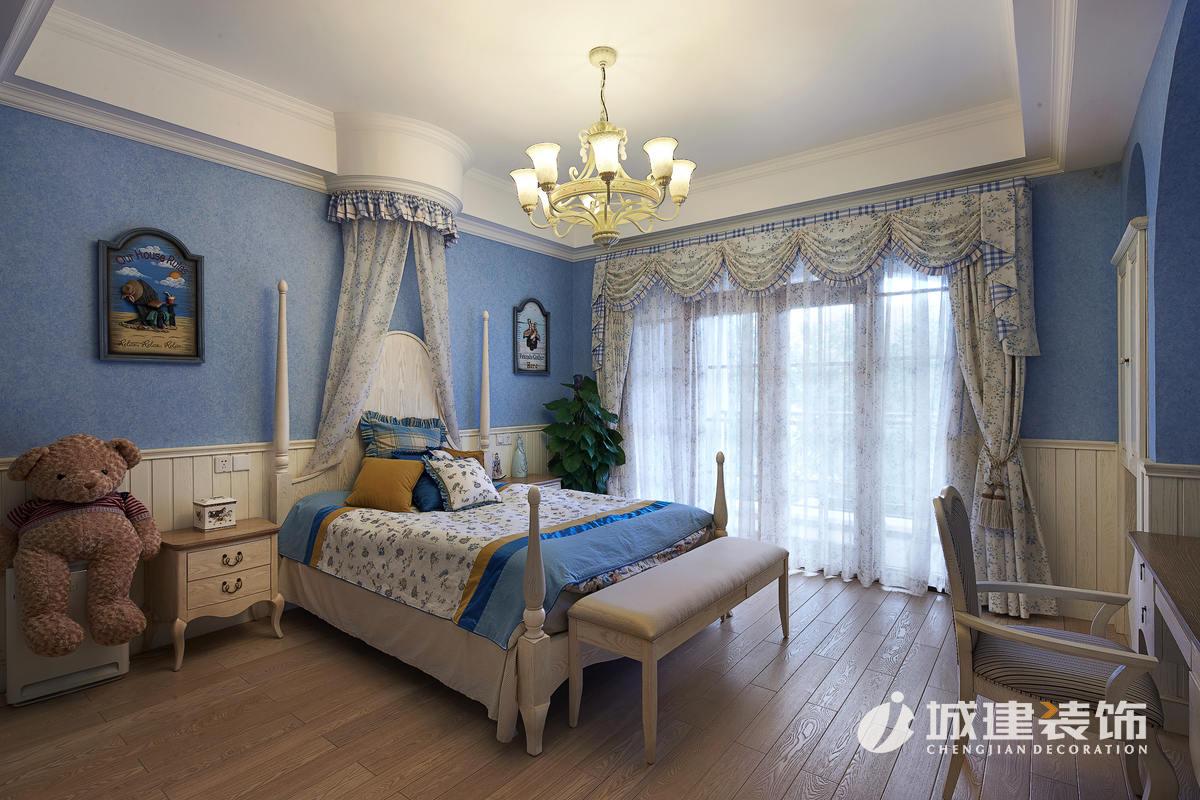 二樓是主臥與女兒房。主臥的深色地板家具和深色軟包床背景,搭配上淺色的墻紙窗簾。整個(gè)空間安靜沉穩(wěn)。女兒房則滿足了小女孩從小對(duì)公主屋的幻想,白色護(hù)墻與藍(lán)色墻紙的空間,床頭的蔓美式的床使人仿佛進(jìn)了迪斯尼公主的寢室。