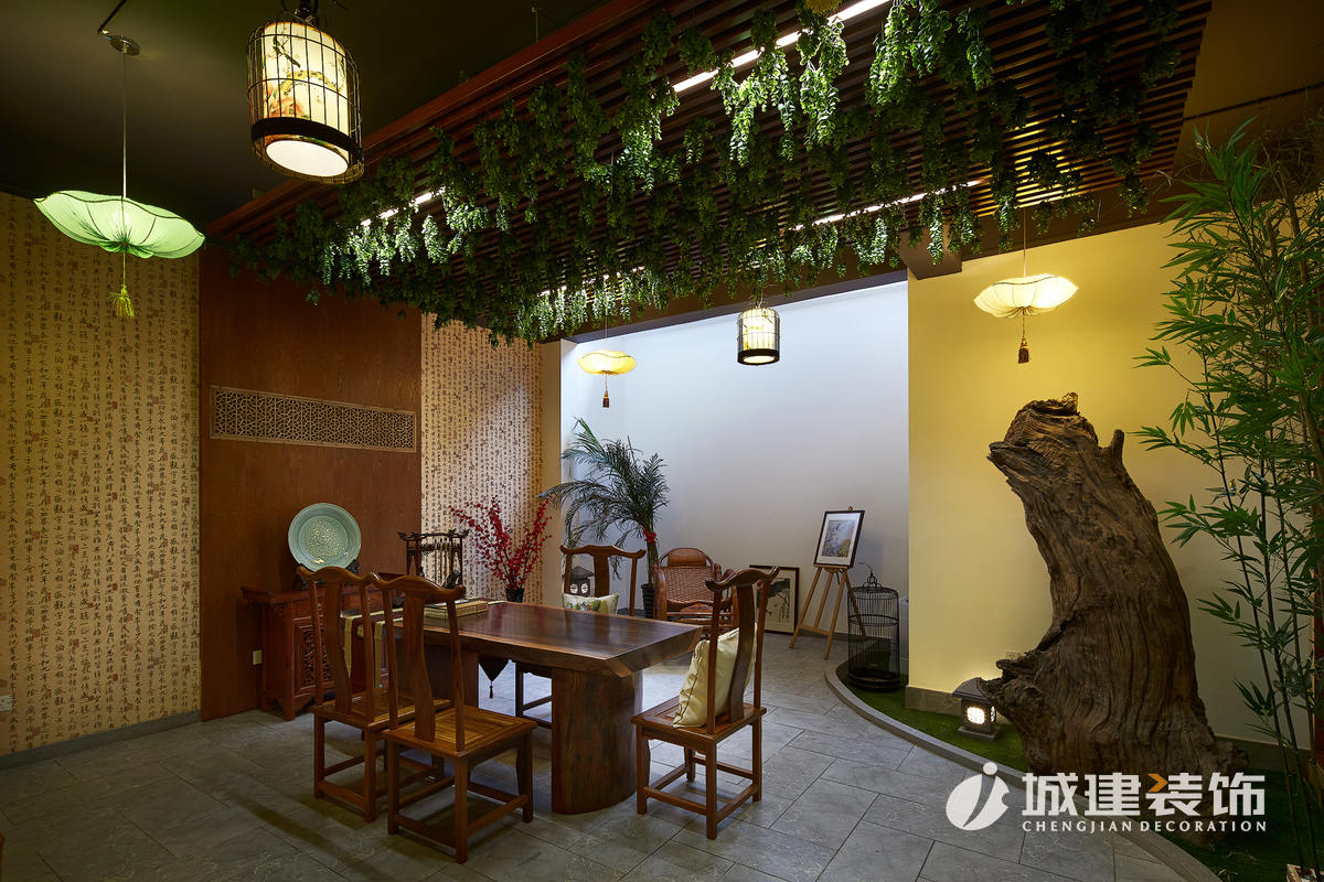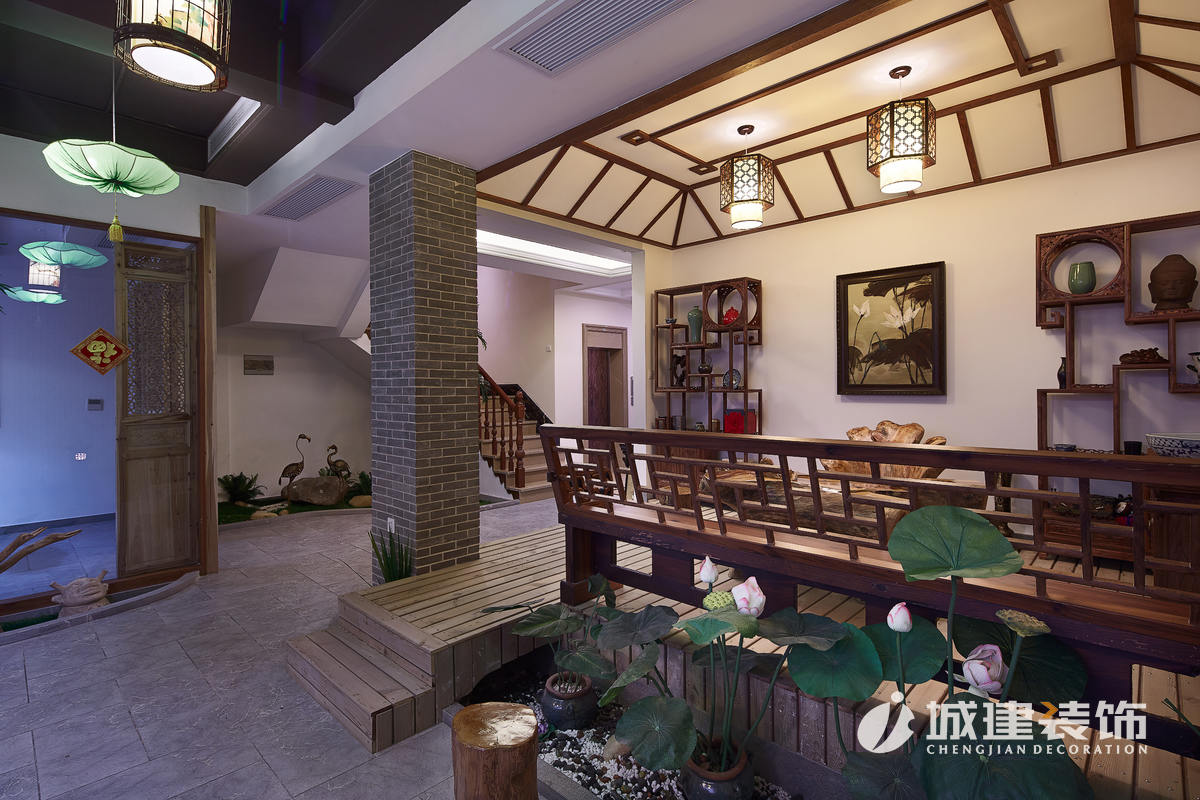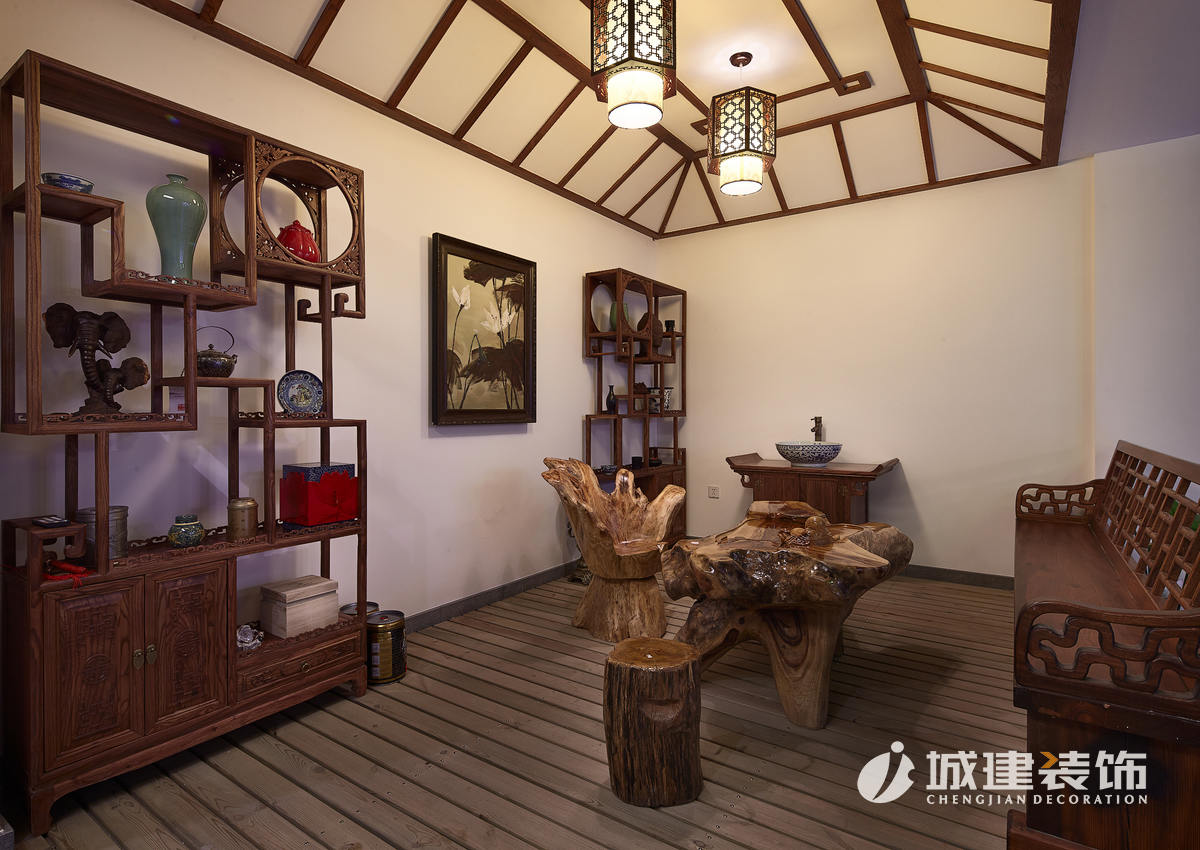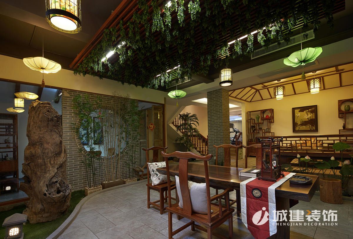 地下室是主人日常休閑的地方。與樓上美式風(fēng)格不同的是這是整個(gè)中式園林的空間。走進(jìn)地下室你會(huì)以為走進(jìn)哪家茶坊,假山綠竹文化石松木是茶室的標(biāo)配。樓梯下的景觀臺(tái)使整個(gè)空間靈動(dòng)起來。讓人身心舒暢。置身于此不免想起一句詞:靜聞天籟擬鳴佩,醉折荷花想艷妝。包間內(nèi)是棋牌室,包間外是主人接待賓客,聊天的場(chǎng)所。另一邊還放著健身器材,滿足了主人休閑娛樂健身為一體的要求。