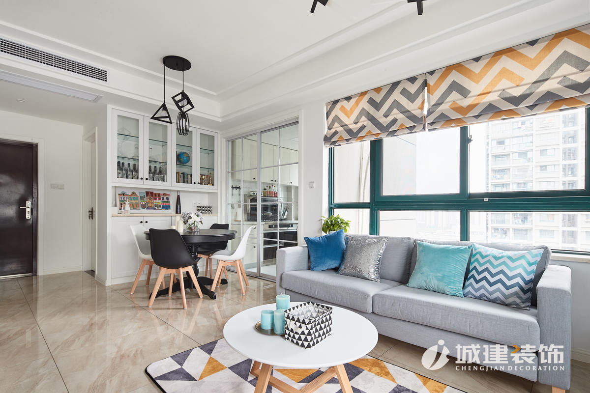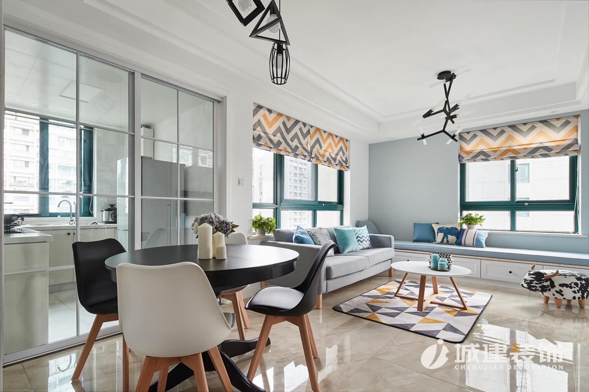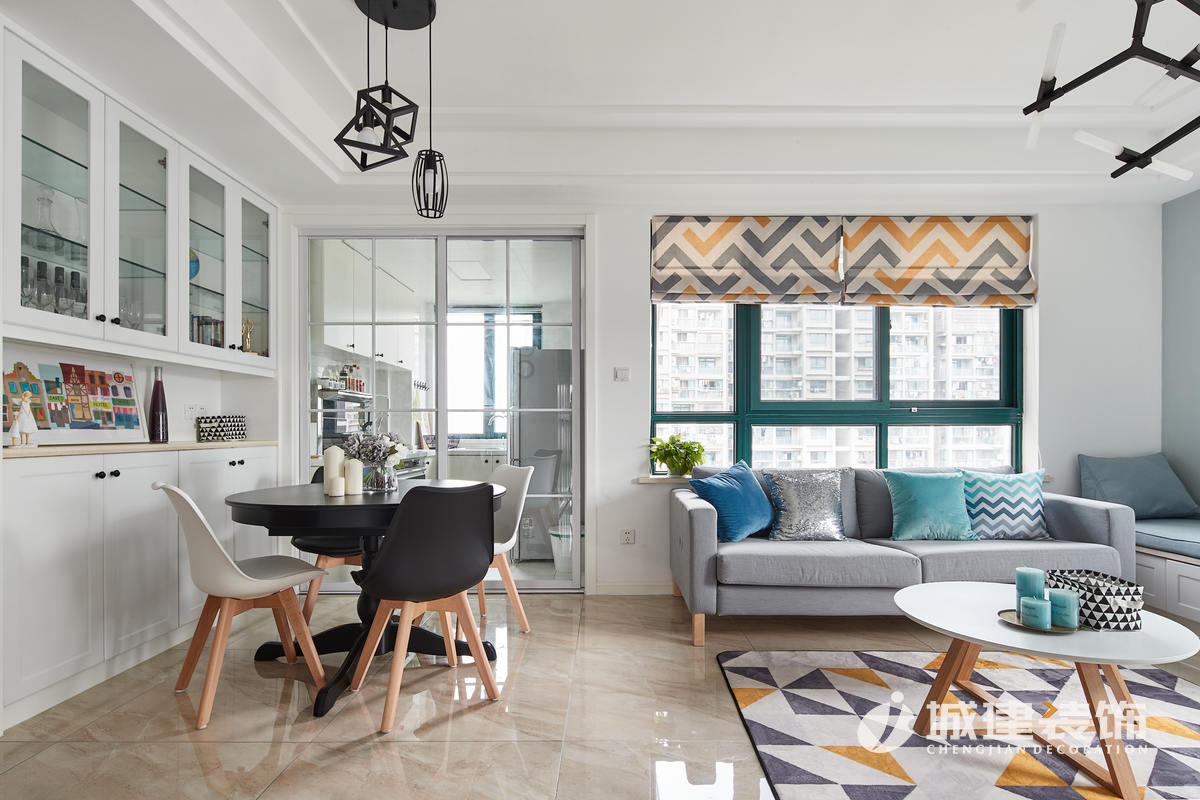 開門進去,入目的就是連成一線的【客餐廳】,客廳兩處窗戶,本身采光就極佳。為了不破壞整個空間的明亮性,只在一側設計了儲物柜式卡座,另一側則剛好放下沙發(fā)。