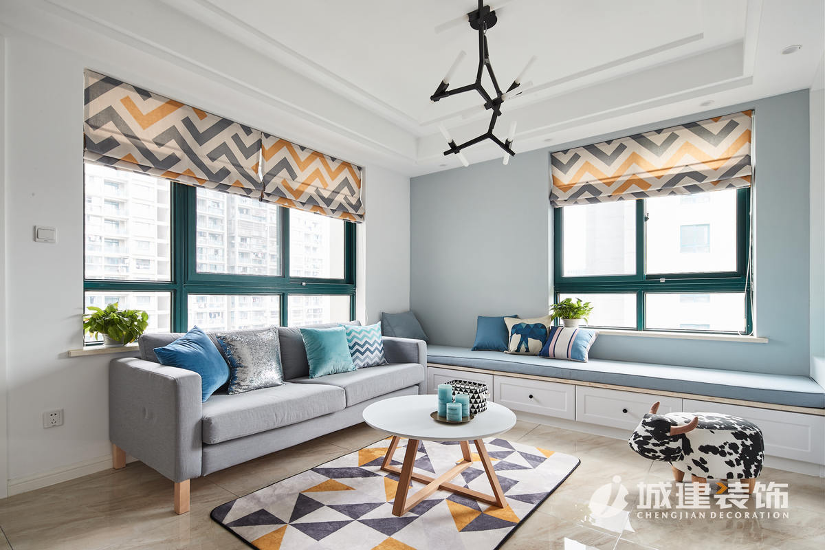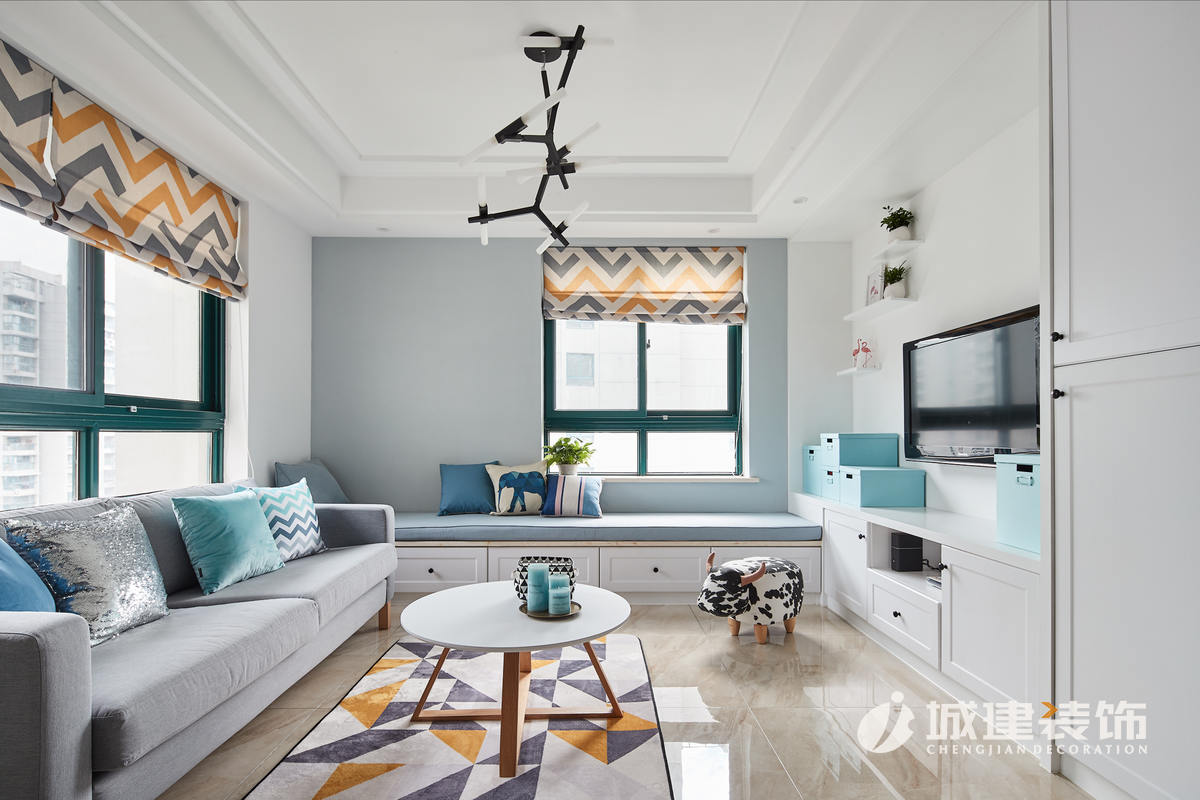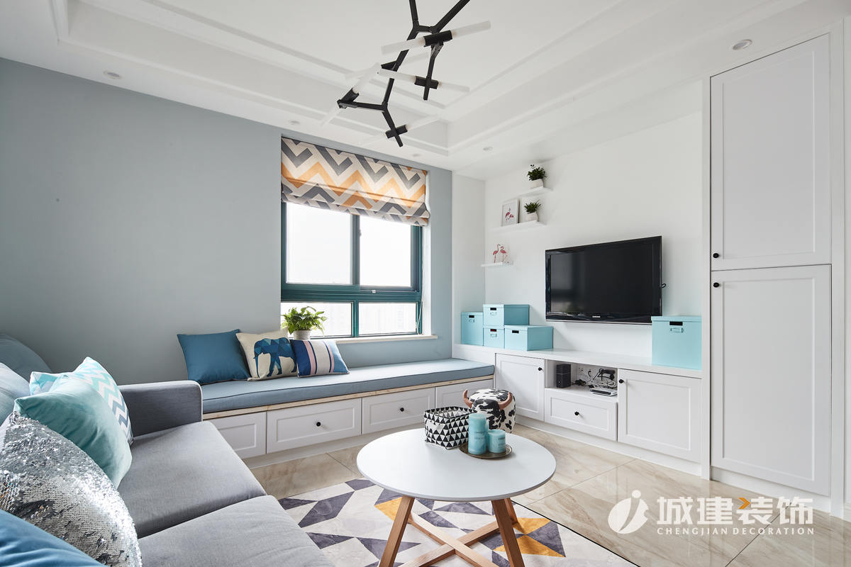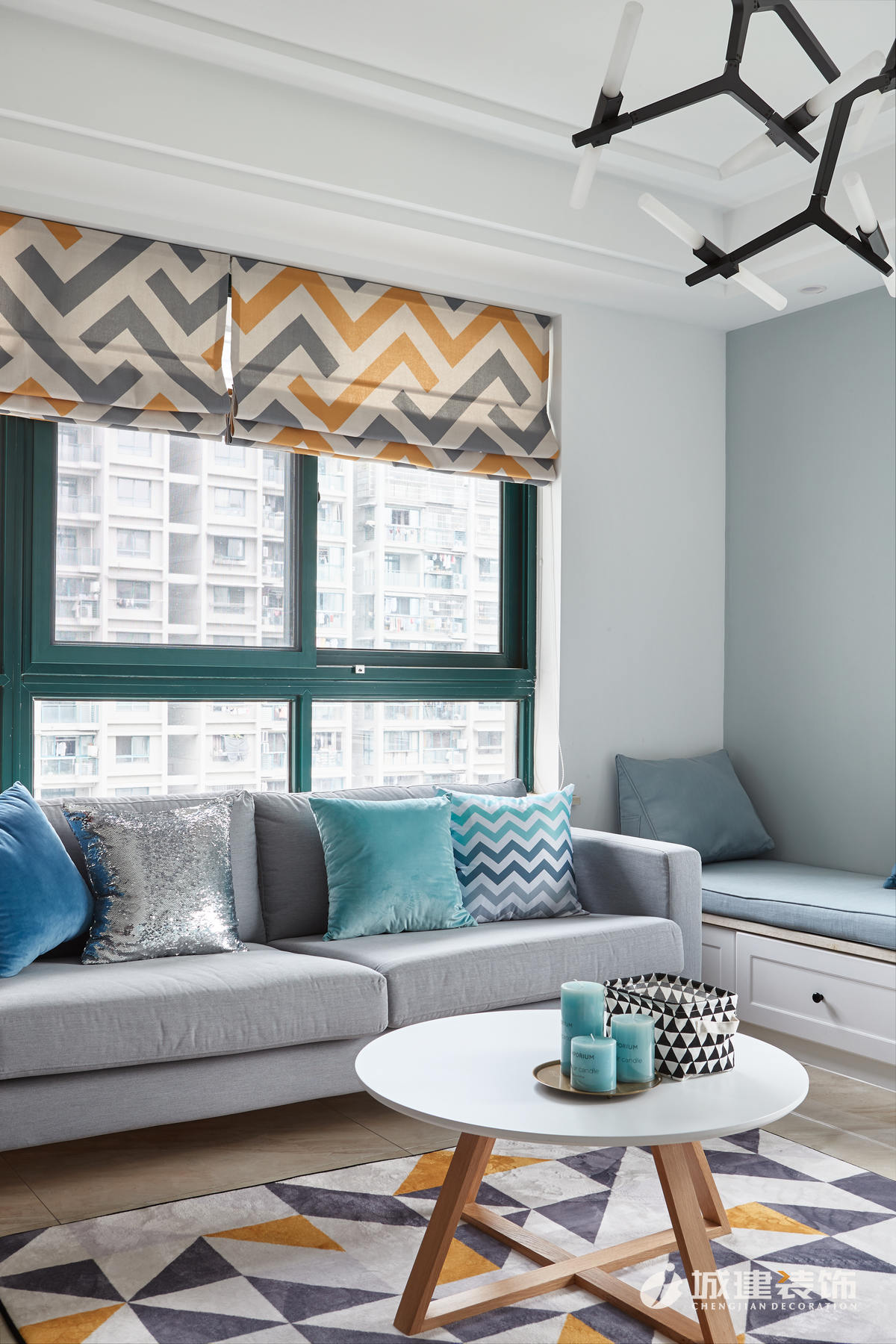 開門進去,入目的就是連成一線的【客餐廳】,客廳兩處窗戶,本身采光就極佳。為了不破壞整個空間的明亮性,只在一側設計了儲物柜式卡座,另一側則剛好放下沙發(fā)。