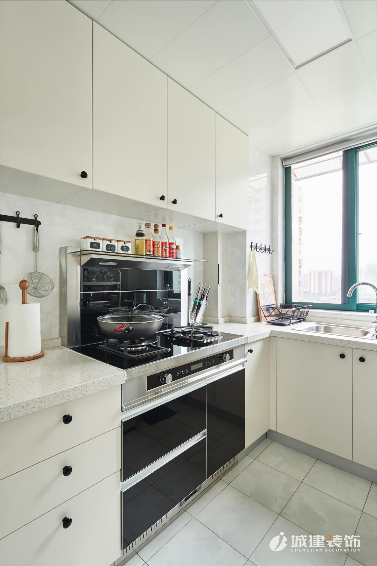 廚房的配色也是比較簡潔明快,白色櫥柜搭配白色地磚,沒有太大的視覺對比,但是會更加的整體,不凌亂。