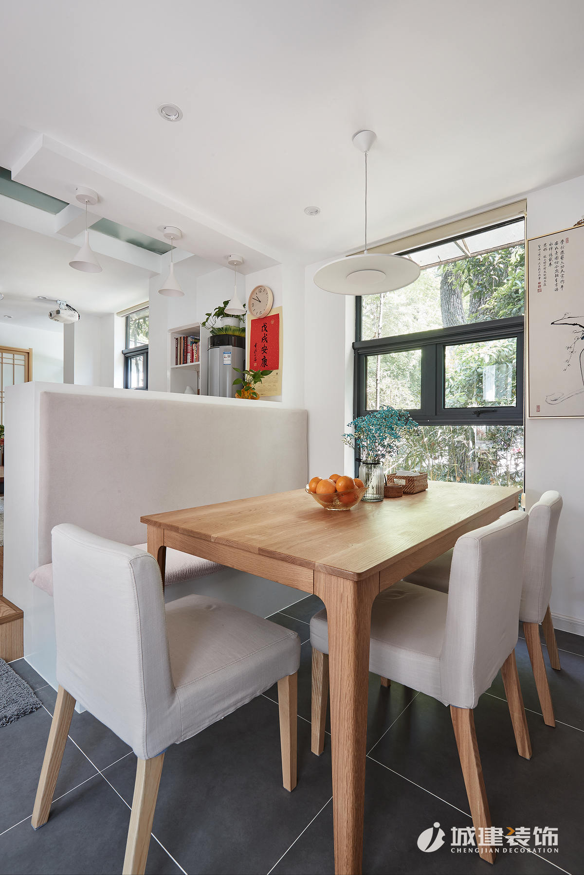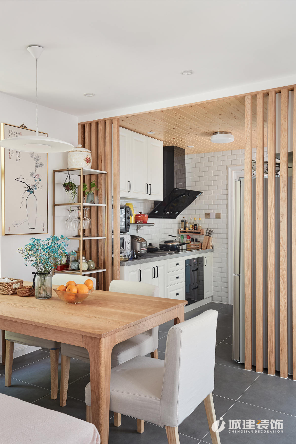 廚房采用了開放式的,整體色調(diào)也是干凈明亮的。餐桌選擇了木質(zhì)的材料,布藝的座椅,樸素中又不失時尚感。