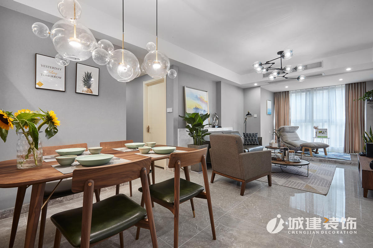 開放式格局餐廳,看起來更為寬敞明亮。木色餐桌與個性吊燈,現(xiàn)代與自然的元素相結合,利用廚房一側的墻體做成內嵌式小酒柜,滿足功能的同時也不失格調。