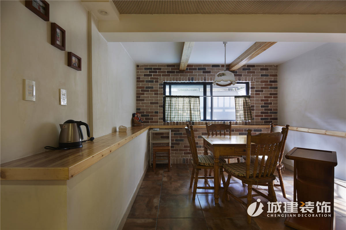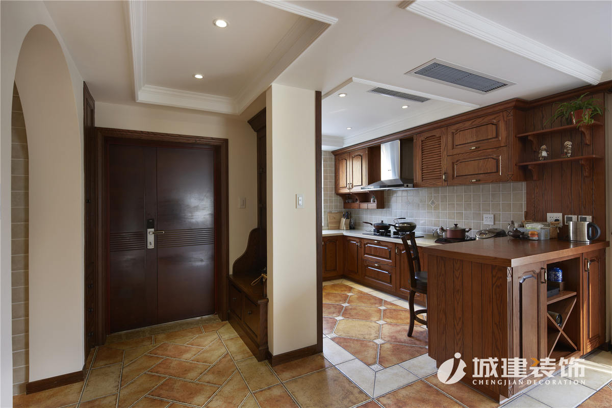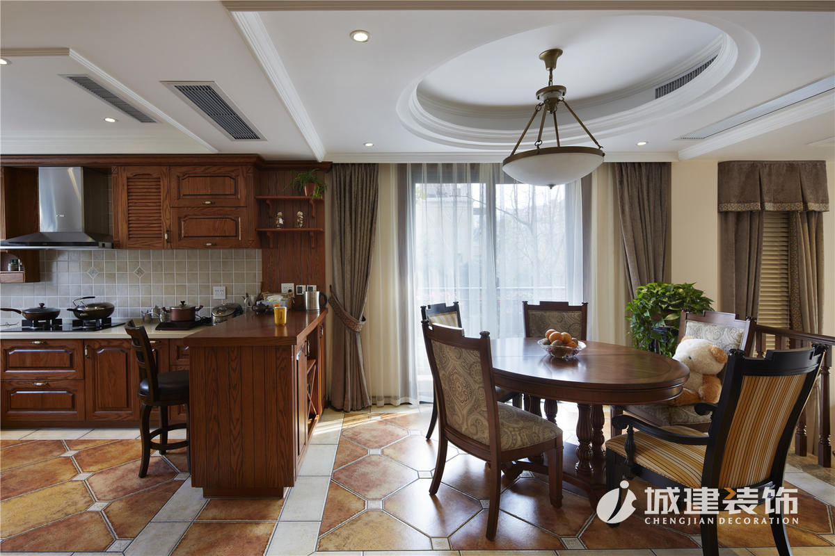 典型的美式風(fēng)格廚房裝飾,深色的櫥柜配色,現(xiàn)代感十足的簡(jiǎn)約。開放的空間格局,吧臺(tái)也是餐區(qū)的一部分,格子墻面。