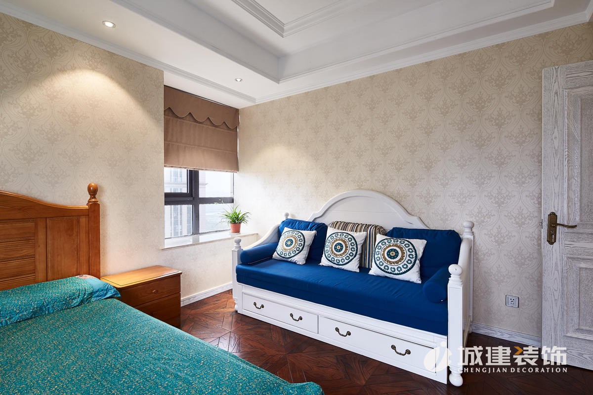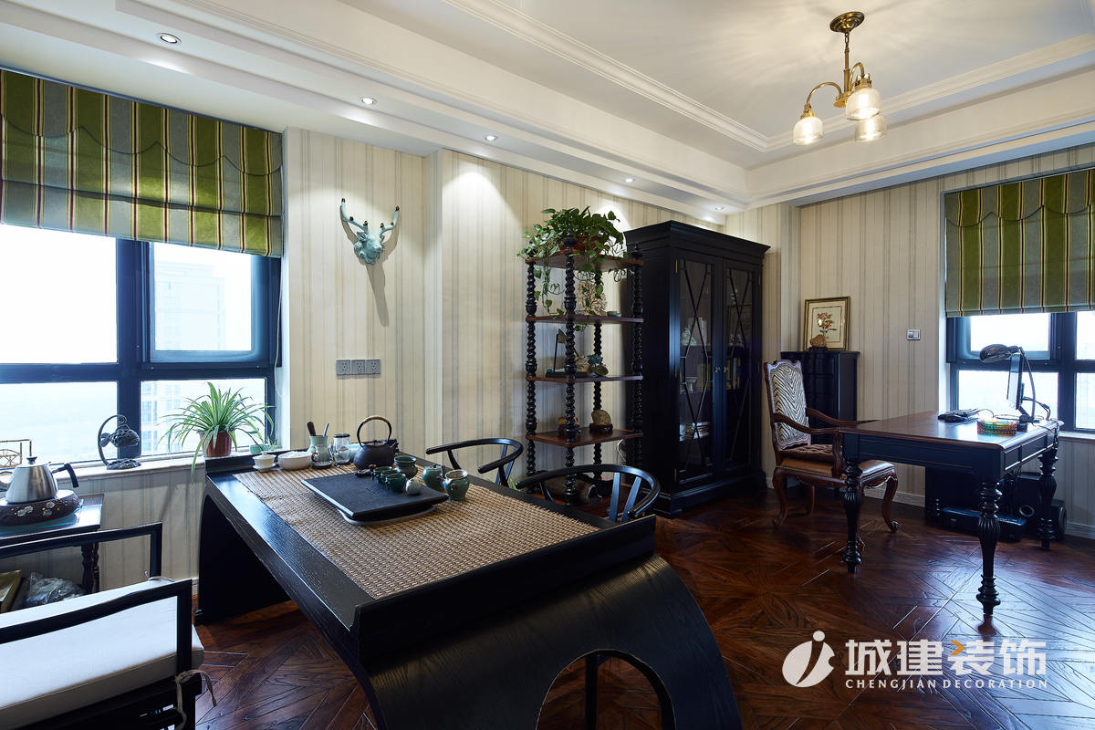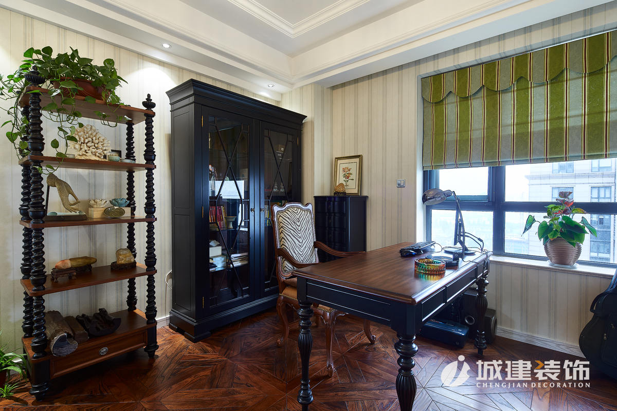 書房與客廳處別出心裁地采用可封閉可開放式的隔斷,也不失為設(shè)計的一大亮點。書房也采用深重色系家具,彰顯了主人家的沉穩(wěn)。