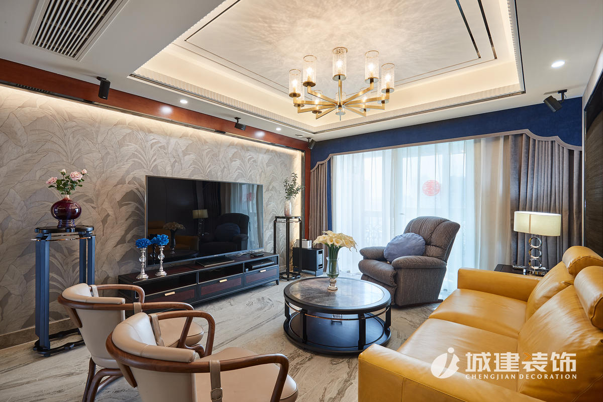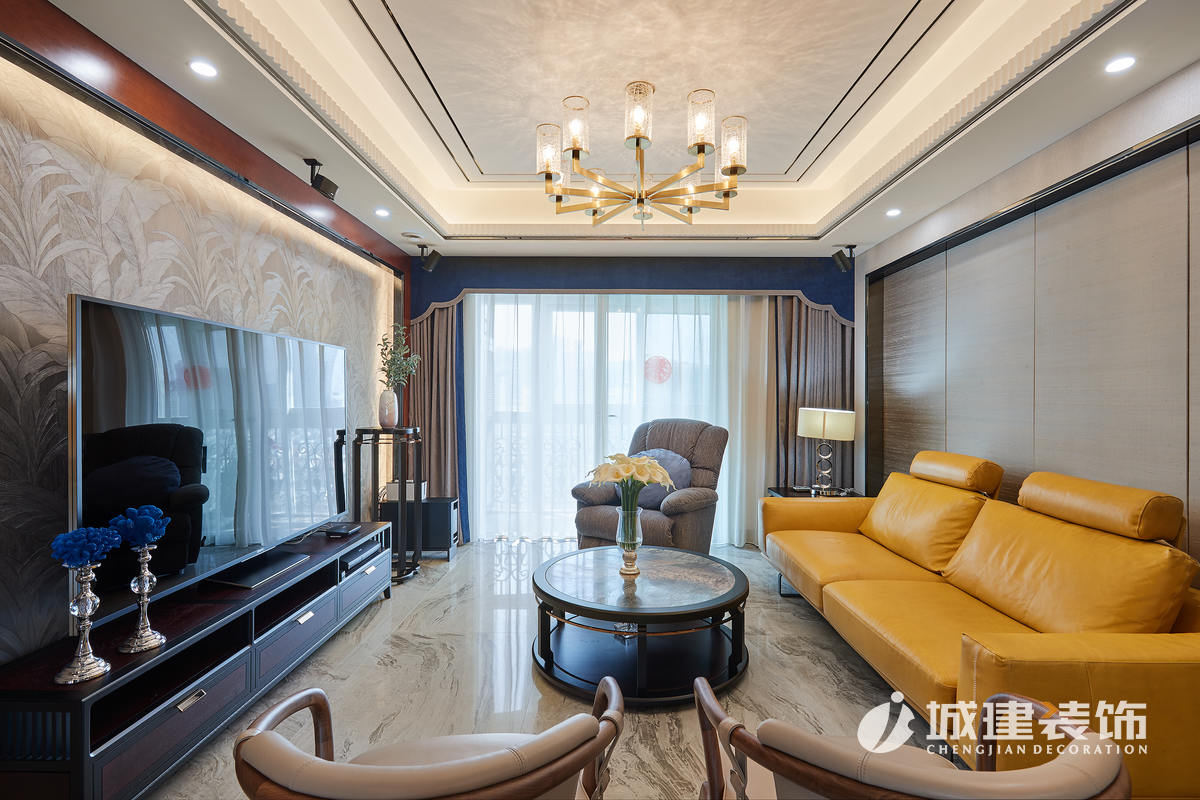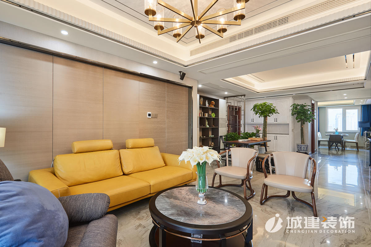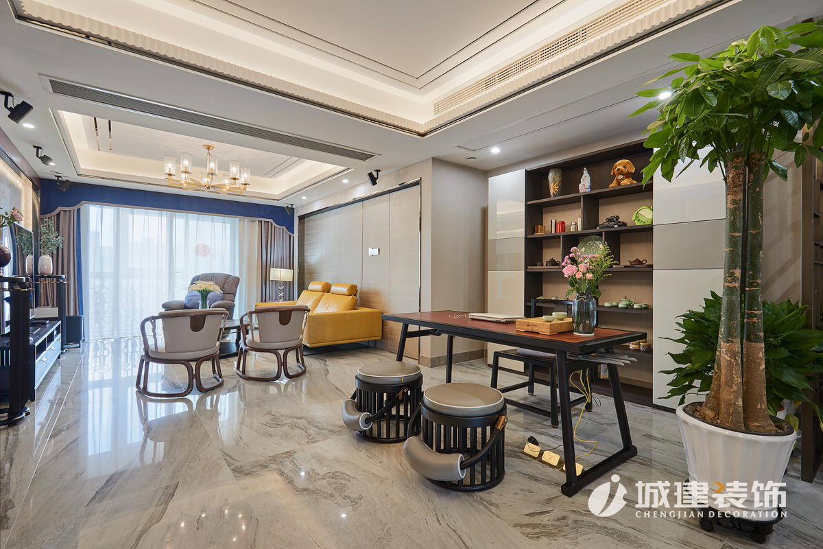 此空間利用吊頂自然劃分為客廳與休閑吧兩個(gè)區(qū)域。乍一看,簡(jiǎn)約的線條,簡(jiǎn)潔的裝飾,現(xiàn)代風(fēng)無疑,但仔細(xì)一品,金屬鑲邊更像畫框,而地面花紋就是一副寫意的水墨畫,家具也都蘊(yùn)藏著中式元素?,F(xiàn)代新中式掙脫了傳統(tǒng)中式的厚重,但保留了底蘊(yùn),卻更自由。