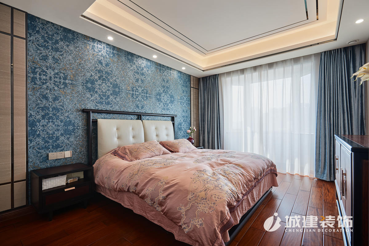 主臥如中國(guó)瓷器的背景墻,與精致的古風(fēng)儲(chǔ)物柜相對(duì)應(yīng),窗簾選色也呼應(yīng)著,讓這個(gè)空間的氛圍靜謐溫柔。