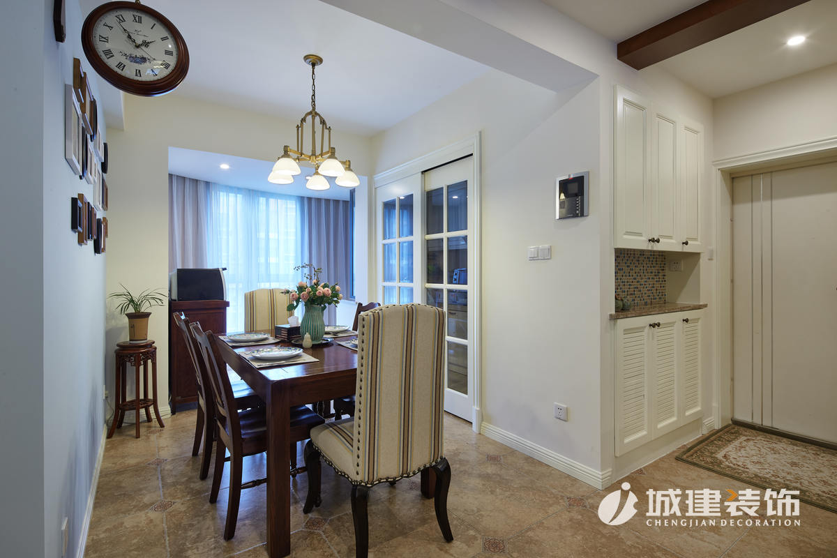 本案原戶型三室兩廳兩衛(wèi)結構,設計的最大亮點在于餐廳,原戶型結構上這處有一隔斷墻,經設計后直接敲掉,納入餐廳區(qū)域,功能性增強的同時也讓客餐廳兩點一線,南北空間變得十分通透。