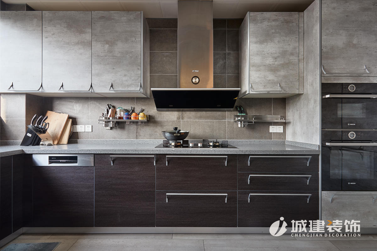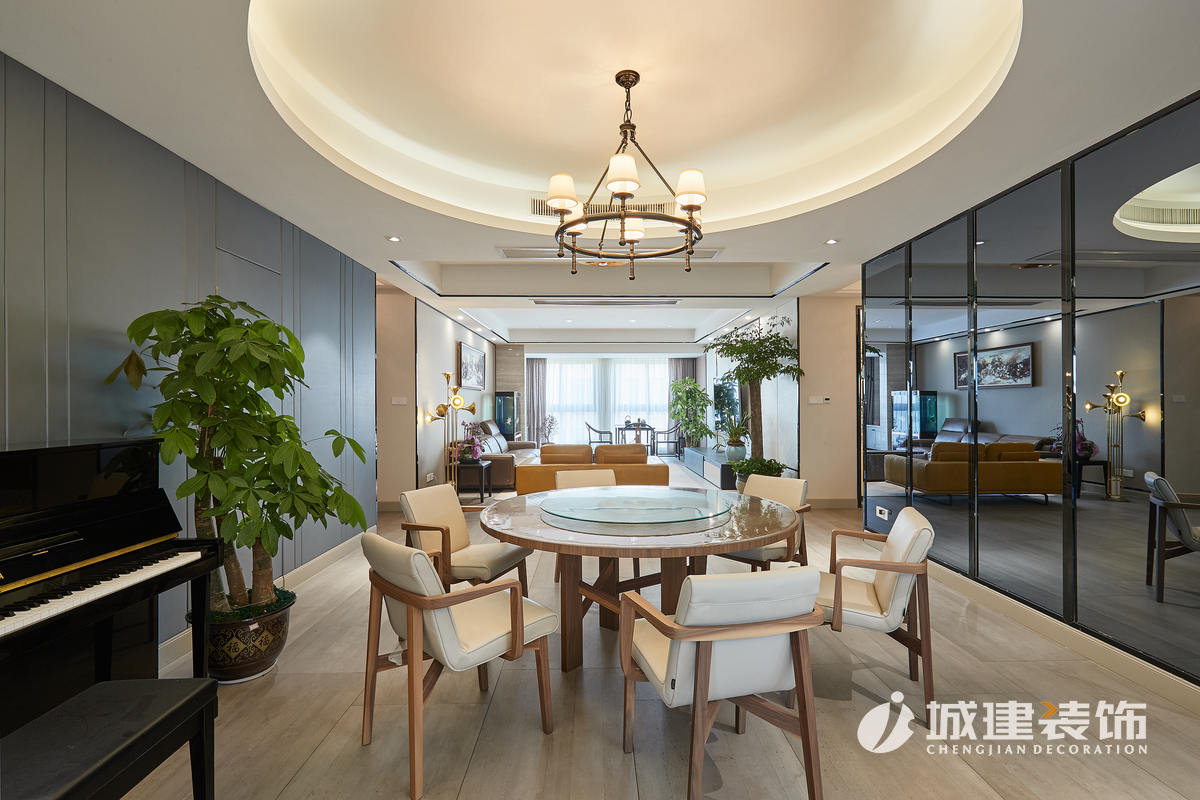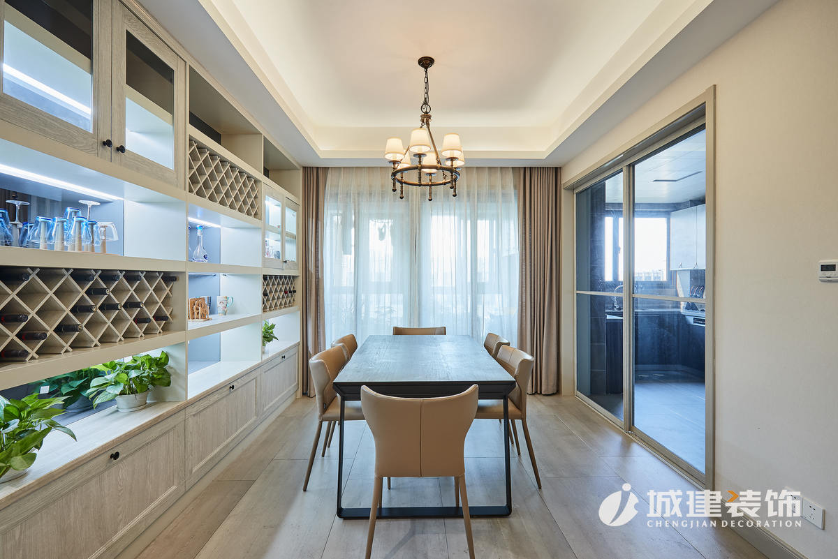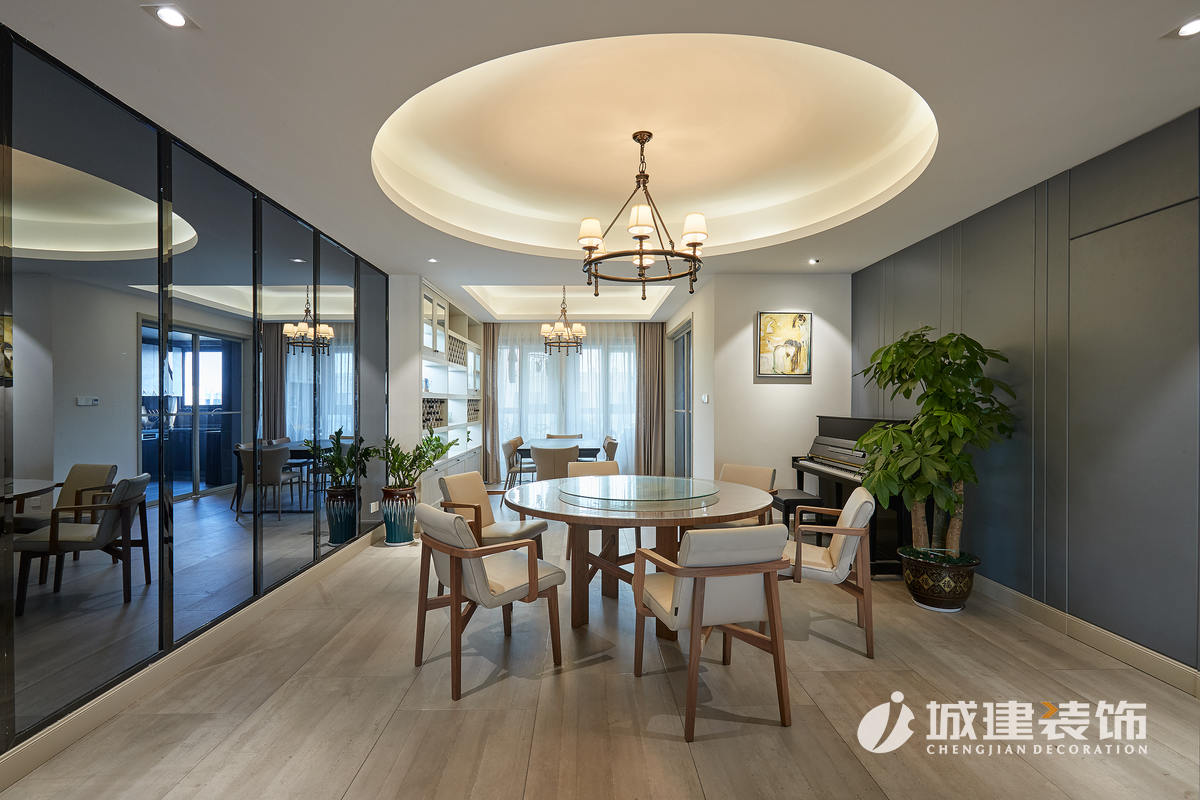 餐廳玻璃裝飾墻和灰色墻面相對應(yīng),讓空間層次更豐富有質(zhì)感。設(shè)計(jì)師設(shè)計(jì)了方形餐桌和圓形餐桌兩塊區(qū)域,不管是日常家庭用餐還是朋友多人聚餐,都能得到滿足;廚房玻璃移門更顯溫馨。