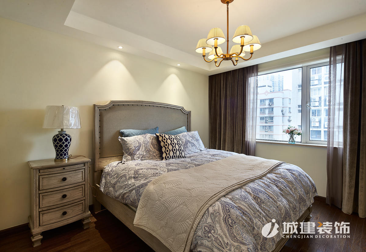 從吊燈到、墻體色,從床的結(jié)構(gòu)到墻紙的選取,都繼續(xù)圍繞美式簡約的主題,從客廳到餐廳,經(jīng)過走廊,推開門,進入臥室,從視覺角度來講,很自然、和諧,沒有色彩的沖撞。