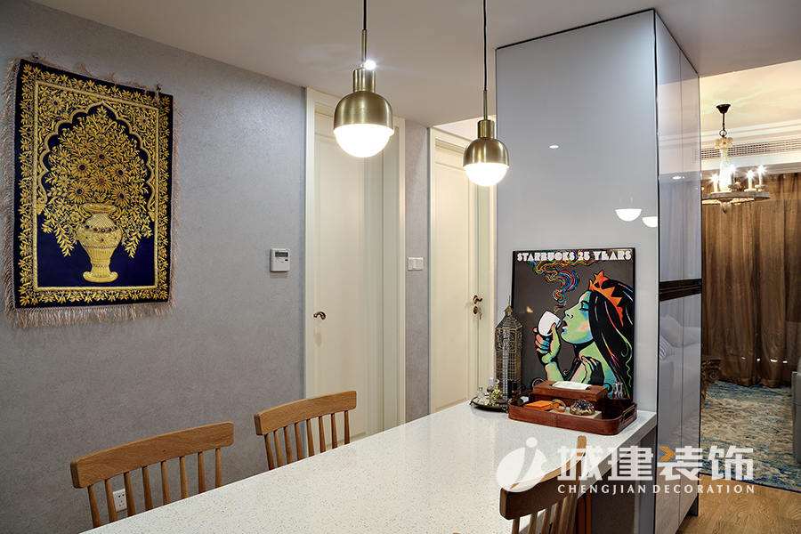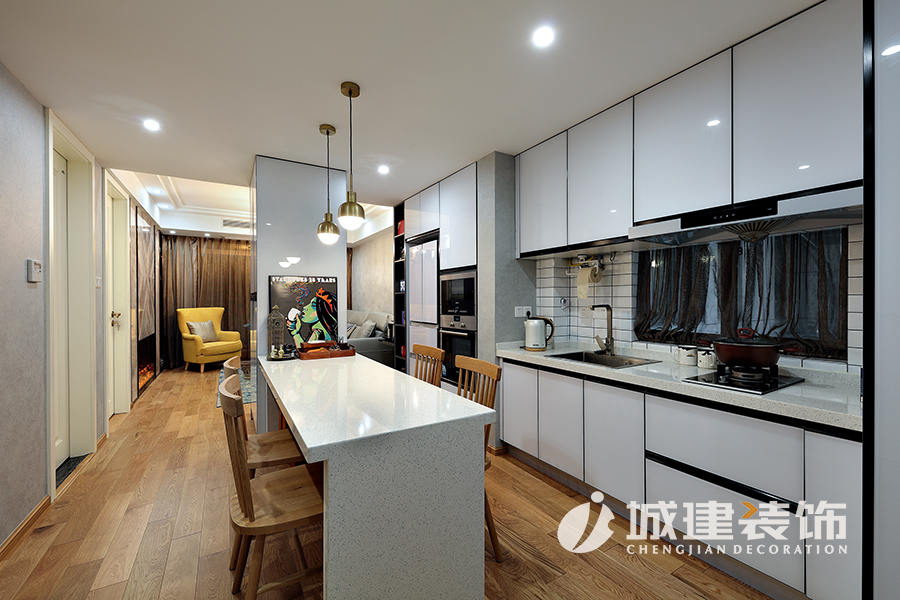 客餐廳、廚房及過道的設(shè)計改造是本案的最大設(shè)計亮點(diǎn)。