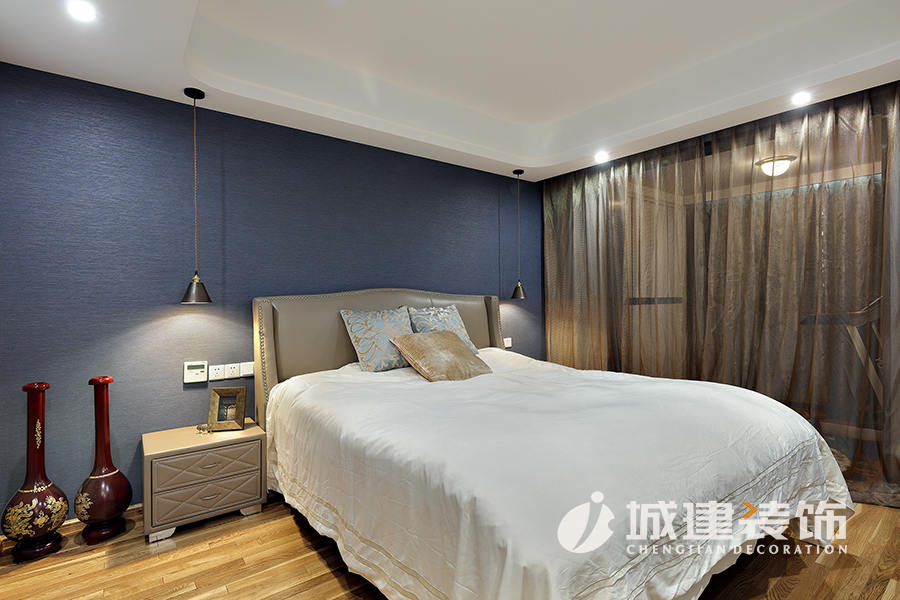 主臥采用灰藍(lán)墻紙裝飾,無需過多飾品,整個空間簡潔大氣,同時也彰顯出主人家的沉穩(wěn);