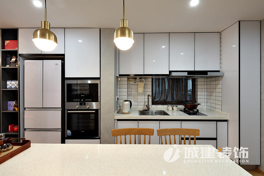 縮減原客餐廳區(qū)域,僅保留客廳,延伸過道廚房的區(qū)域,再有效分割兩者的空間占比,開放式廚房、島臺式餐廳的融合設(shè)計就這樣完美呈現(xiàn),