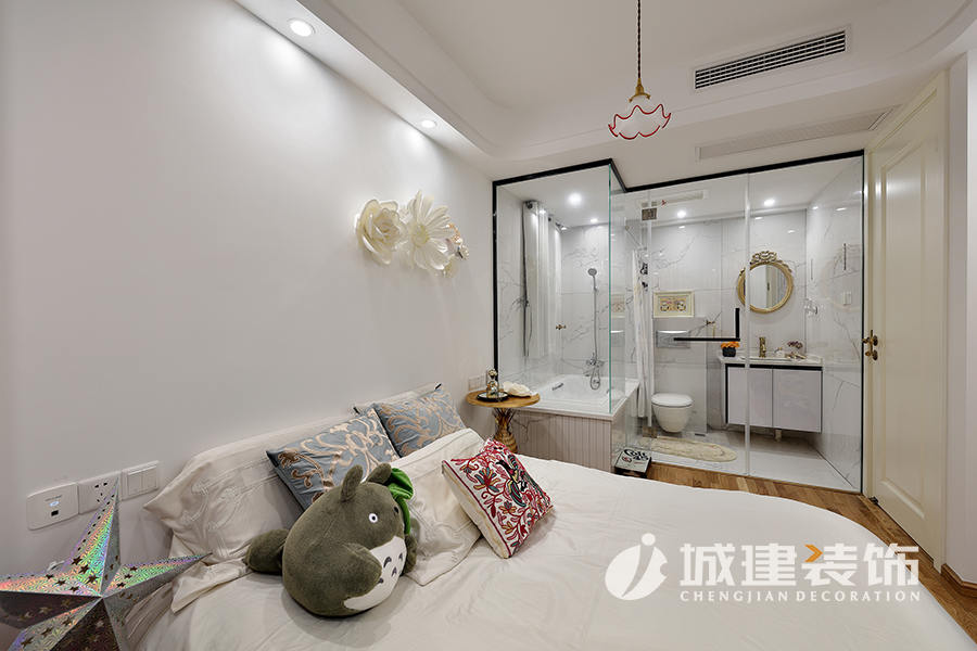 作為獨(dú)衛(wèi)的女兒衛(wèi),僅以玻璃分隔,視野上得到延伸,不會使房間和衛(wèi)生間因?yàn)楦魧佣兊锚M小。