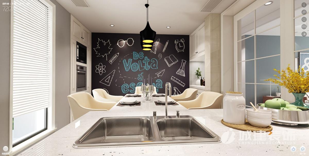 沒有繁瑣累贅的線條,鮮有璀璨奢華的元素,卻通過不同色塊之間的相互碰撞,干凈利落的講述了一個(gè)關(guān)于家的故事,給家以精致、溫暖的生活氣息。本案是一家四口的溫馨家庭。大膽的采用開放式廚房,通過中島與餐桌的連通增加家人互動(dòng)的空間。整面的黑板墻讓充滿藝術(shù)細(xì)胞的寶貝有充分發(fā)揮自己靈感的空間。