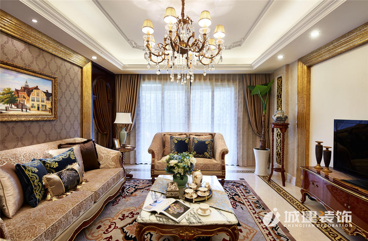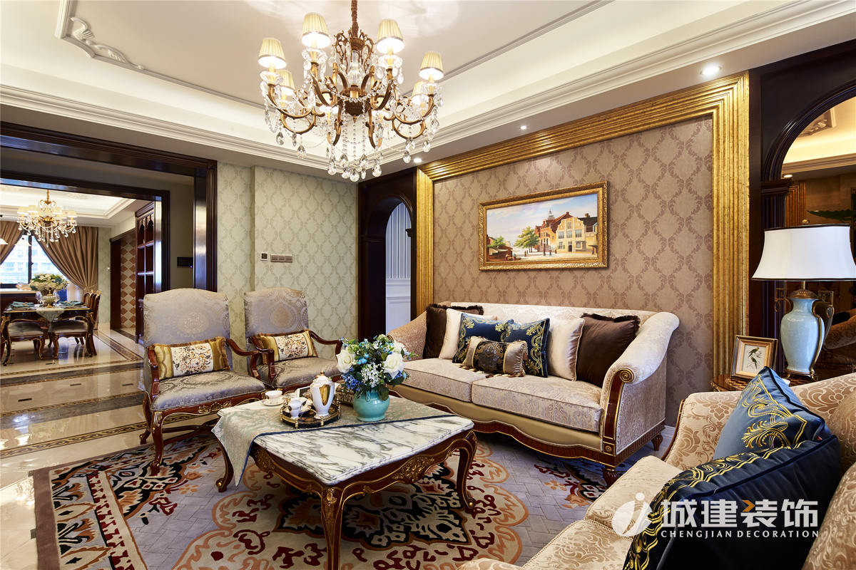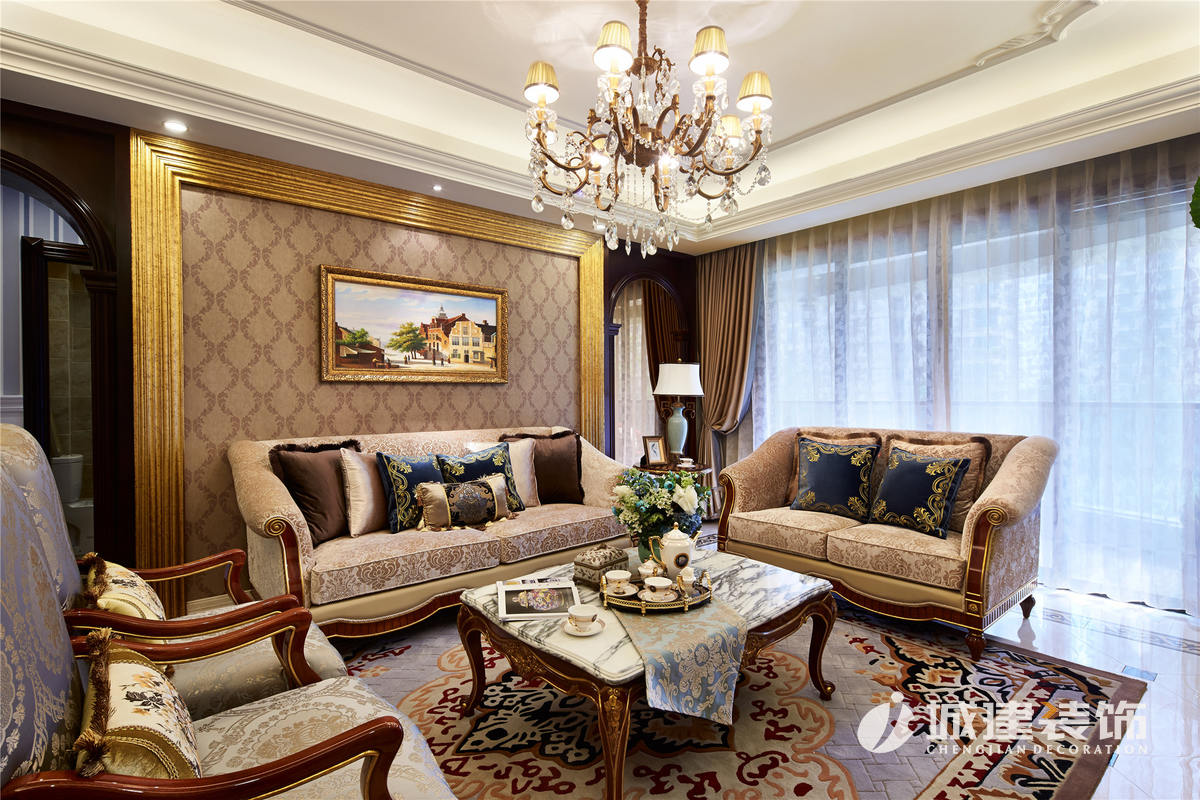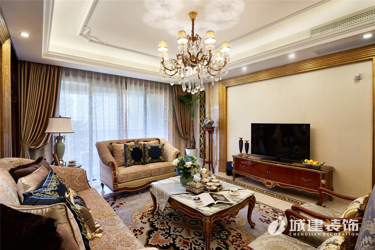 本案整體定義為簡美小奢華風(fēng)格。繁復(fù)的吊頂、金色實(shí)木鑲邊的裝飾、考究的軟搭,無不顯示了屋主的品質(zhì)生活。整個(gè)客廳可謂精雕細(xì)琢,大氣兼具別致,每一處細(xì)節(jié)都耐人尋味,可見設(shè)計(jì)師深厚的設(shè)計(jì)功底。