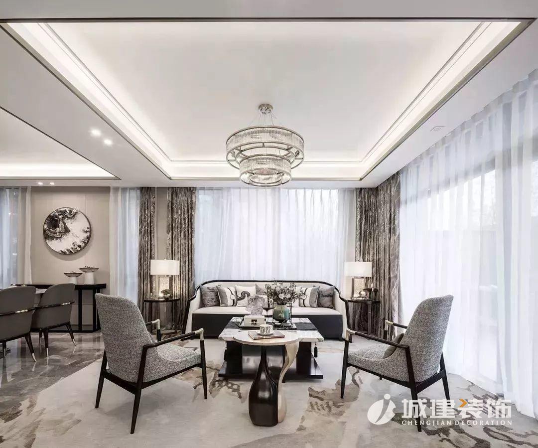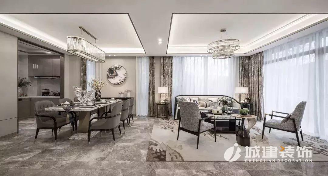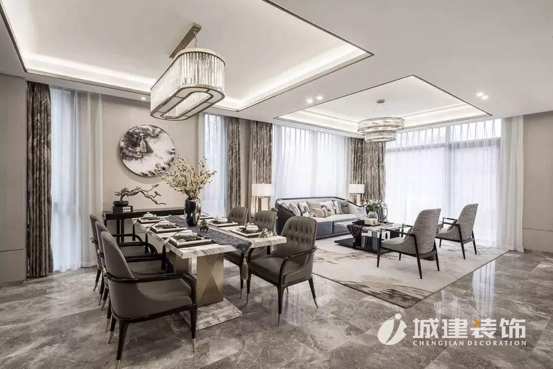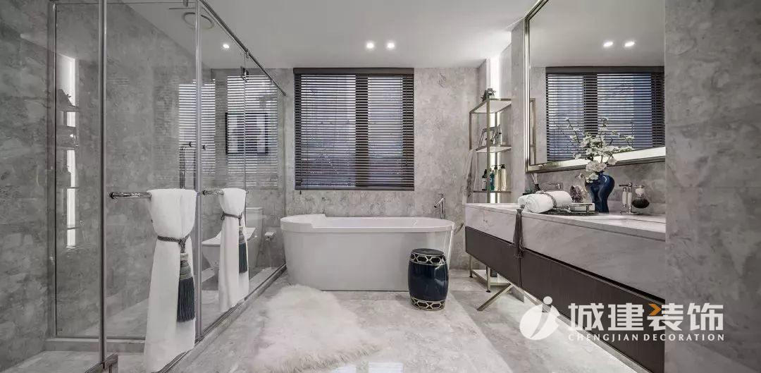 選用的是潑墨天然石材,石材本身呈現(xiàn)出水墨質(zhì)感,呼應東方韻味。墻面上切割出的條形燈帶的做法,同樣是大膽的嘗試,更是考驗了施工工藝的精度
