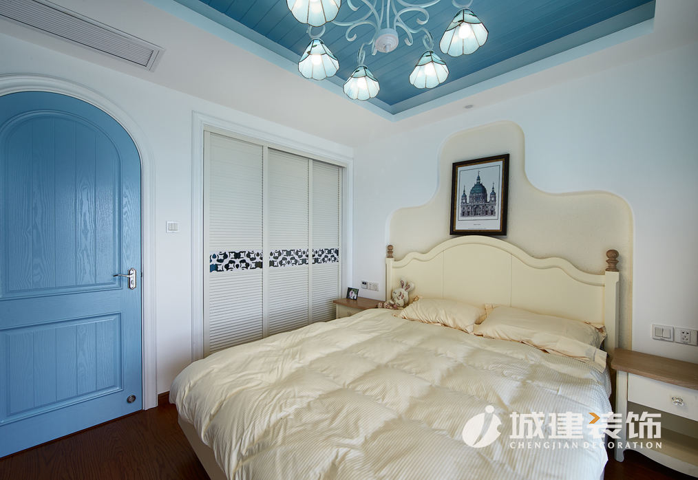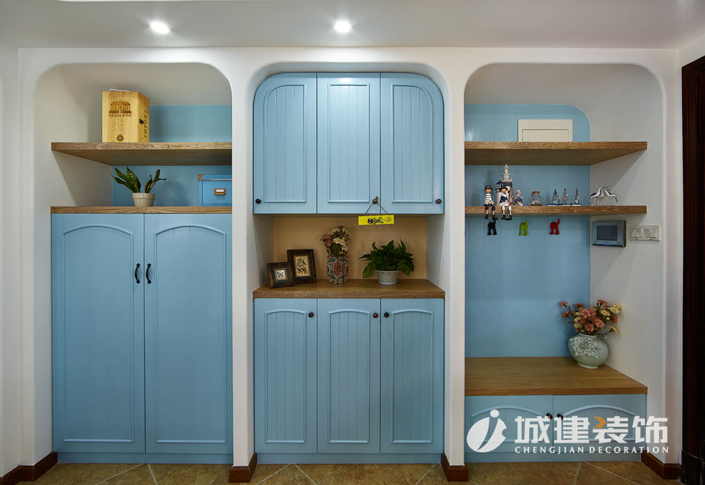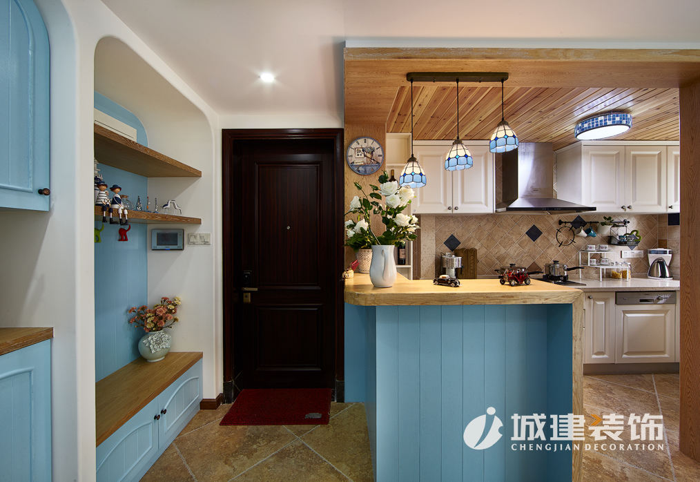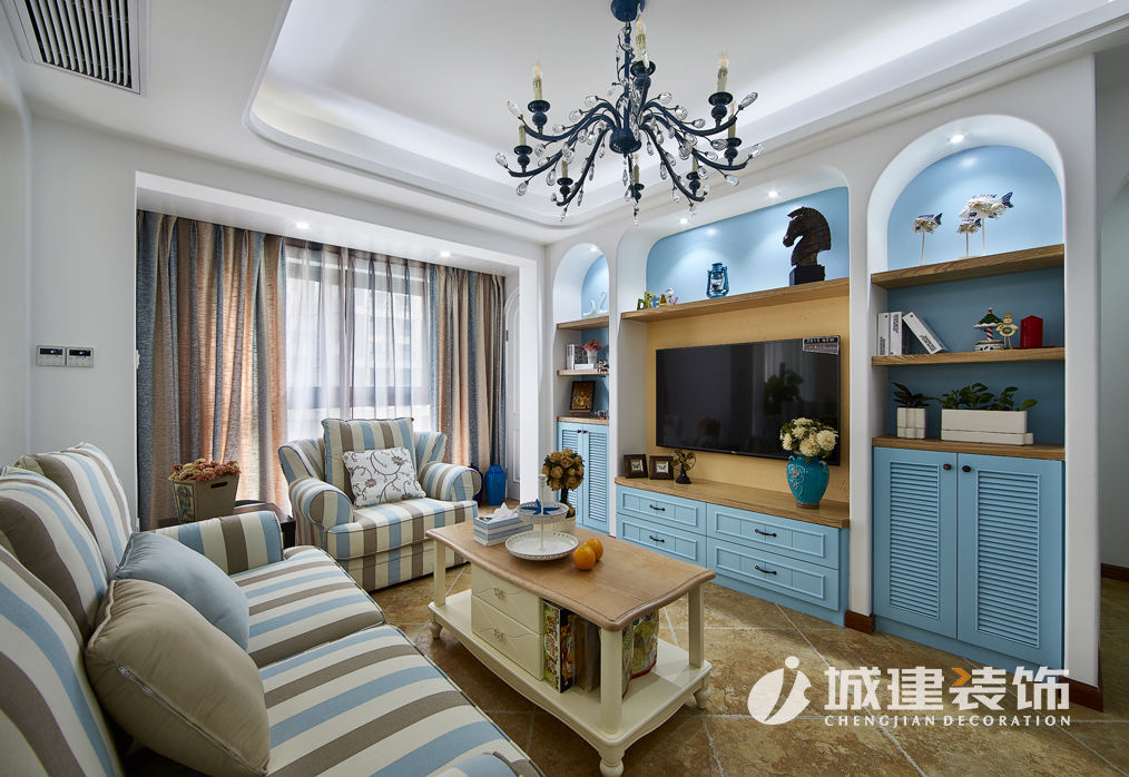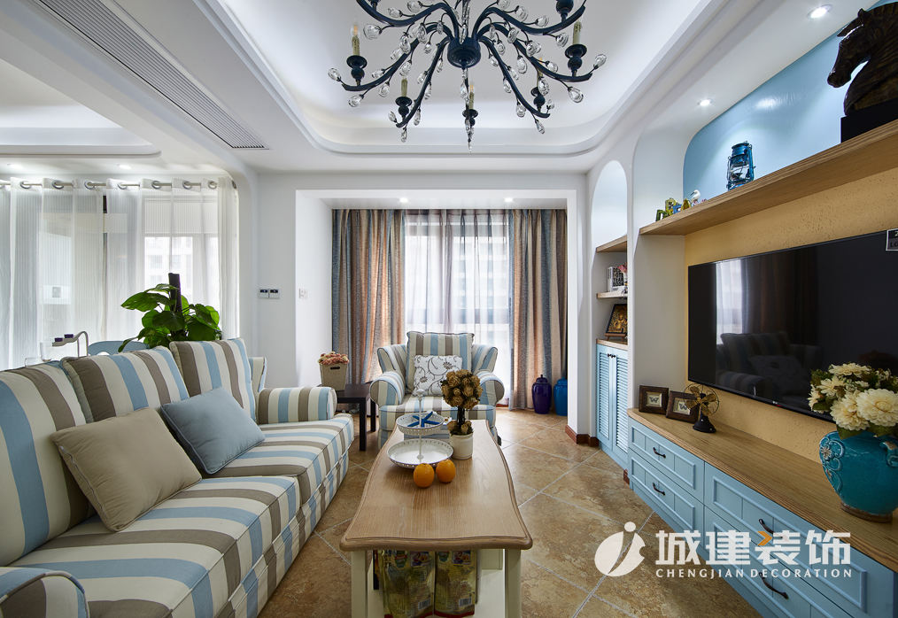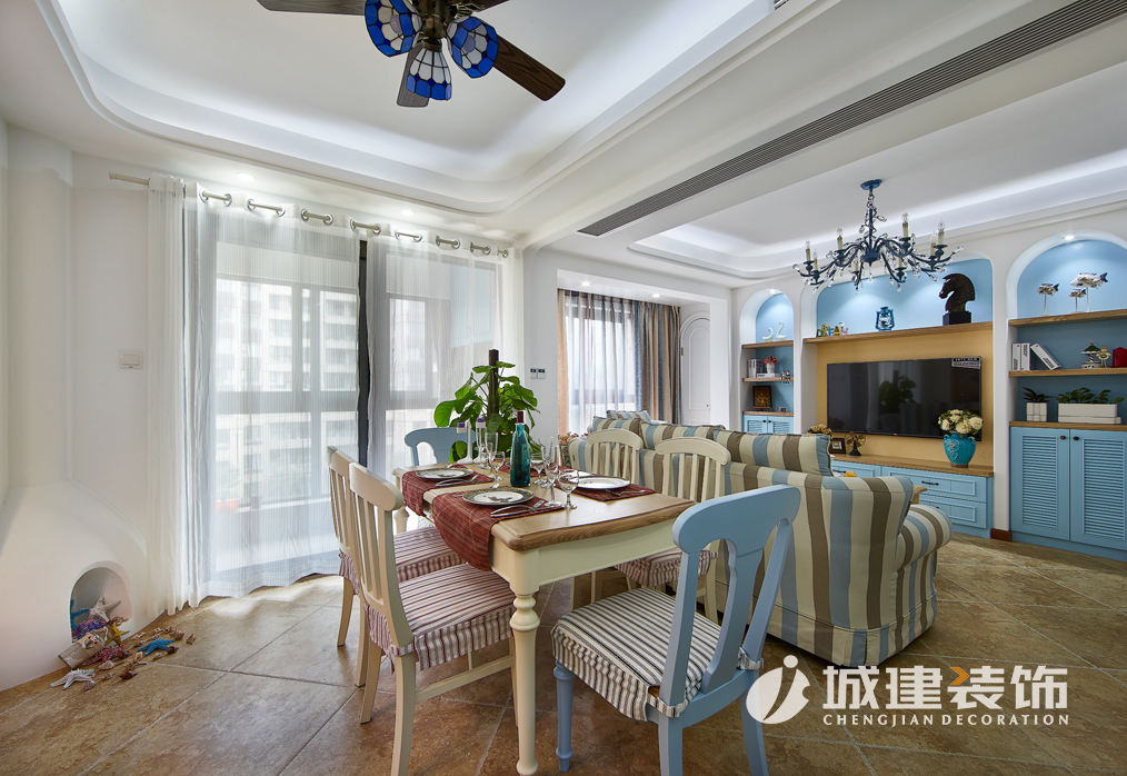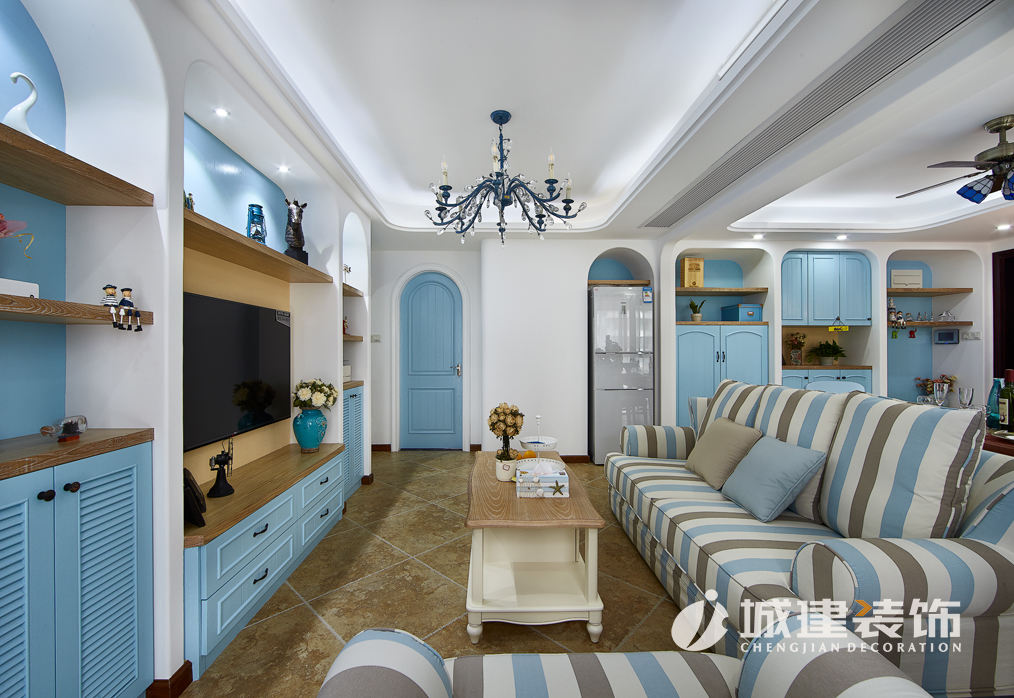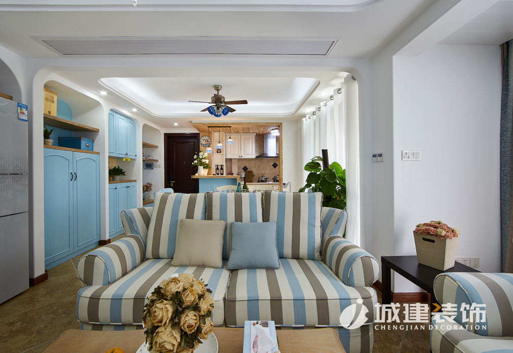 本案采用地中海風(fēng)格,置身蔚藍(lán)空間仿若徜徉大海之上,清新之息撲面而來(lái)。拱型對(duì)稱式電視背景墻、藍(lán)灰白條紋相間的面藝沙發(fā),落地式小型壁爐,敞開(kāi)式廚房,搭配地中海風(fēng)格的各式小擺件點(diǎn)綴,客餐廚三個(gè)空間一線貫通,整個(gè)空間濃濃的地中海風(fēng)情。