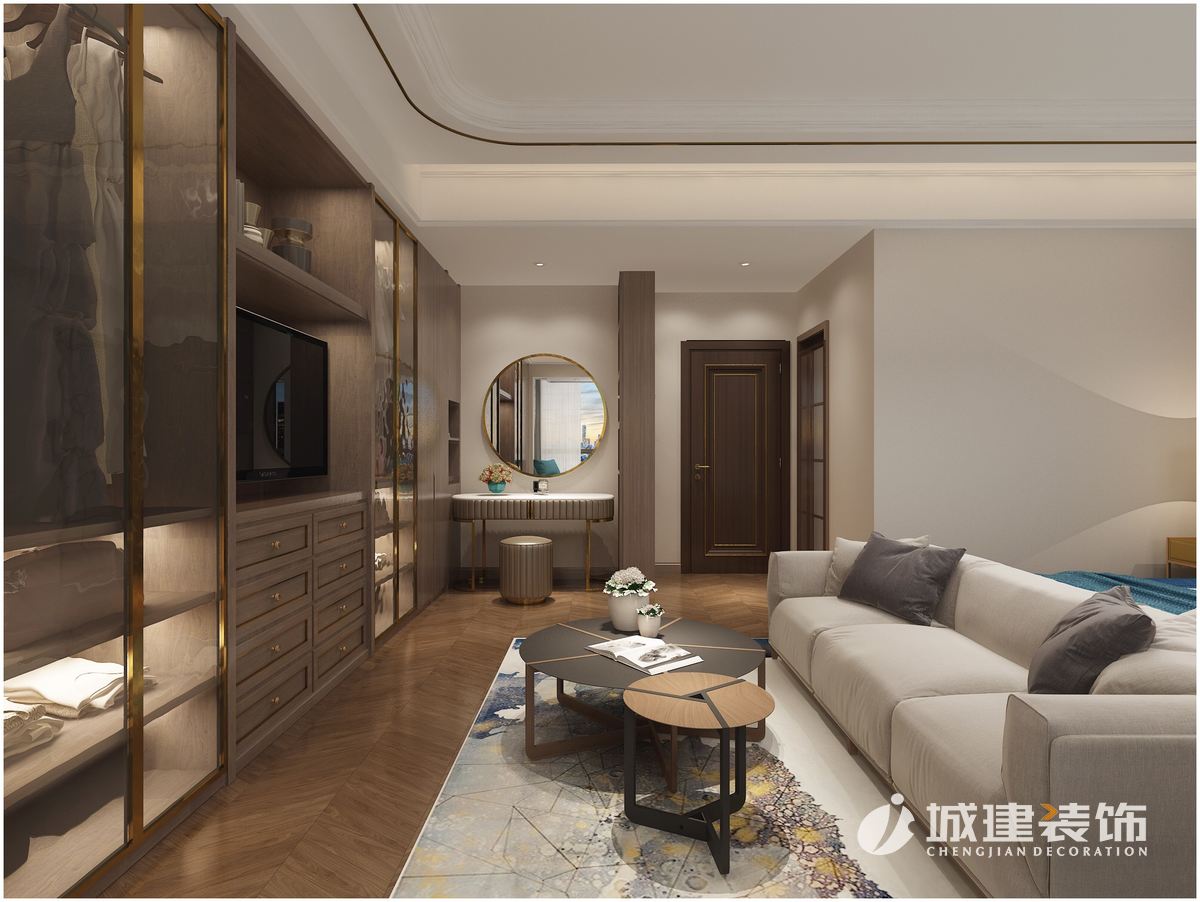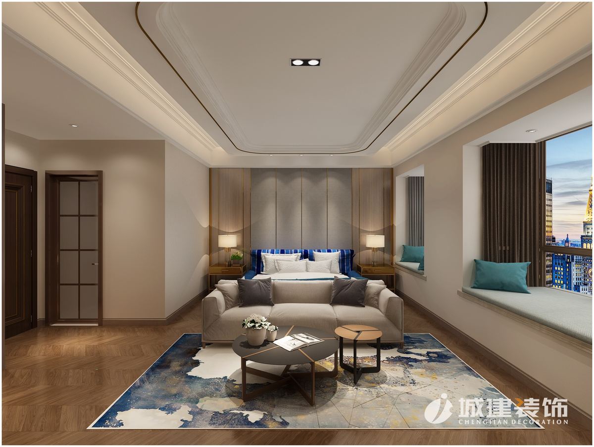 主臥室在色調(diào)上以略顯沉穩(wěn)大氣,灰色調(diào)配以金屬條、璀璨藍(lán)綠軟裝和水墨地毯,形成空間里的跳色,映入眼簾。