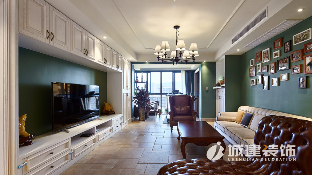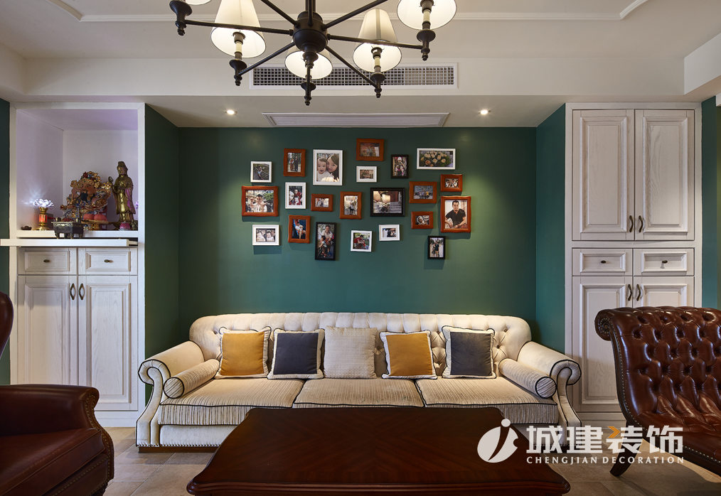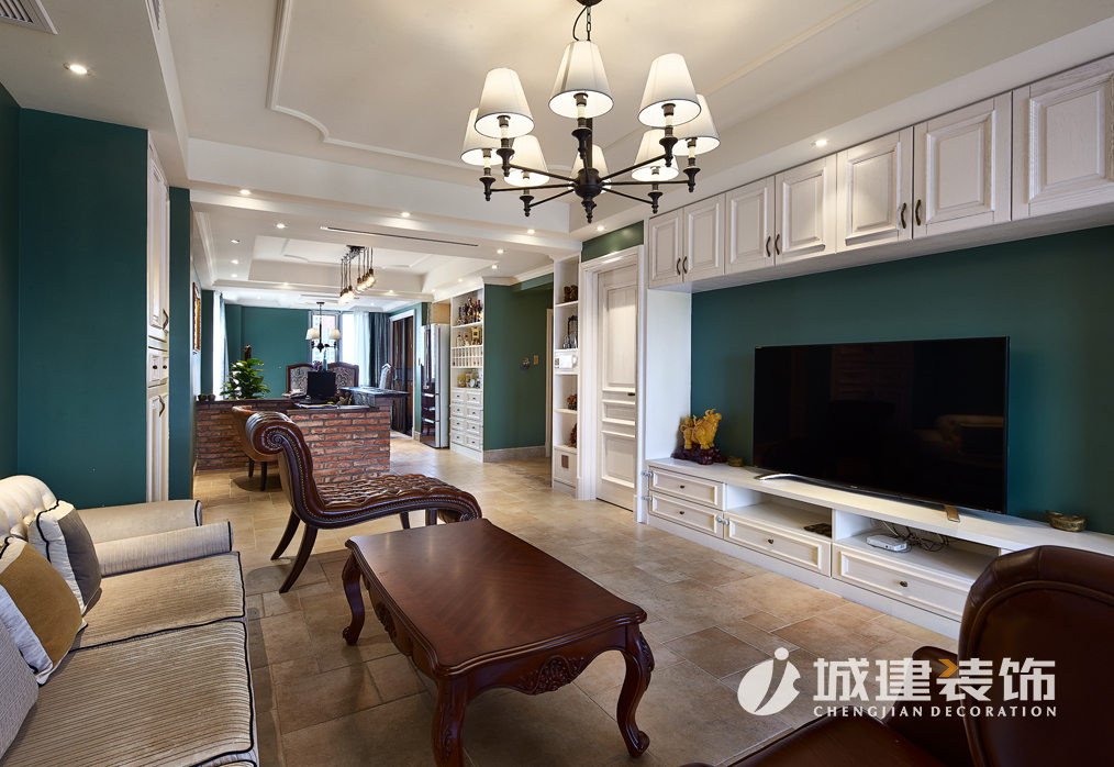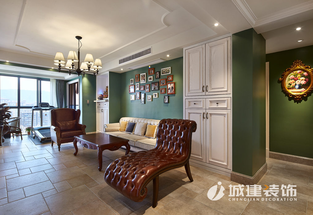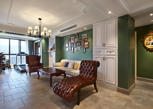 屋主也是從事設(shè)計(jì)行業(yè),自然對設(shè)計(jì)有自己的要求,在一番深入的溝通過之后,確認(rèn)了風(fēng)格——濃情美式。以墨綠色為客廳主色調(diào),配以白色柜子、仿古地磚,以及在客廳與餐廳中間的工作區(qū),用裸露的紅磚塊堆砌,美式自由氣息立即呈現(xiàn)。