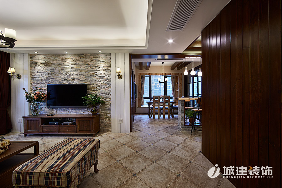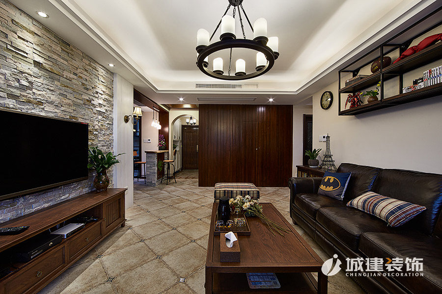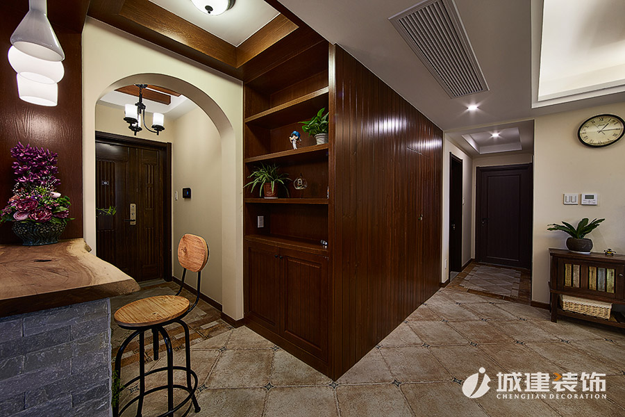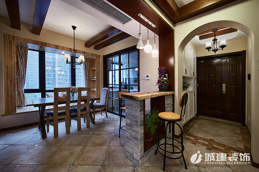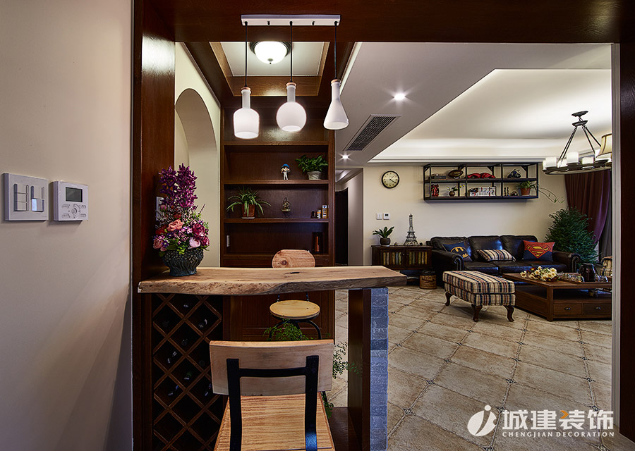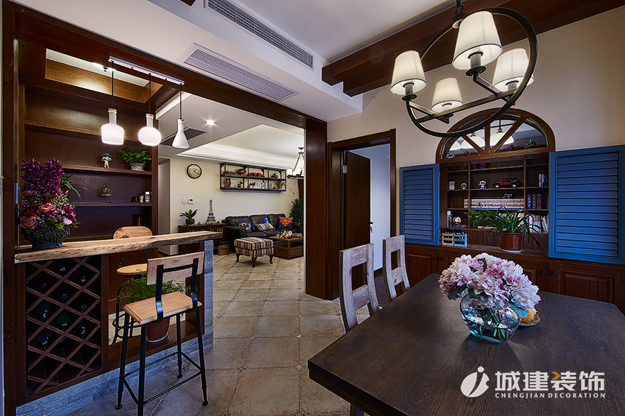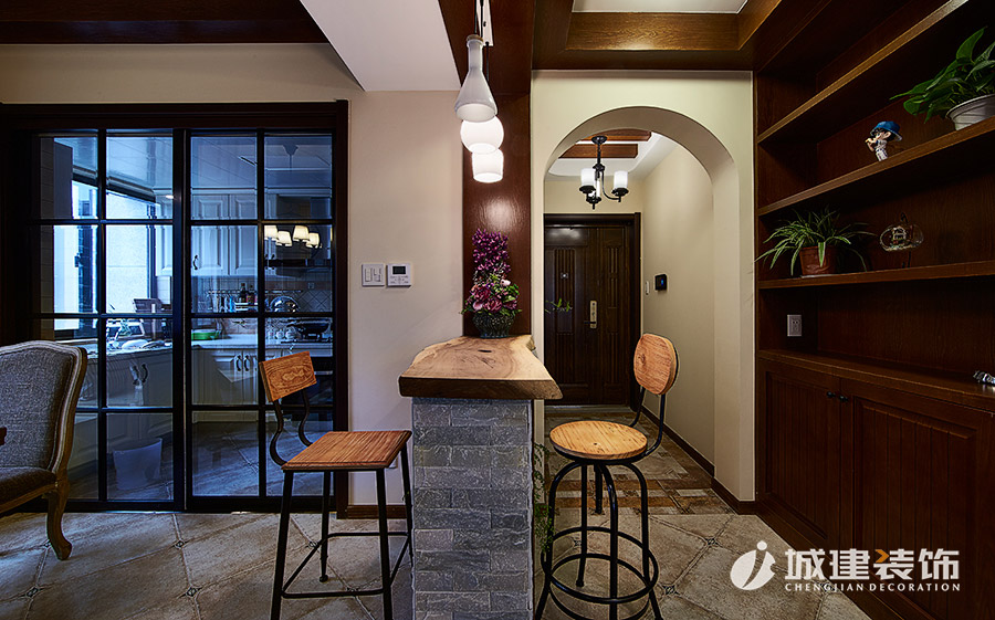 本案采用溫馨小美風(fēng),無論是客廳處的或皮質(zhì)或布藝的沙發(fā),還是做舊造型的沙發(fā)柜,電視背景墻和玄關(guān)處酒柜吧臺的石材裝飾,時尚個性燈具,鐵藝木質(zhì)結(jié)合的吧臺椅,無不體現(xiàn)浪漫的美式情懷,整體風(fēng)格也達(dá)到極致完美的統(tǒng)一融合。