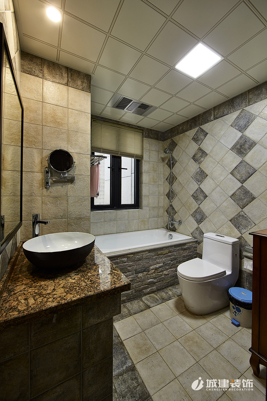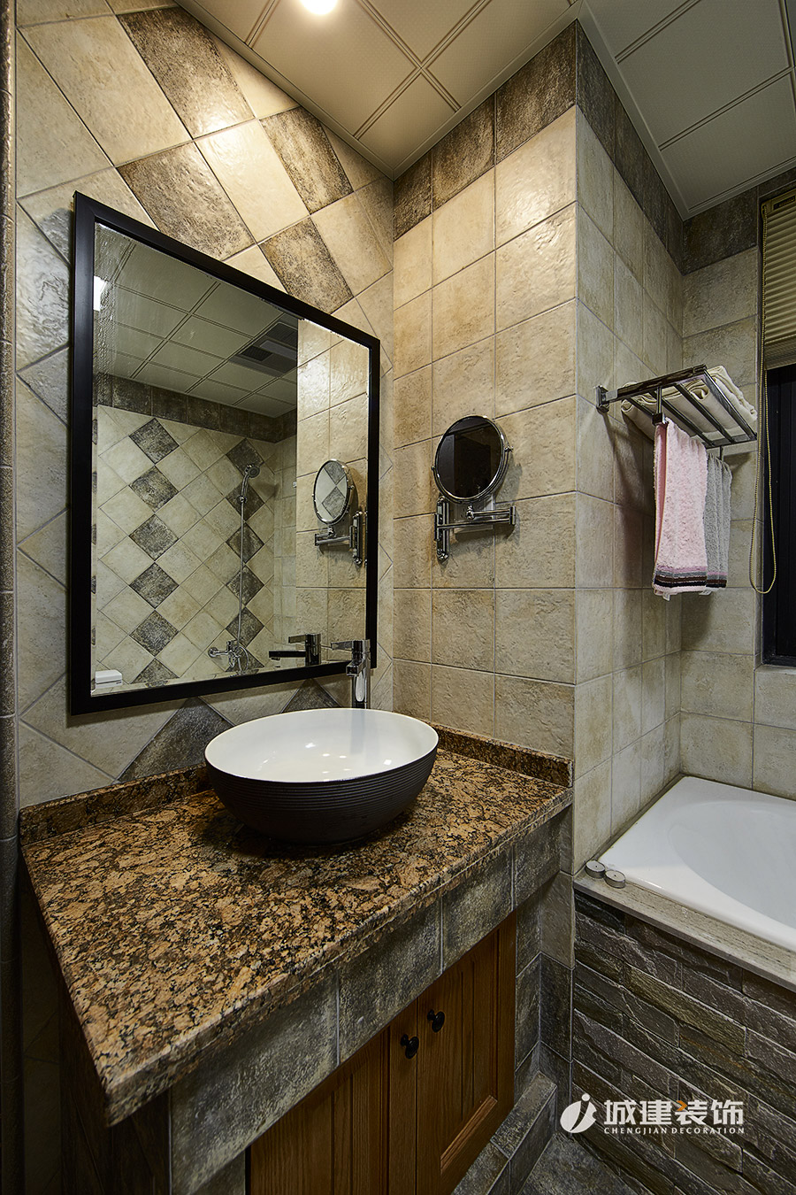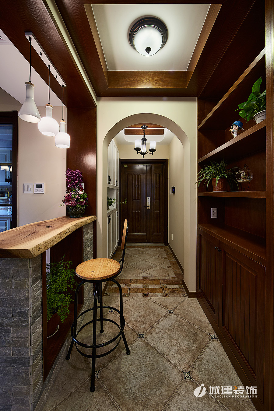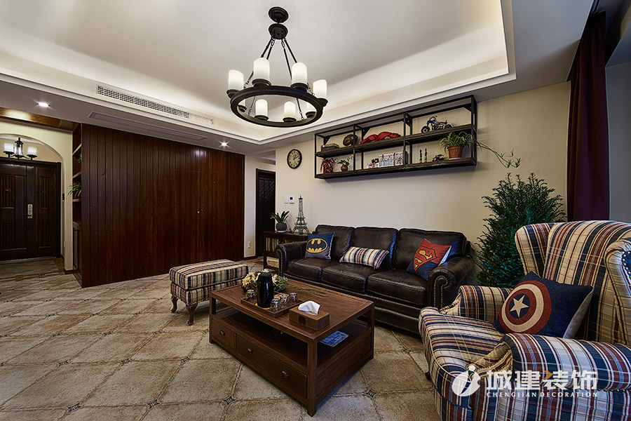 本案采用溫馨小美風(fēng),無論是客廳處的或皮質(zhì)或布藝的沙發(fā),還是做舊造型的沙發(fā)柜,電視背景墻和玄關(guān)處酒柜吧臺的石材裝飾,時尚個性燈具,鐵藝木質(zhì)結(jié)合的吧臺椅,無不體現(xiàn)浪漫的美式情懷,整體風(fēng)格也達(dá)到極致完美的統(tǒng)一融合。