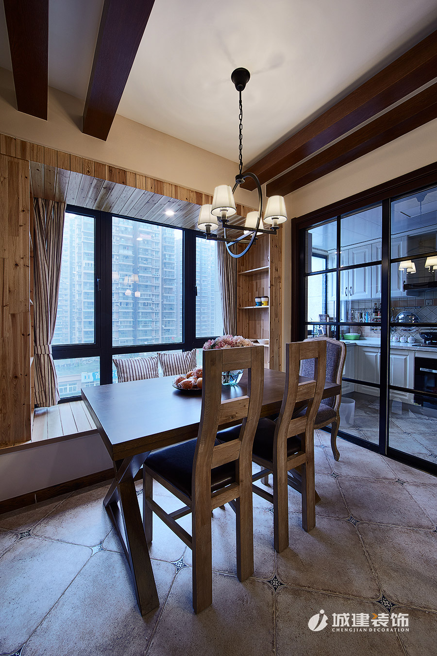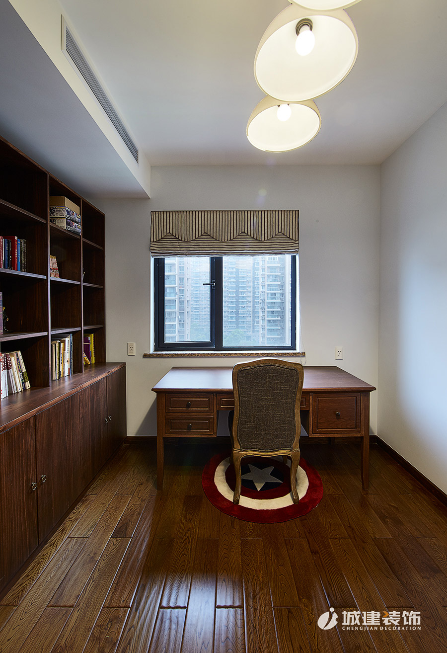 書房連接餐廳處別出心裁地設(shè)計了室內(nèi)窗,餐廳作為延伸點(diǎn)向左向右,使得書房、廚房三處連通一線,整片區(qū)域在視覺上達(dá)到了延伸。