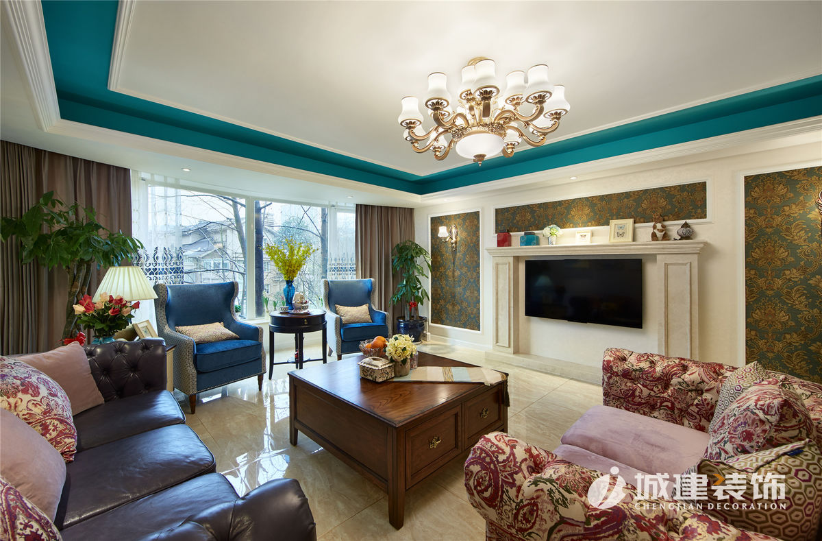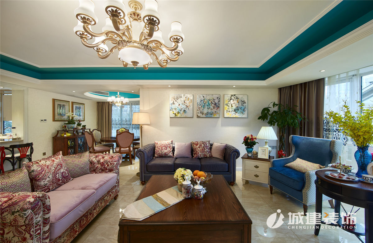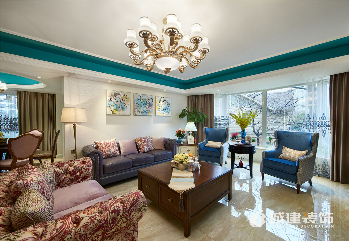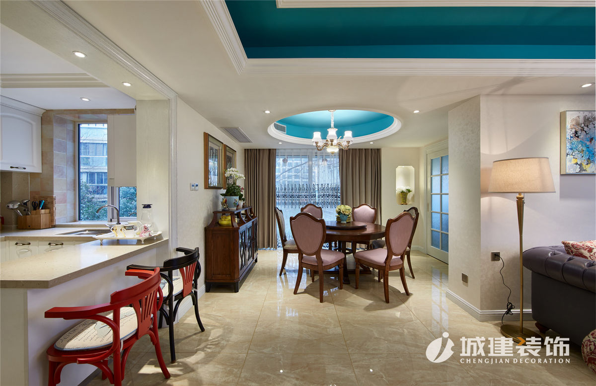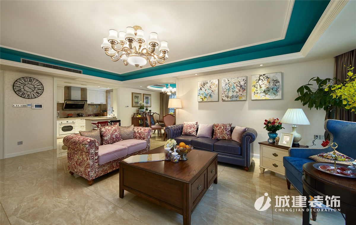本案女業(yè)主是一位美麗溫柔的太太,充分溝通過之后定位了美式風(fēng)格,在色彩上以溫柔的米色為主色調(diào),客廳與餐廳的吊頂大膽的選擇了孔雀藍(lán),讓整個空間在柔和之中,更顯精致時尚。在家具軟配上,選擇了很多碎花圖案搭配,讓這個家感覺更溫馨。