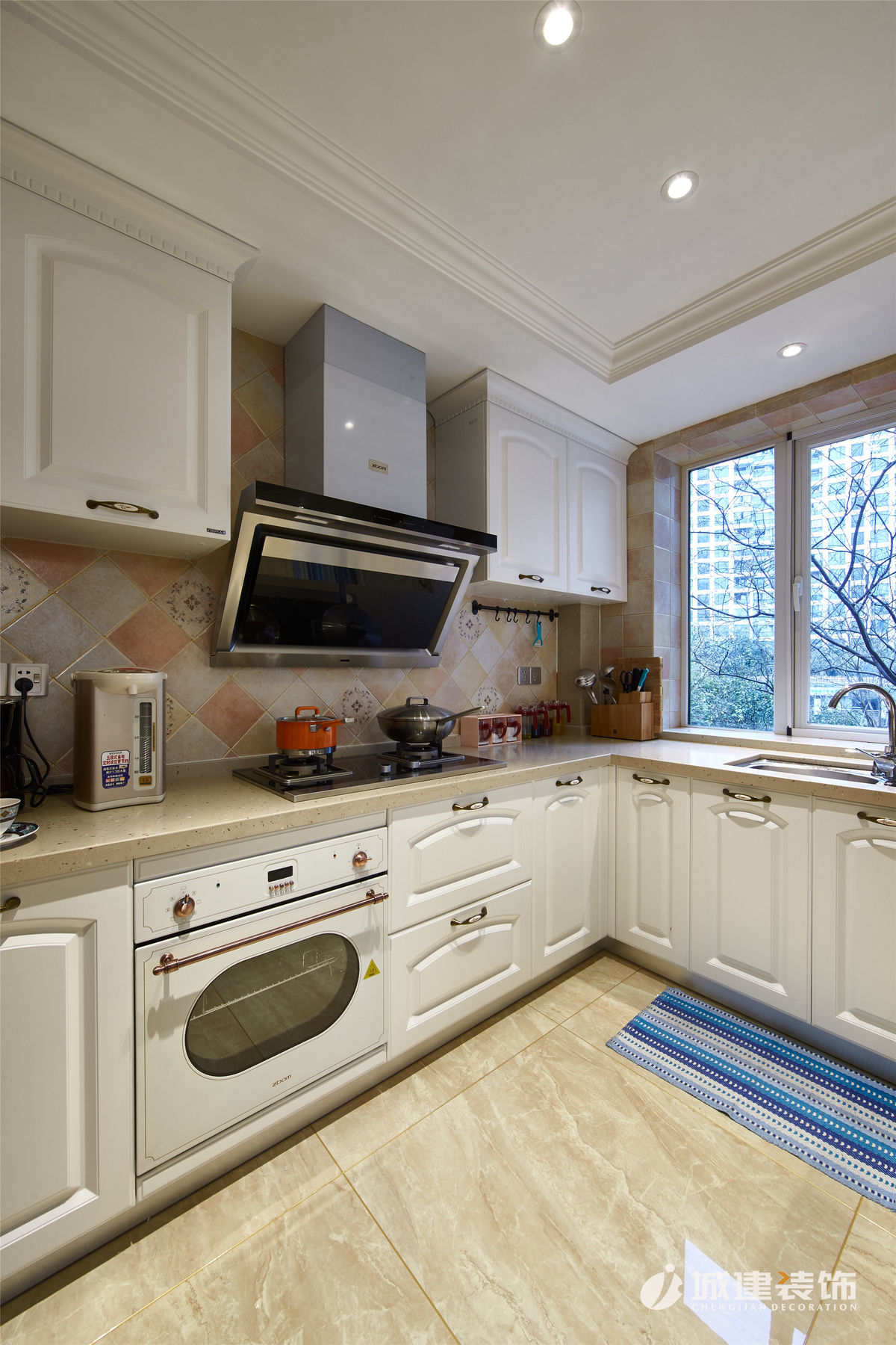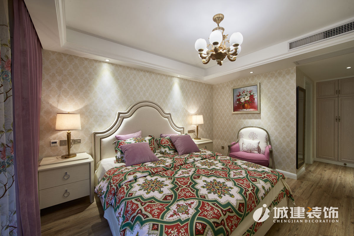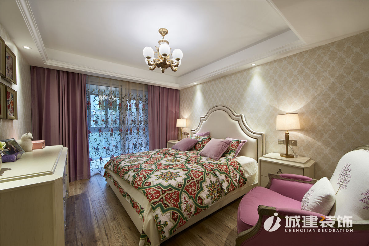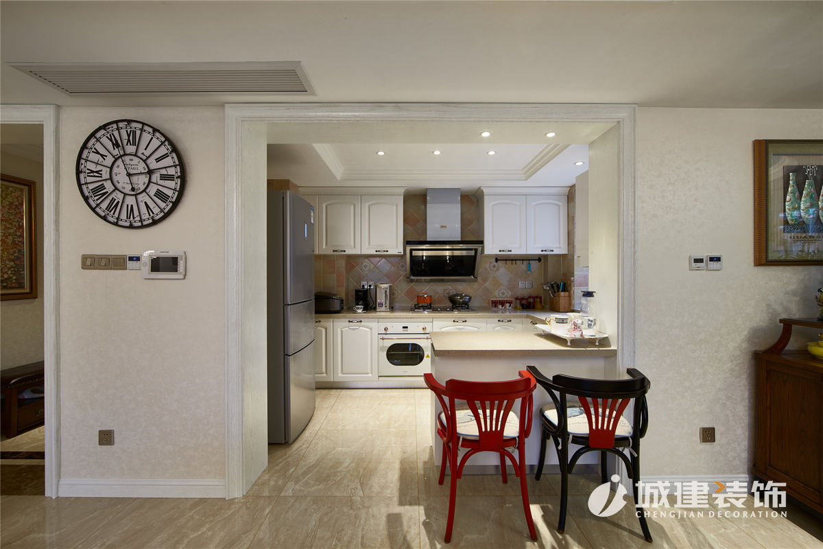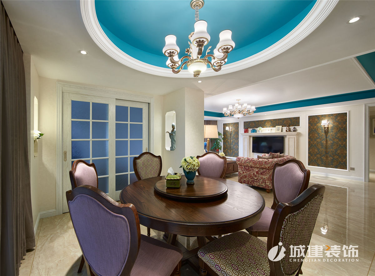 本案女業(yè)主是一位美麗溫柔的太太,充分溝通過之后定位了美式風(fēng)格,在色彩上以溫柔的米色為主色調(diào),客廳與餐廳的吊頂大膽的選擇了孔雀藍(lán),讓整個空間在柔和之中,更顯精致時尚。在家具軟配上,選擇了很多碎花圖案搭配,讓這個家感覺更溫馨。