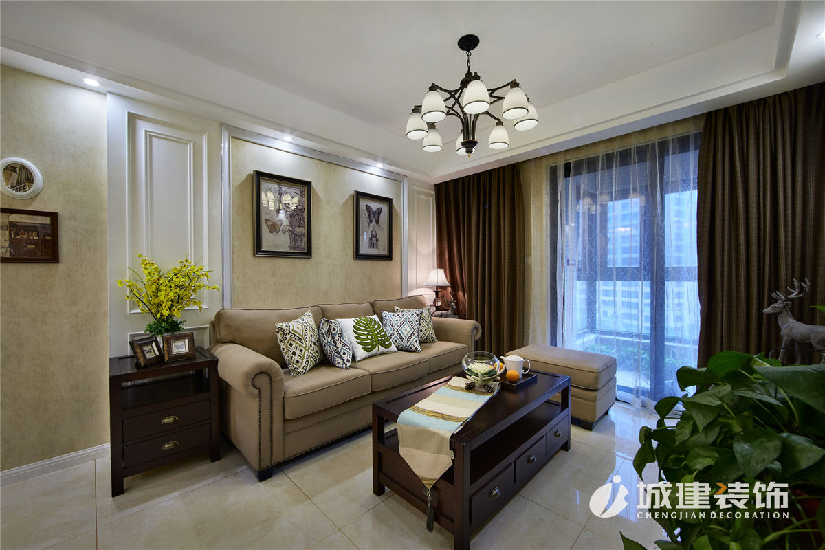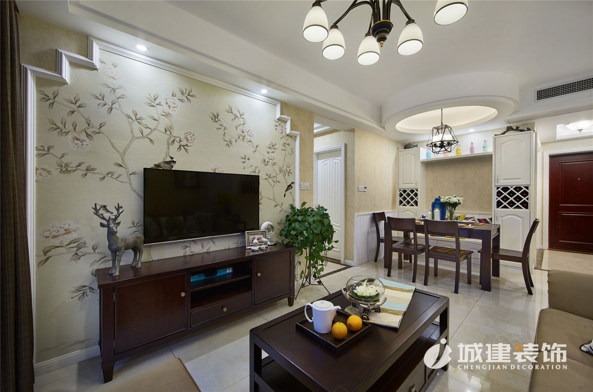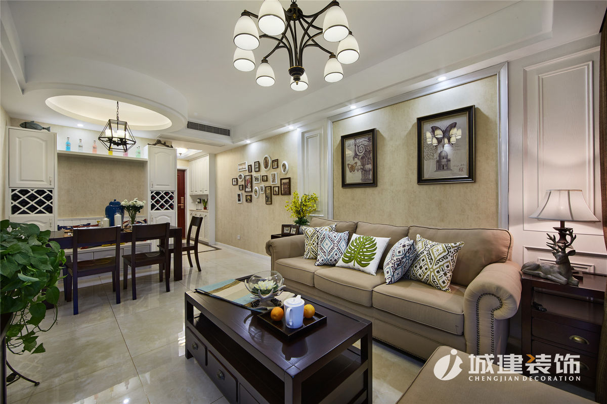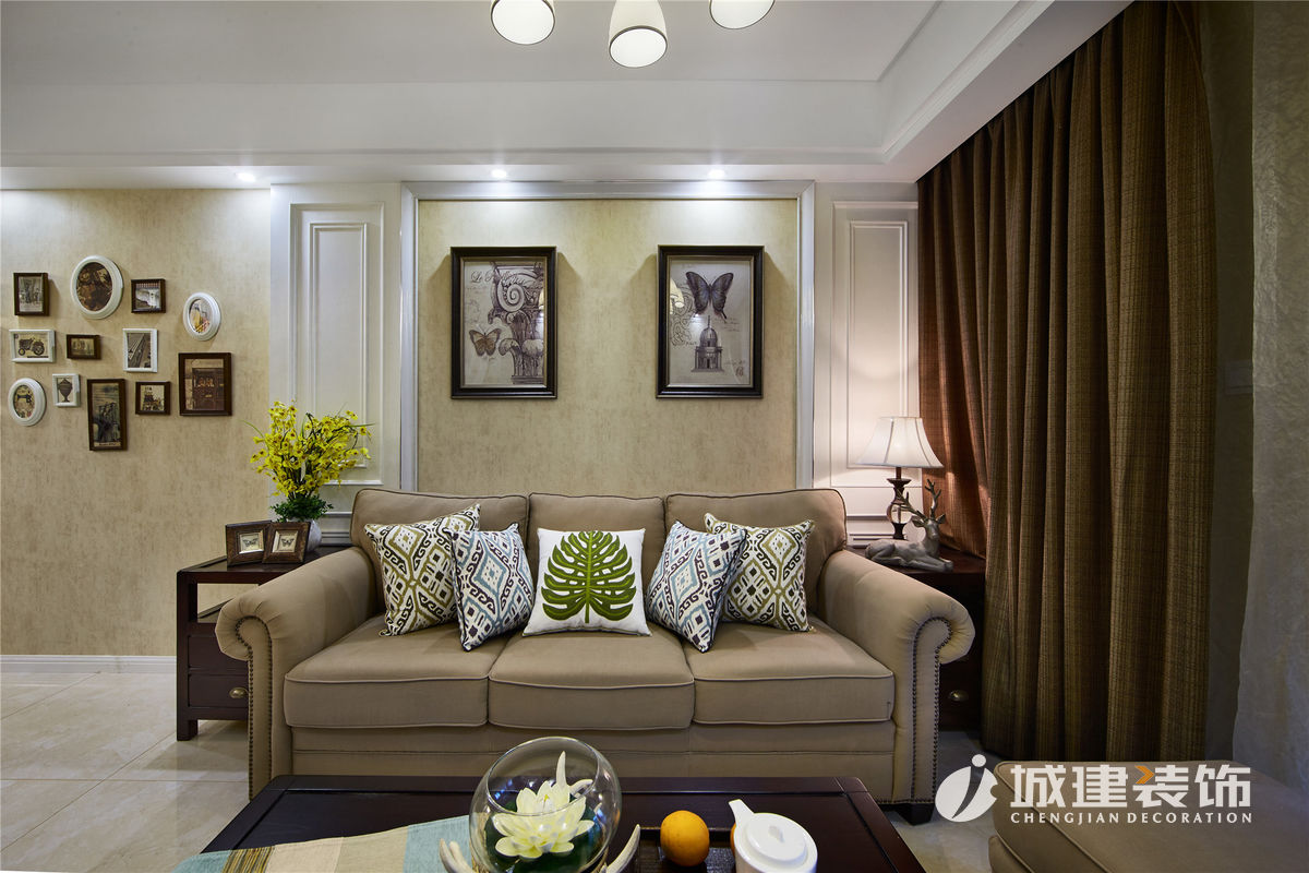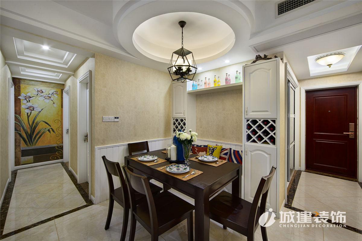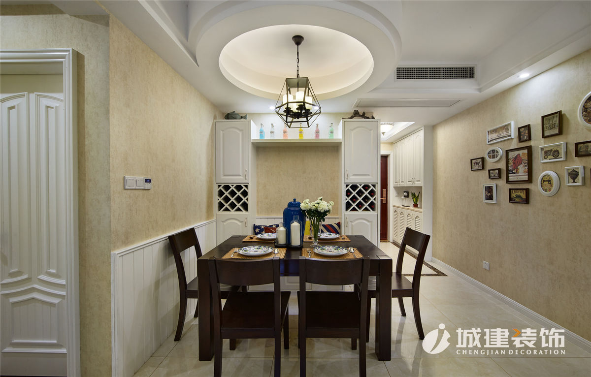 本案采用簡(jiǎn)美風(fēng)格,客廳處配以布藝沙發(fā),深木色茶機(jī)電視柜,美式壁紙搭配木飾線條鏡框組成唯美的電視背影墻,餐廳一隅,將卡座與儲(chǔ)物柜完美結(jié)合,圓形員頂朽上造型別致的燈具,整個(gè)客餐廳溫馨且生動(dòng),過(guò)道處照片墻也為整個(gè)空間增色不少。