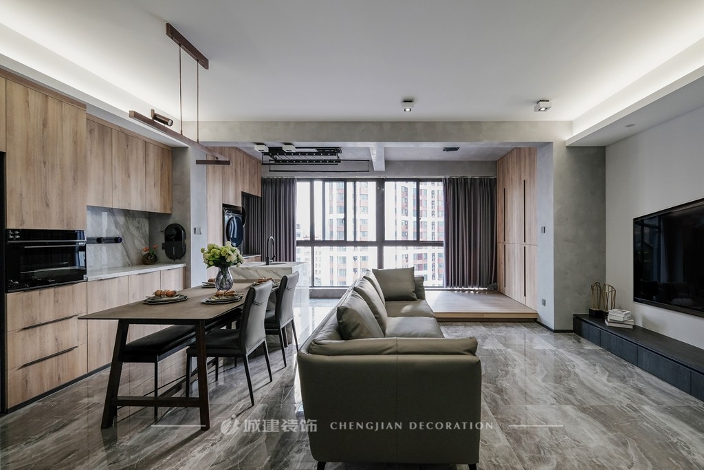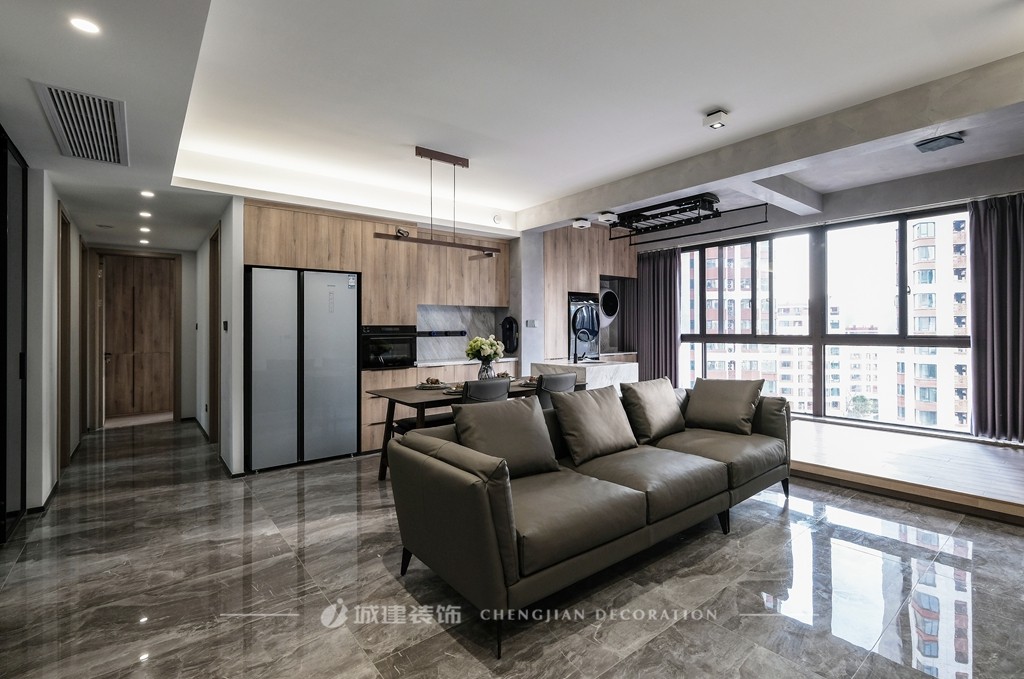 2. 客餐廳陽臺沒有封閉,讓空間更顯明亮寬敞,視覺感受更舒服;不同材質(zhì)、色彩的搭配讓空間層次感更豐富。