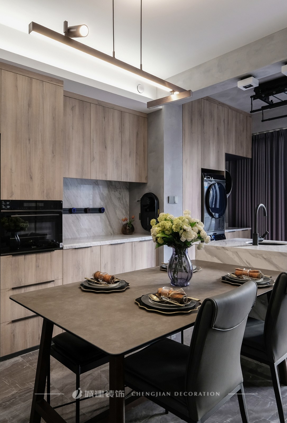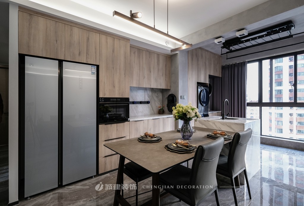將烤箱、冰箱等電器嵌入餐邊柜,西餐桌一側(cè)做了大理石水吧臺,解放廚房的空間。