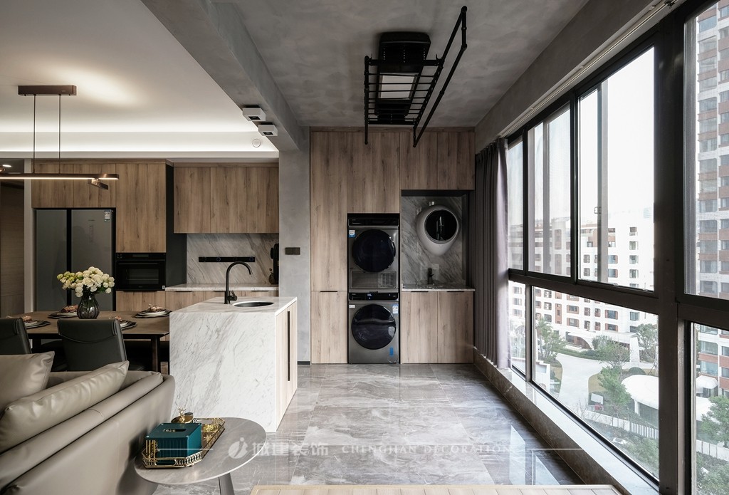 陽臺區(qū)采用水泥灰藝術(shù)涂料,讓整體空間的層次感在不同材質(zhì)、色彩交替中更顯豐富。