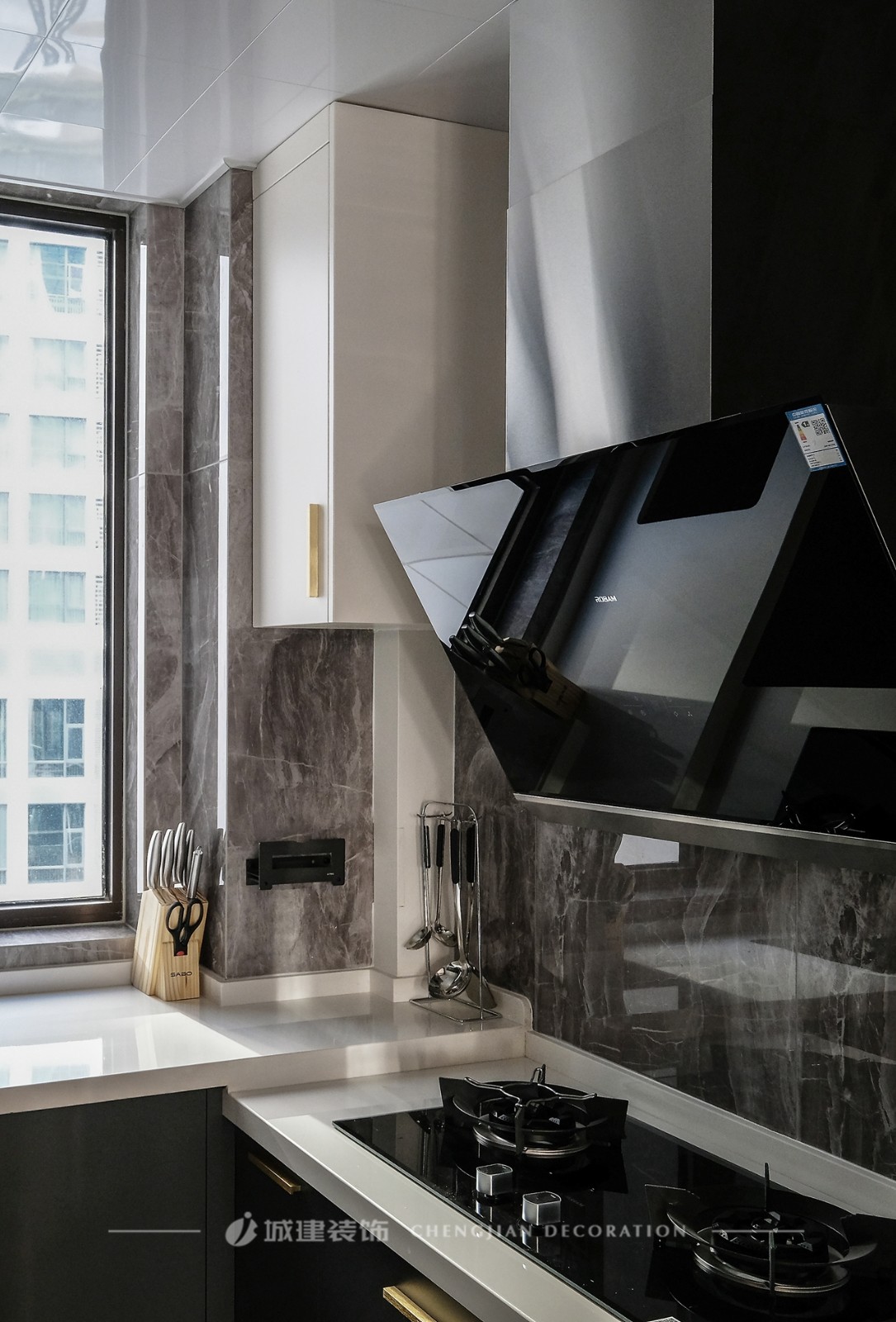 廚房選用深淺撞色櫥柜,時尚大氣,灶臺一側(cè)臺面高度下調(diào),讓業(yè)主操作起來更舒適。