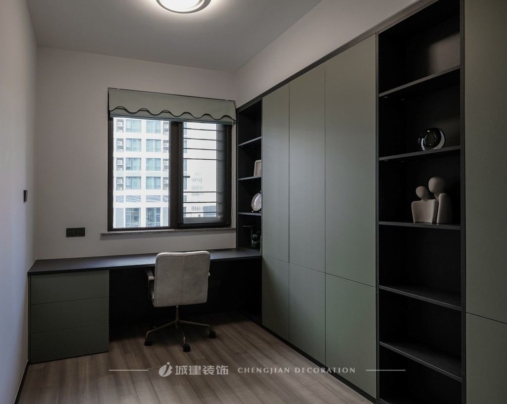 書房選用綠色的柜門,為眼睛帶來舒緩,無論是工作還是閱讀,都讓人沉浸在一個舒服放松的空間氛圍。