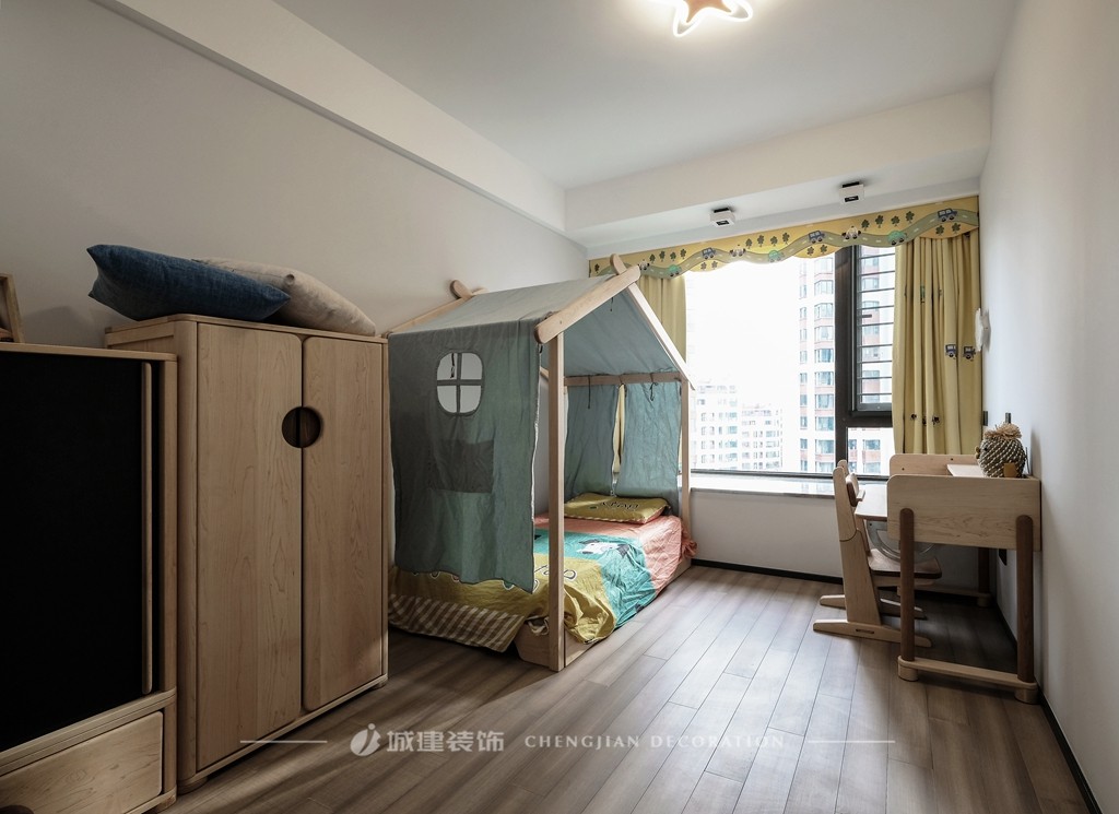 該區(qū)域一分為二,一側(cè)生活陽臺,設(shè)有洗衣柜與晾衣區(qū);一側(cè)儲物柜加地臺設(shè)計,增大儲物空間,也創(chuàng)造了孩子玩耍的空間。