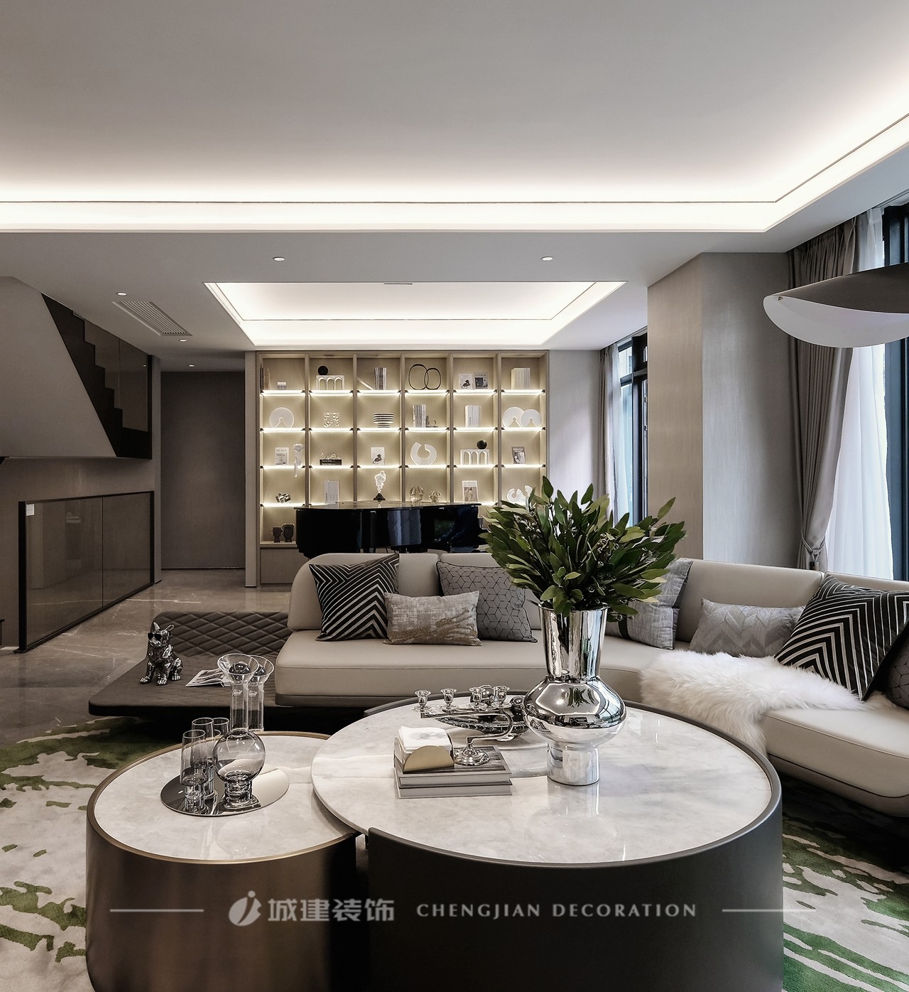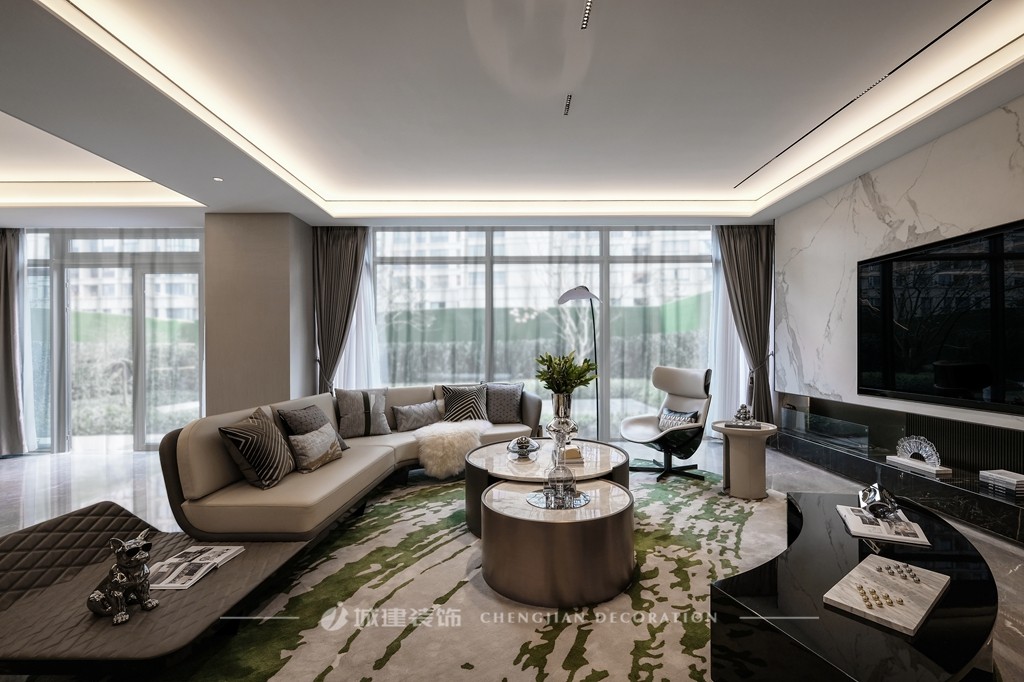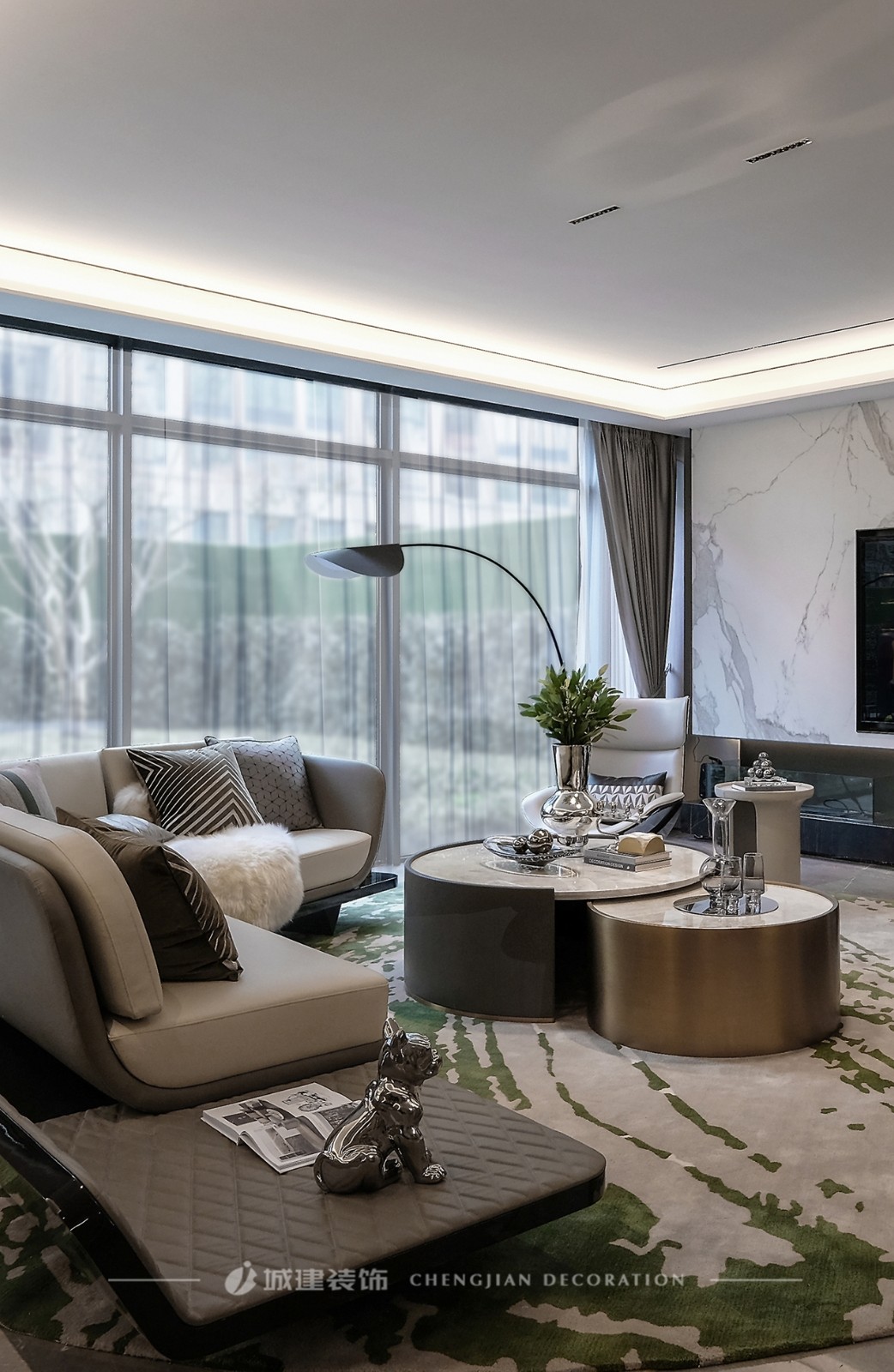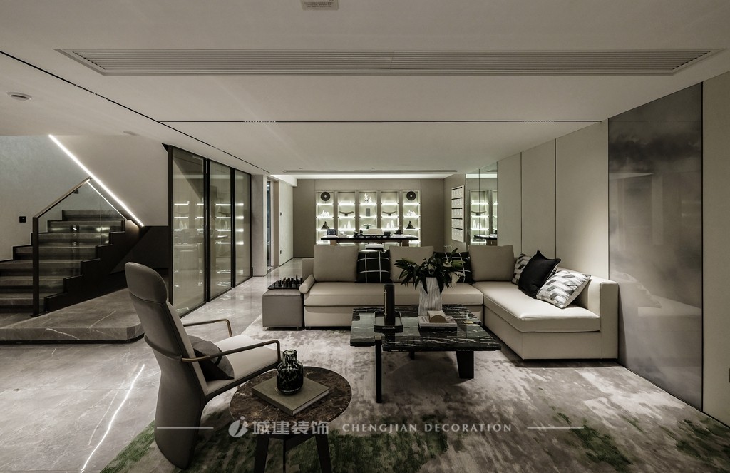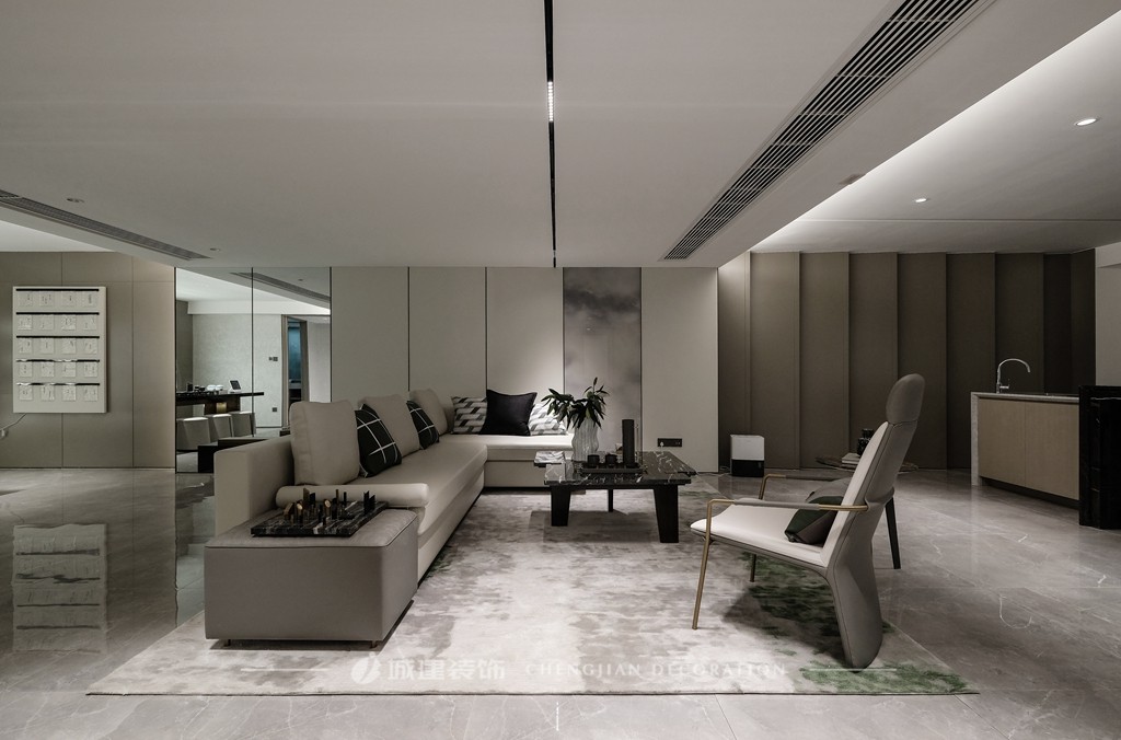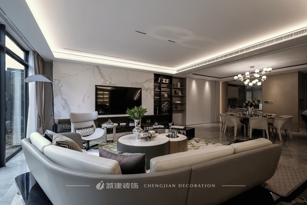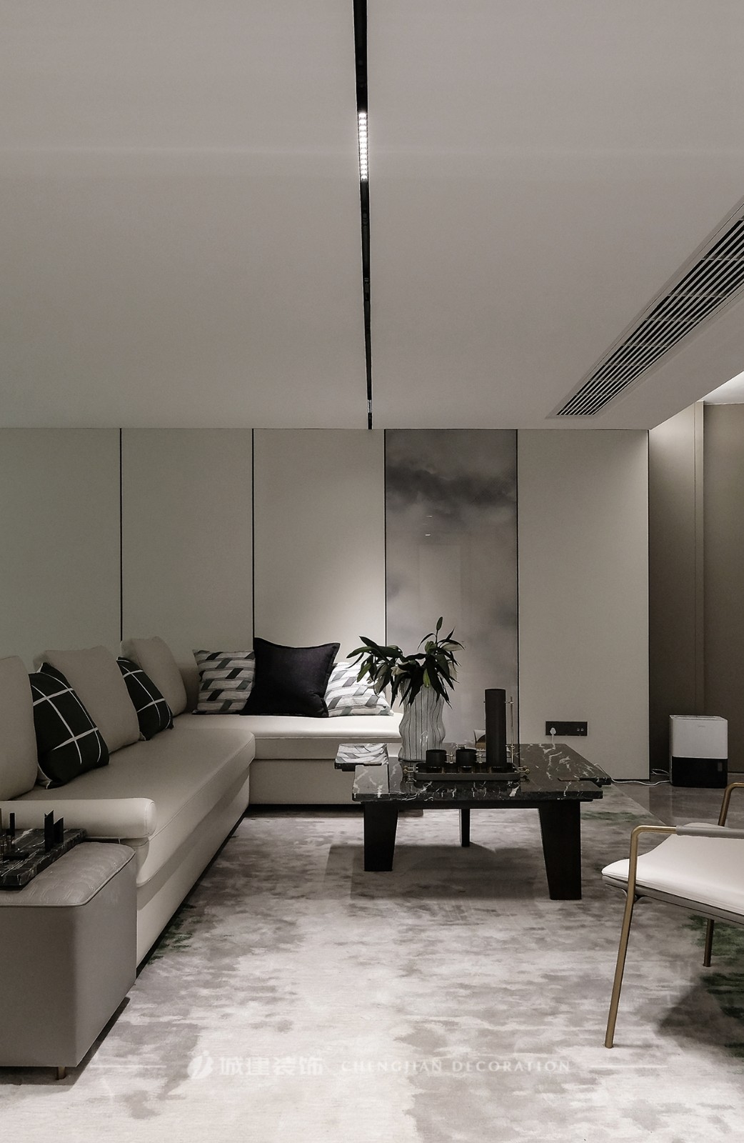 本案以簡潔的線條、純粹的色彩,予人簡潔通透、闊達包容??蛷d里線條圓潤的環(huán)抱型沙發(fā),傳遞慵懶、溫馨的生活節(jié)奏。