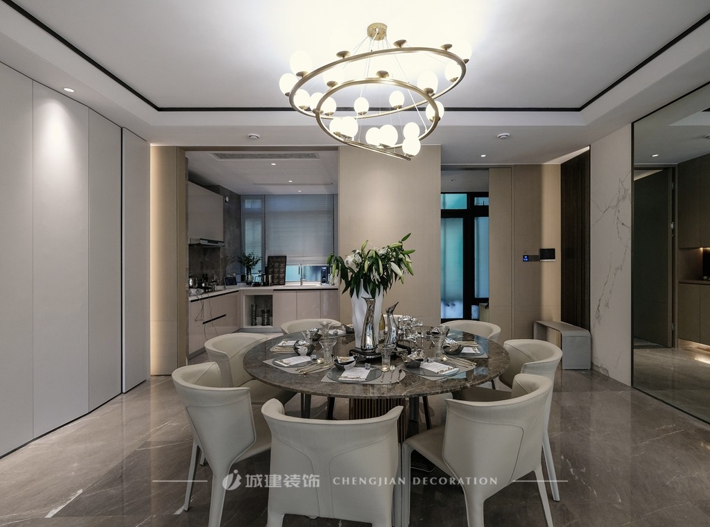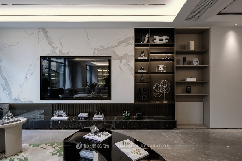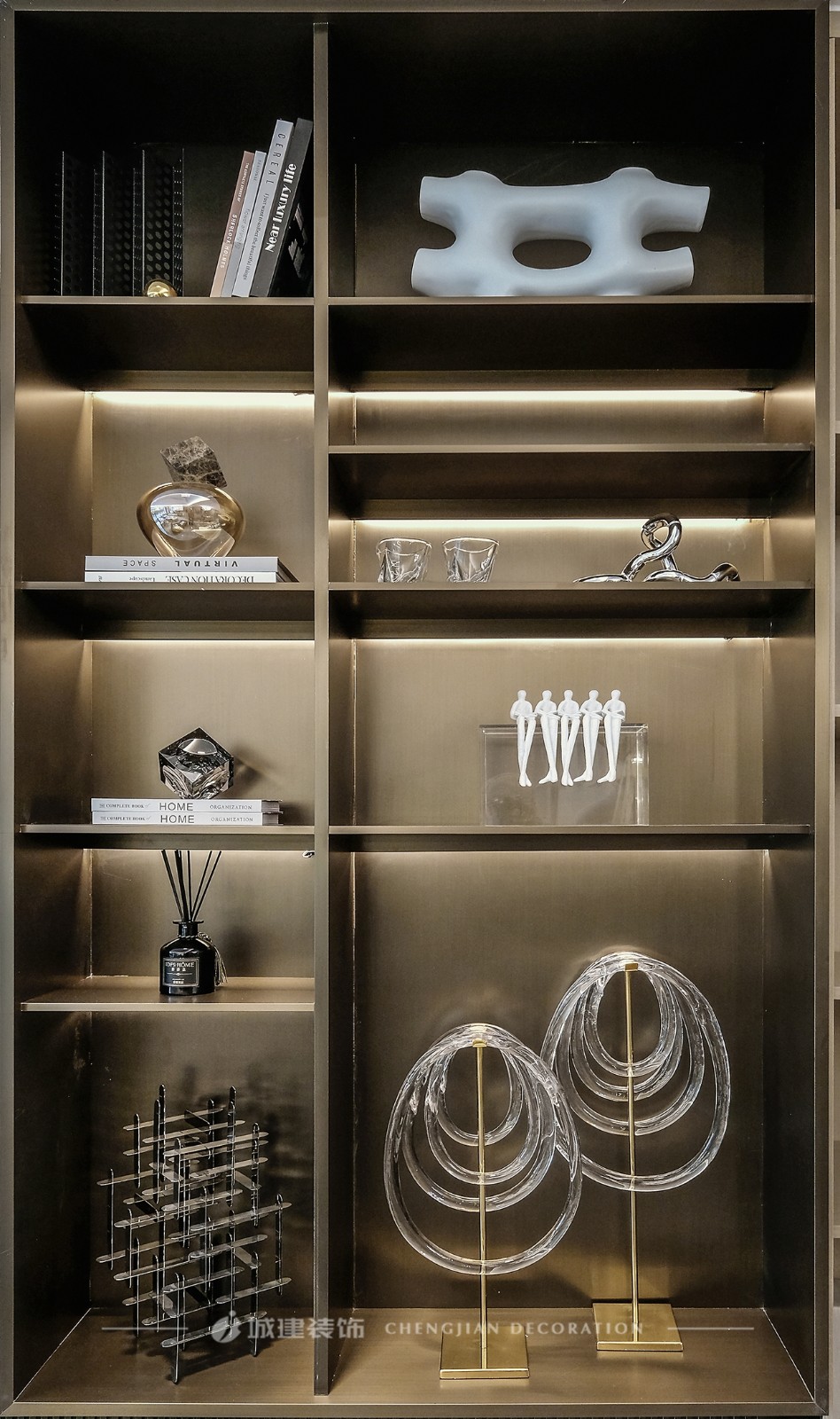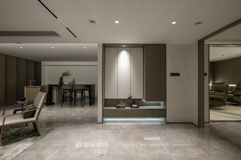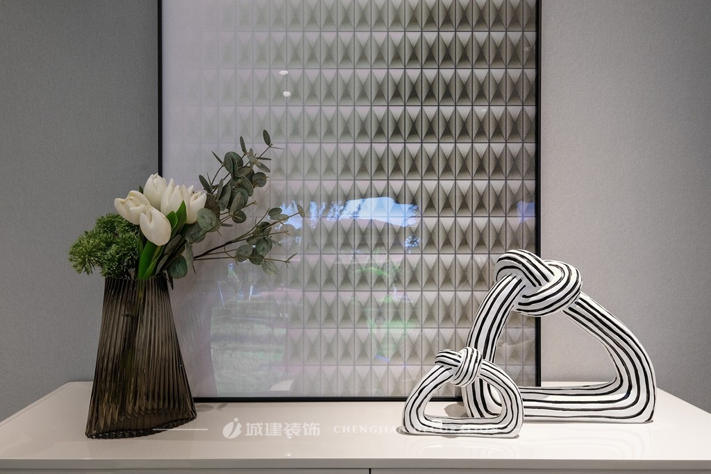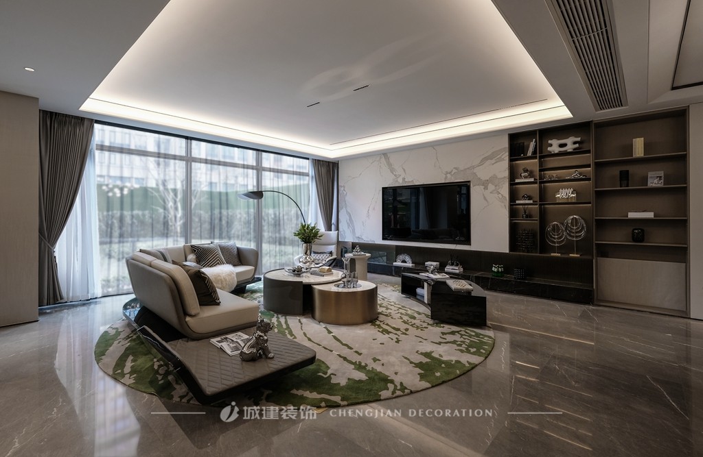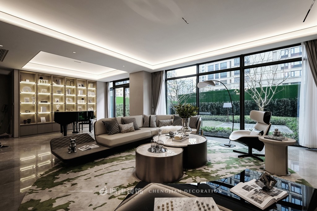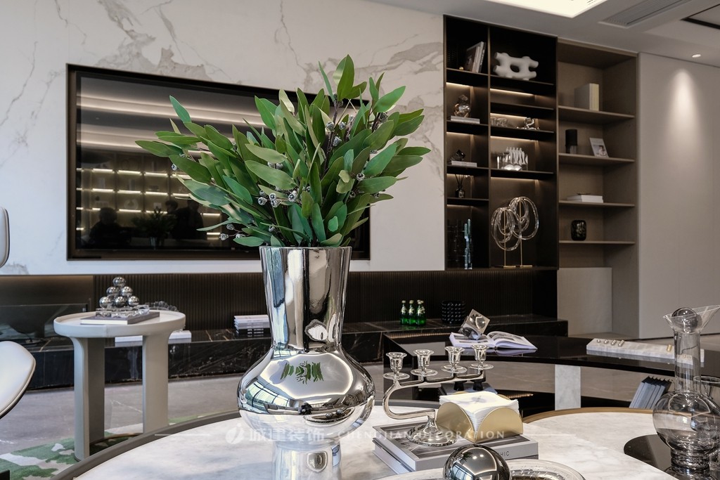本案以簡潔的線條、純粹的色彩,予人簡潔通透、闊達包容??蛷d里線條圓潤的環(huán)抱型沙發(fā),傳遞慵懶、溫馨的生活節(jié)奏。