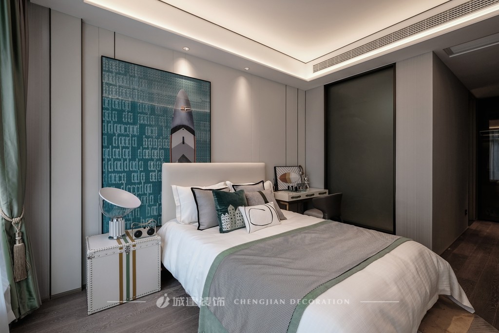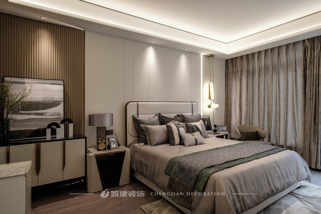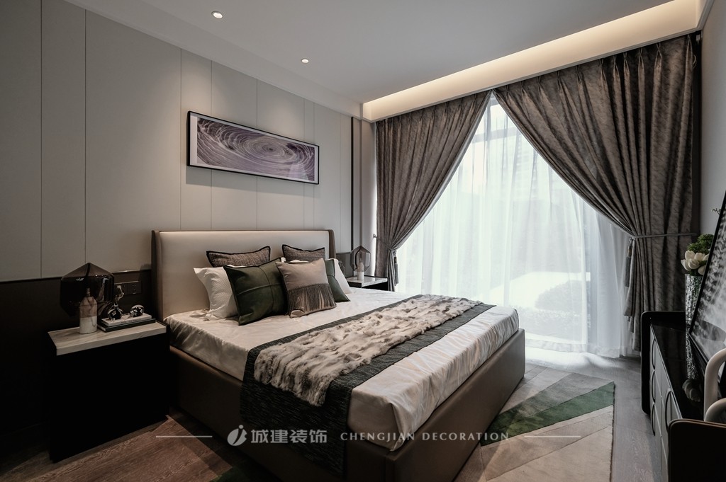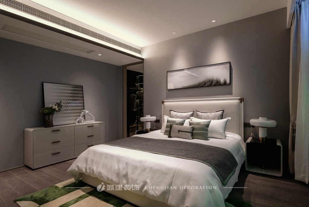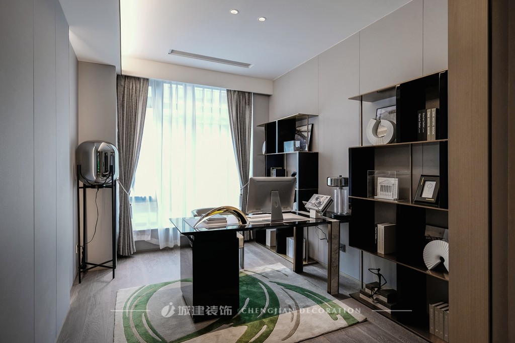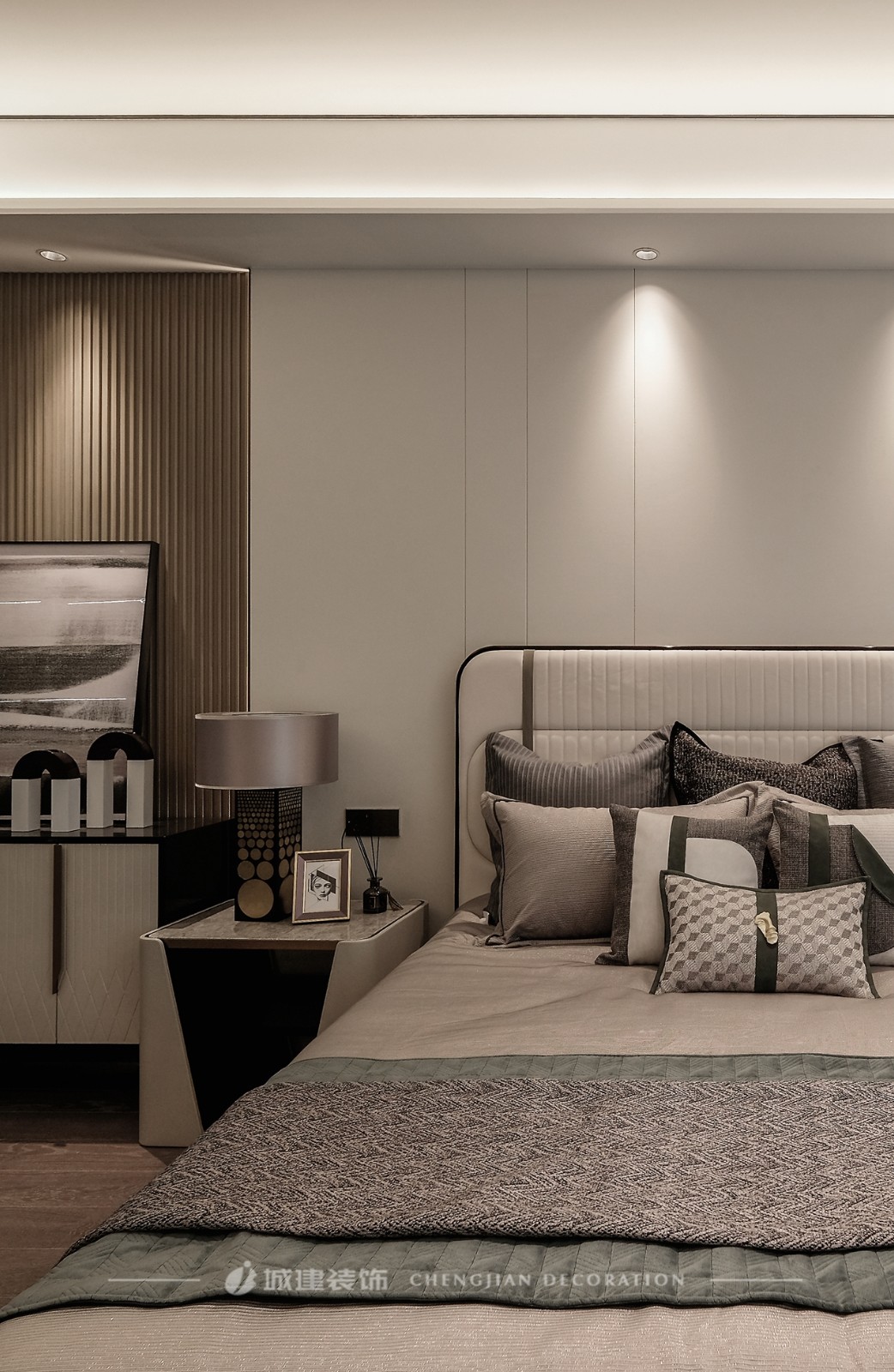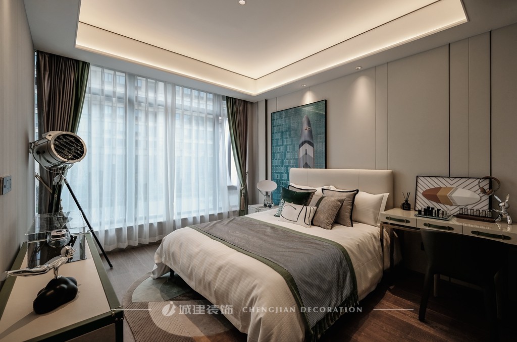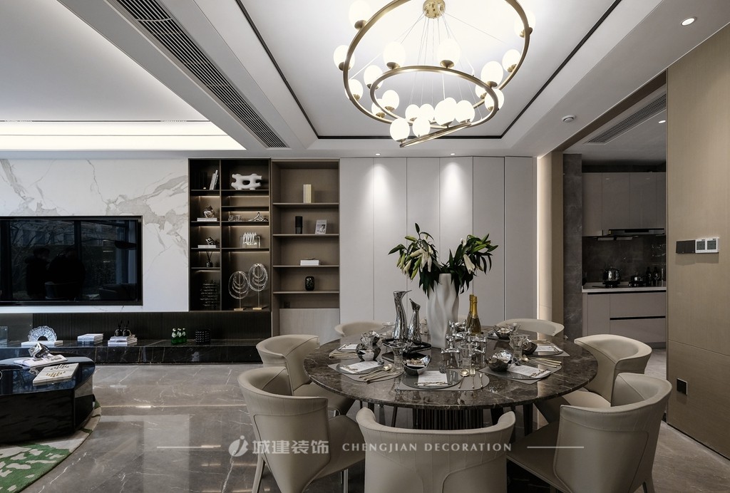 本案以簡潔的線條、純粹的色彩,予人簡潔通透、闊達包容??蛷d里線條圓潤的環(huán)抱型沙發(fā),傳遞慵懶、溫馨的生活節(jié)奏。
