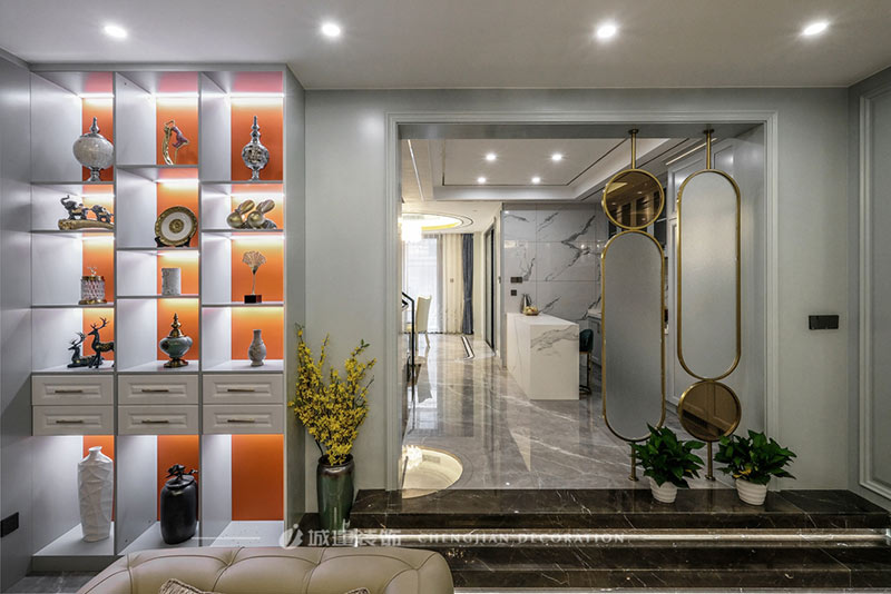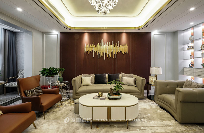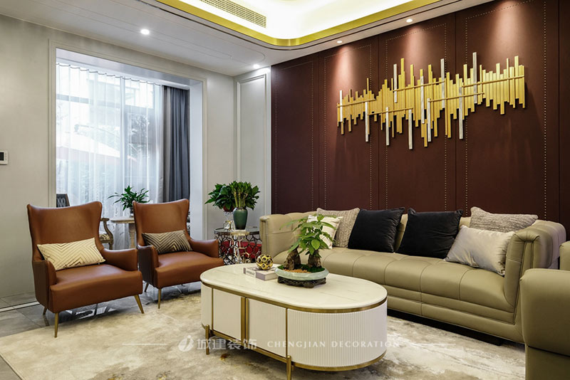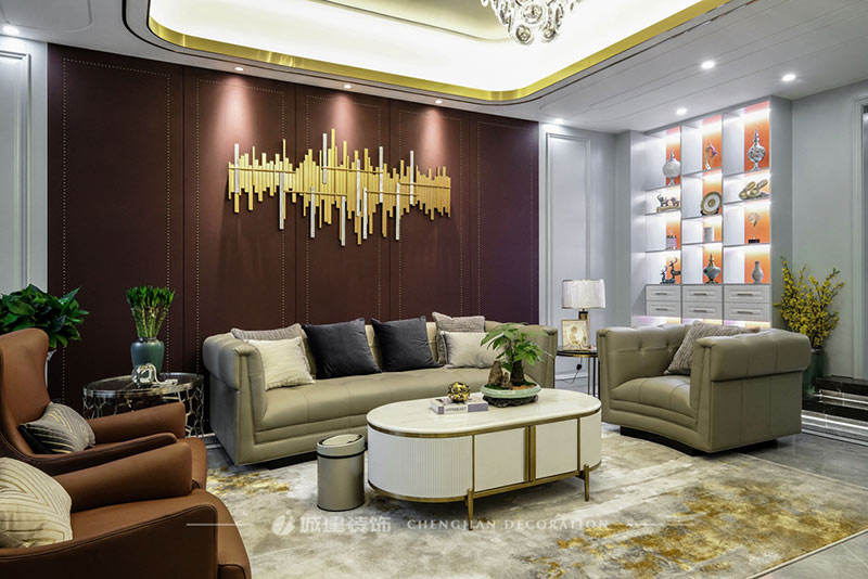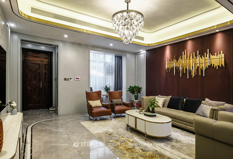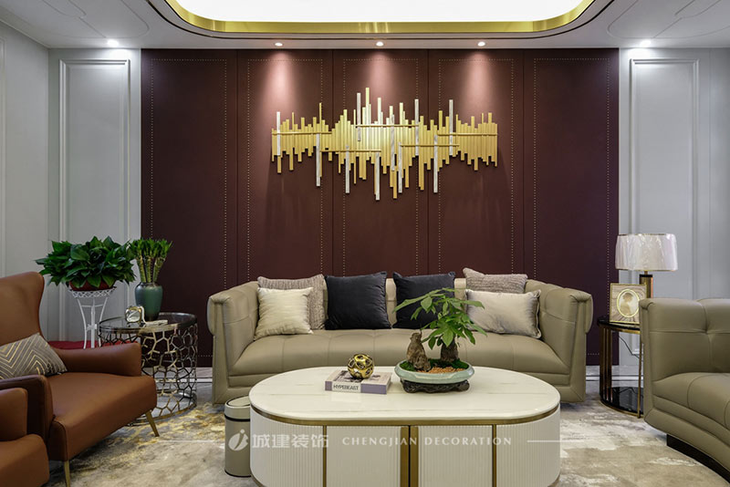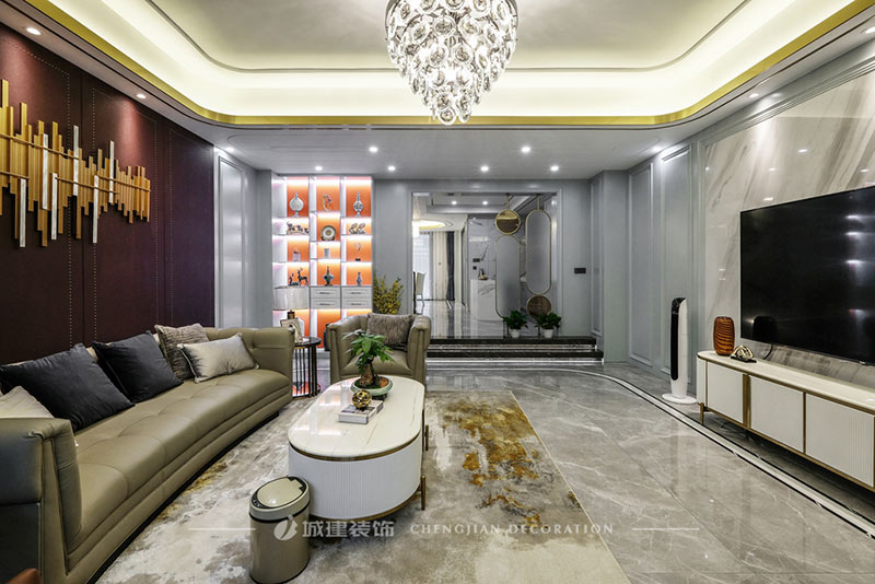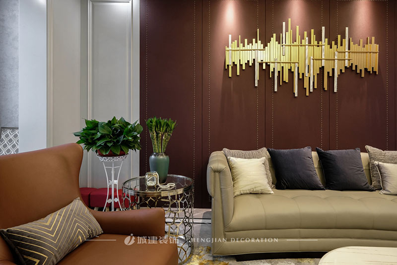 一進(jìn)門,以淺灰色為主基調(diào)的理性空間,加入了高貴優(yōu)雅的酒紅色,內(nèi)斂的奢華氣質(zhì)撲面而來;