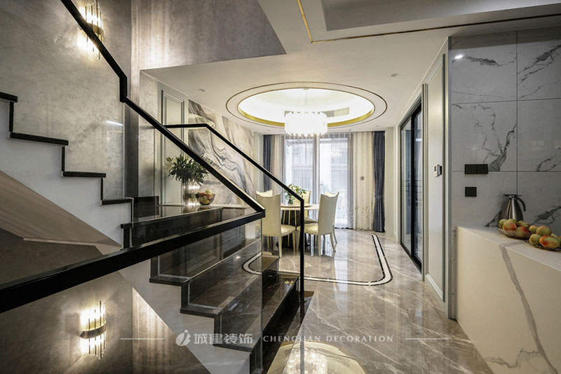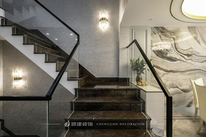 玻璃扶手簡約時(shí)尚、壁燈增添氛圍感、抽象裝飾畫裝扮墻面,走到這兒仿佛走在藝術(shù)展館的樓梯間。